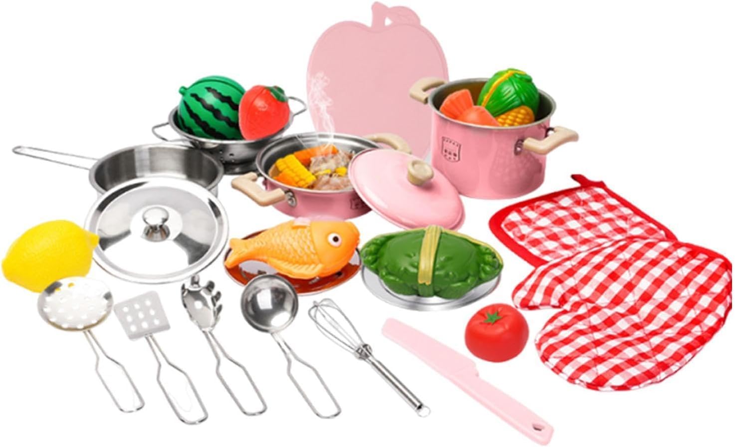 【Un bel regalo】Consigliato come regalo di compleanno o di festa per bambini di età superiore ai 3 anni 【Set di accessori per giocattoli da cucina per bambini】 Il set da 25 pezzi include una pentola a doppia parete, una fruttiera, un secchio per l'acqua calda, una padella, un piatto da caffè, un cucchiaio, un mestolo, una frittura, sbattitore per le uova, verdure e frutta simulate, ecc. 【Materiale】 utensili da cucina sono realizzati principalmente in acciaio inossidabile, resistente alla ruggine e dalla struttura robusta. Ottimi per bambini, neonati e bambini. 【Momenti preziosi 】Trasforma il gioco interattivo in apprendimento precoce! Il nostro kit di cucina per bambini ti aiuta a insegnare vere abilità culinarie, creando al contempo momenti di commovente legame familiare. 【Imparare giocando】Insegna ai bambini a giocare a fare chef, insegnando loro i fondamenti della cucina. Questo set da cucina educativo offre una nuova esperienza, trasformando i bambini in della creatività culinaria.