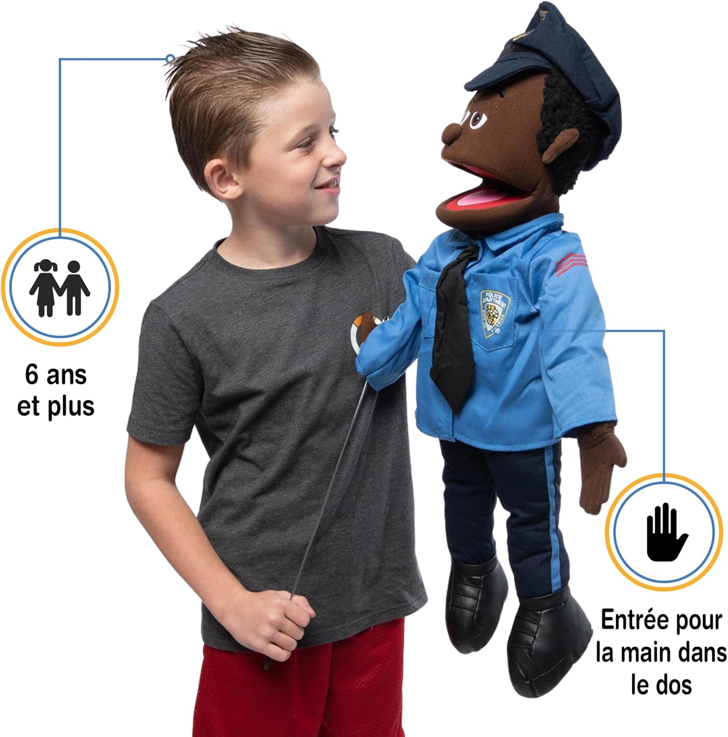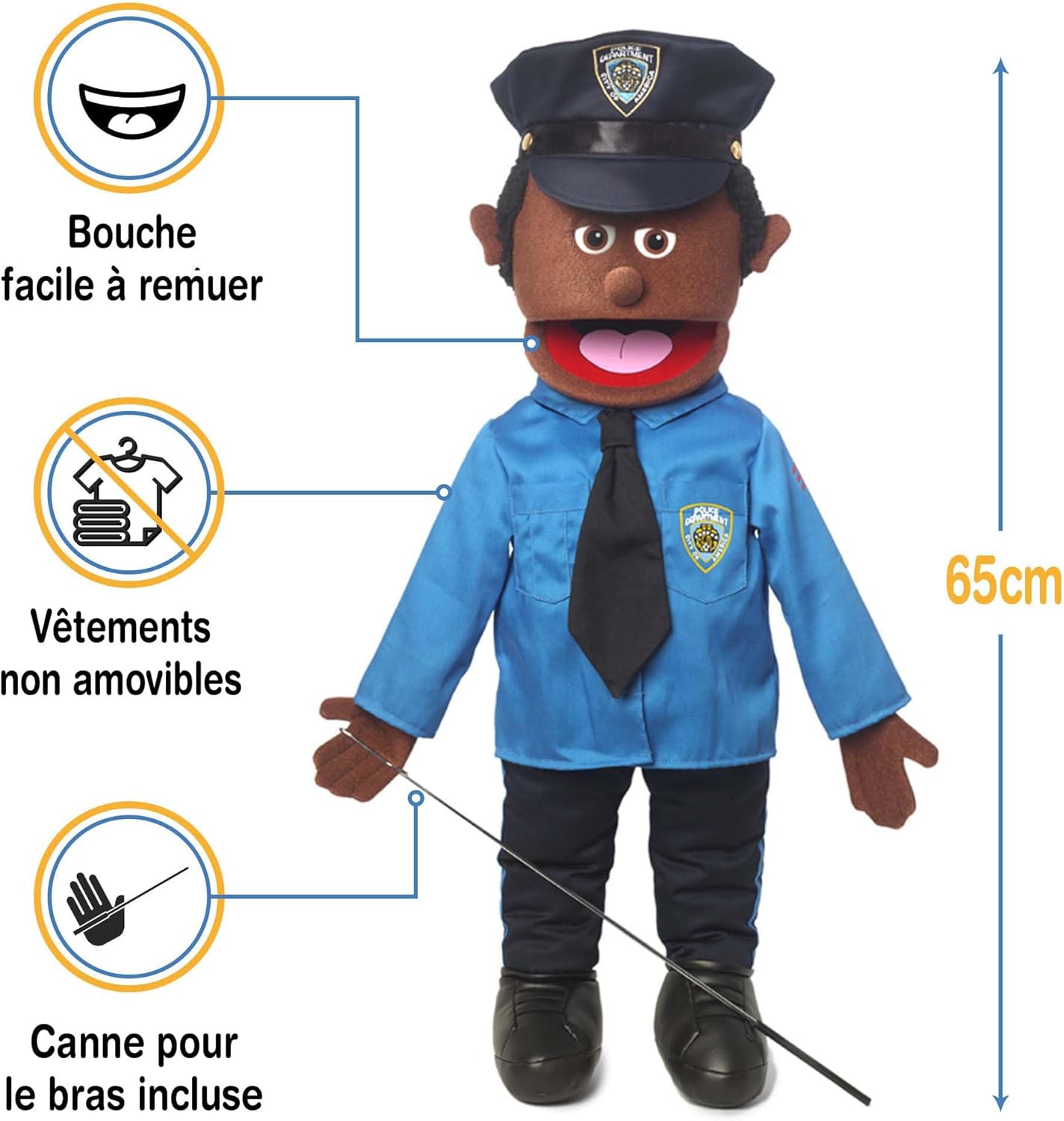 Burattino ventriloquo di alta qualità realizzato da Silly Pups. Bocca facile da muovere. Ingresso manuale dal retro del burattino. Include 1 asta di controllo del braccio che può essere agganciata a entrambe le mani per il movimento. Altezza: circa 65 cm. Peso leggero: ca. 500 g. La sua uniforme e le scarpe dal design accattivante non sono rimovibili.