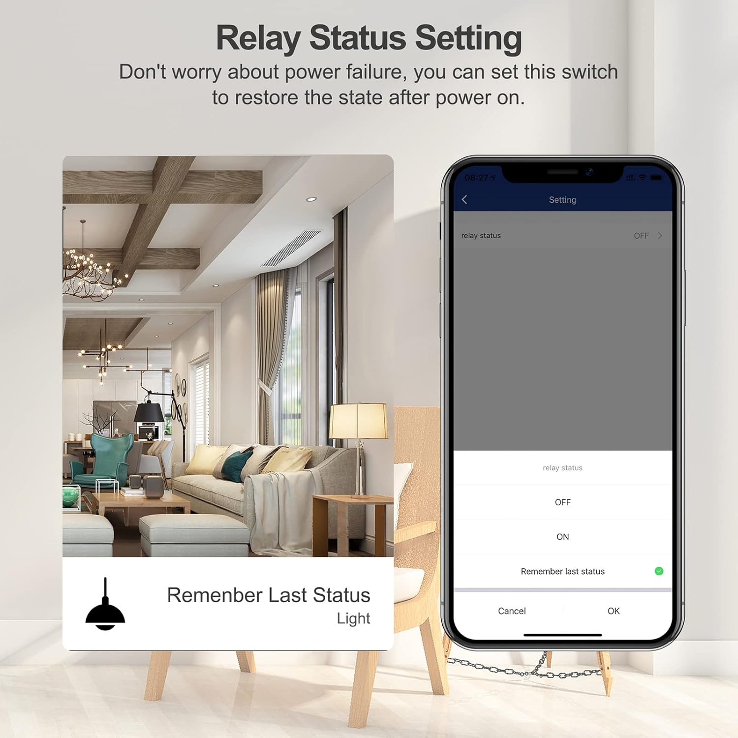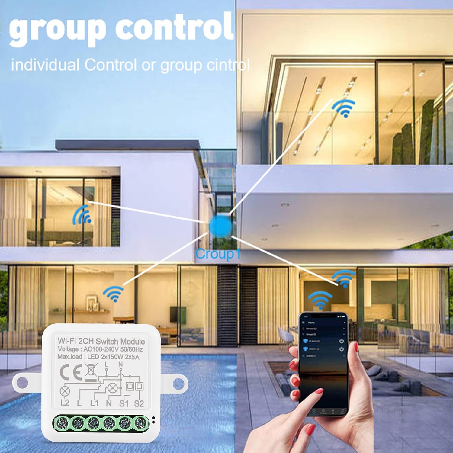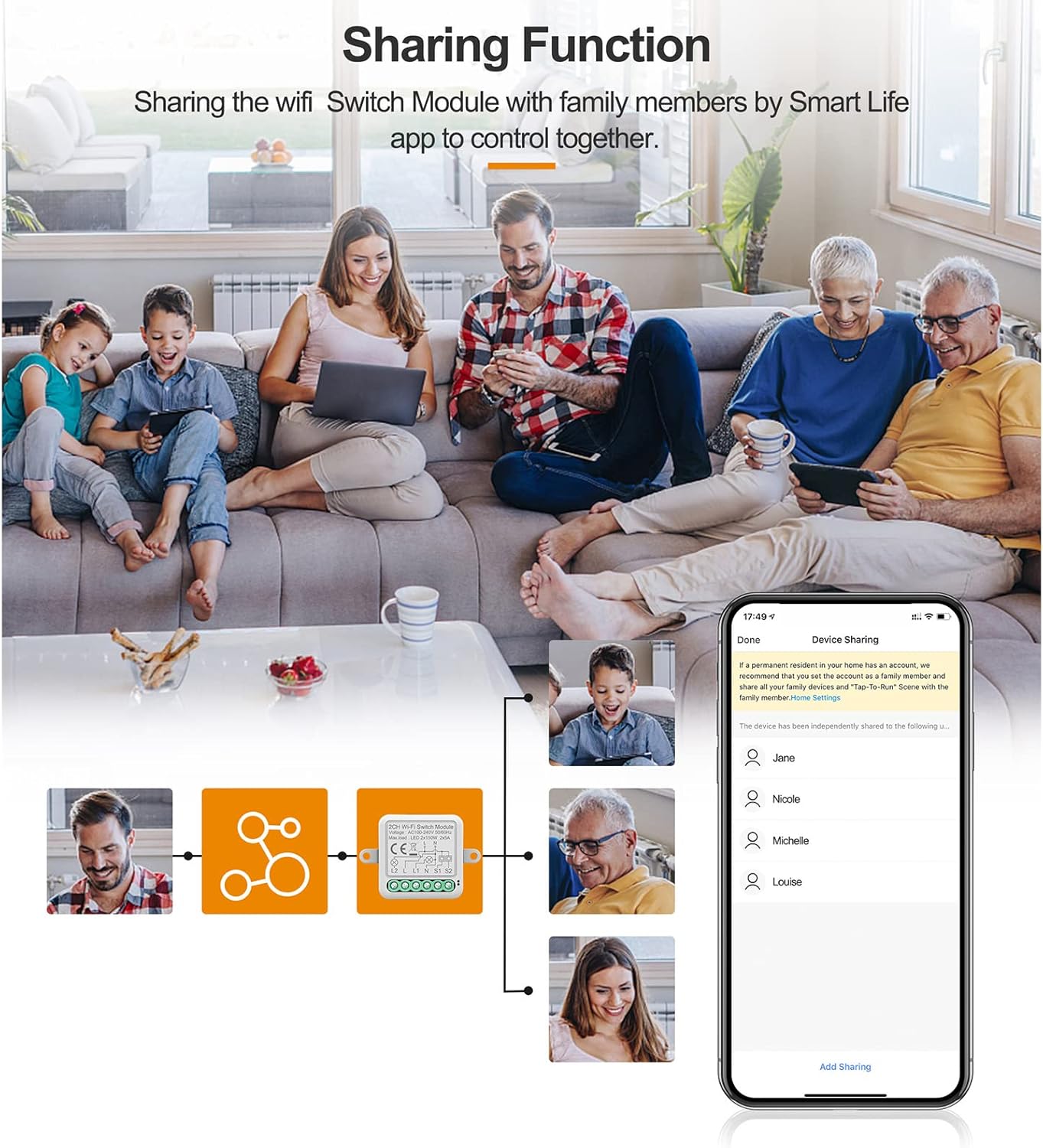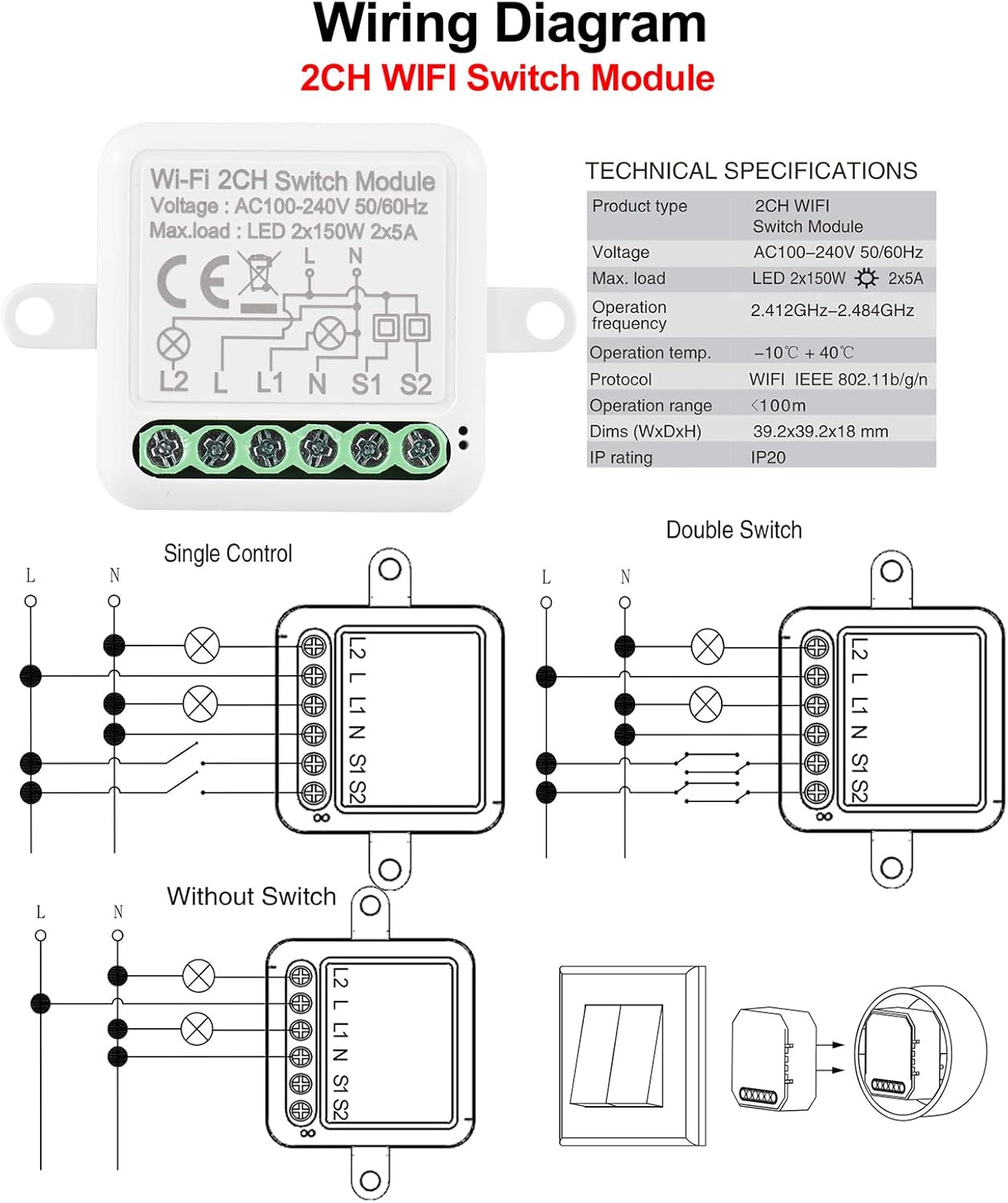 Controllo vocale altoparlante: controlla l'interruttore senza mani, compatibile con l'assistente, Tmall Genie. App Remote Control: controlla le luci da qualsiasi luogo e in qualsiasi momento tramite telefono. Impostazione dello stato del relè: non preoccuparti di FA, è possibile impostare questo interruttore per res lo stato dopo su. Piccolo e compatto: corpo piccolo adatto per varie scatole di montaggio. Condivisione ioni: condivisione del modulo interruttore WiFi con i membri della famiglia tramite Life APP per controllare insieme.