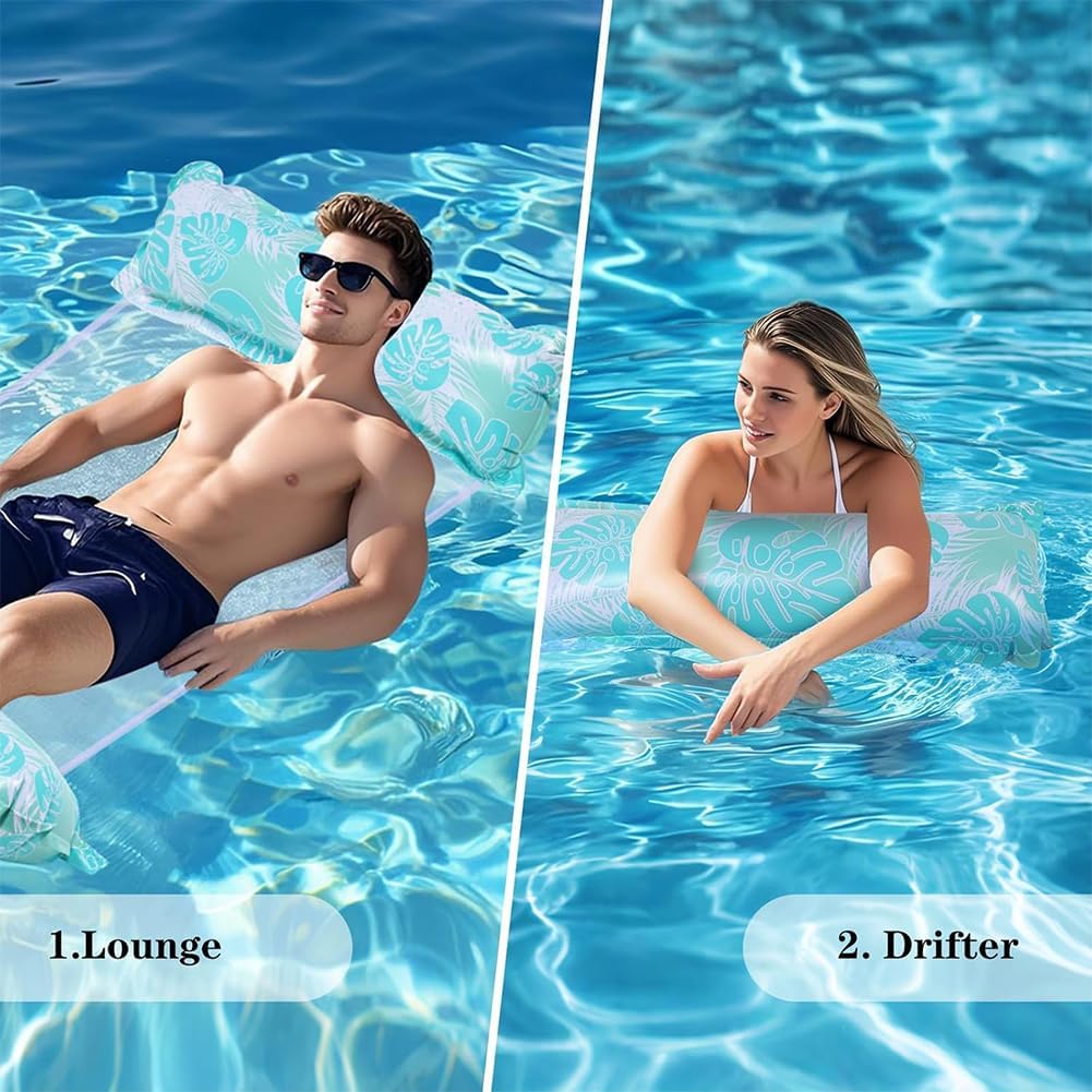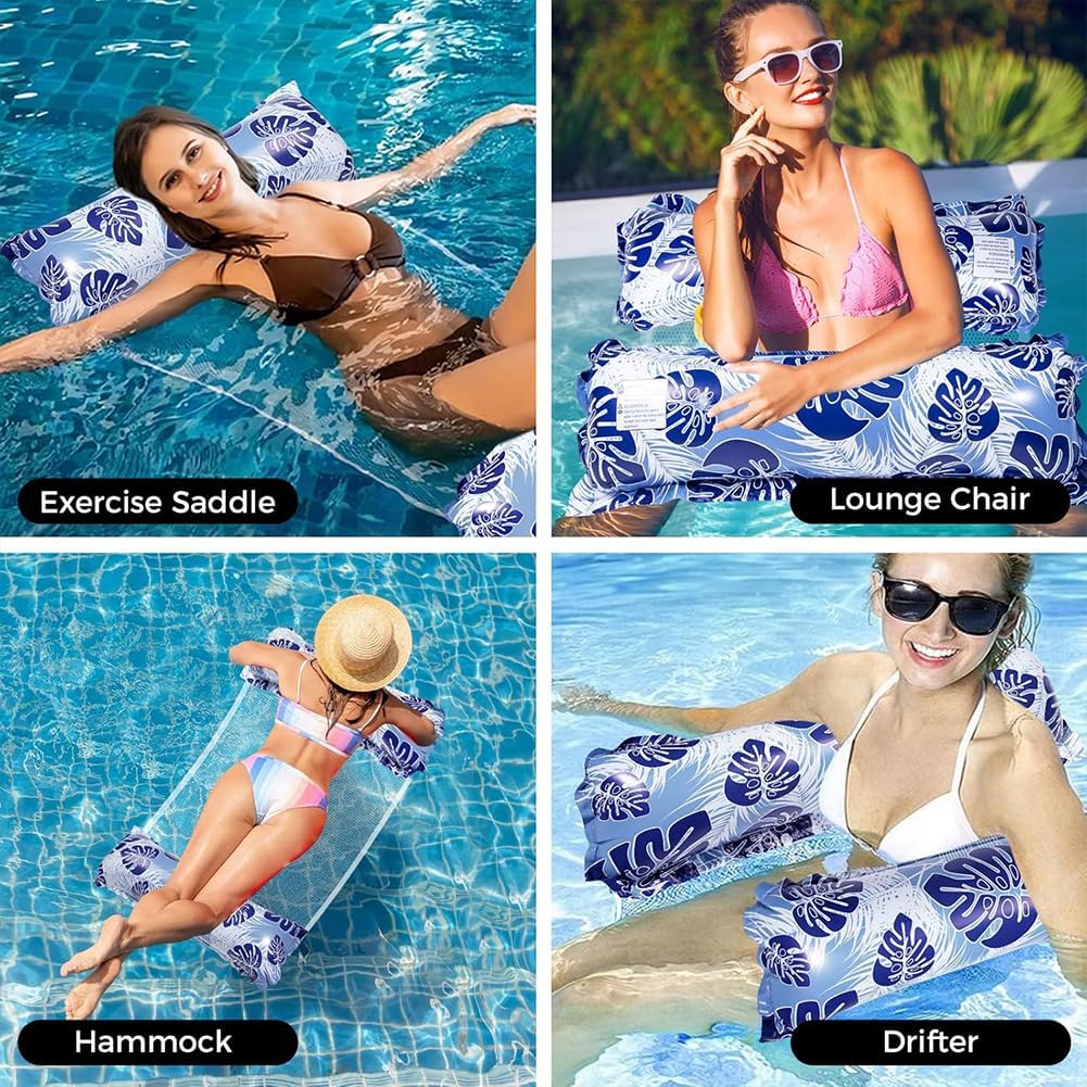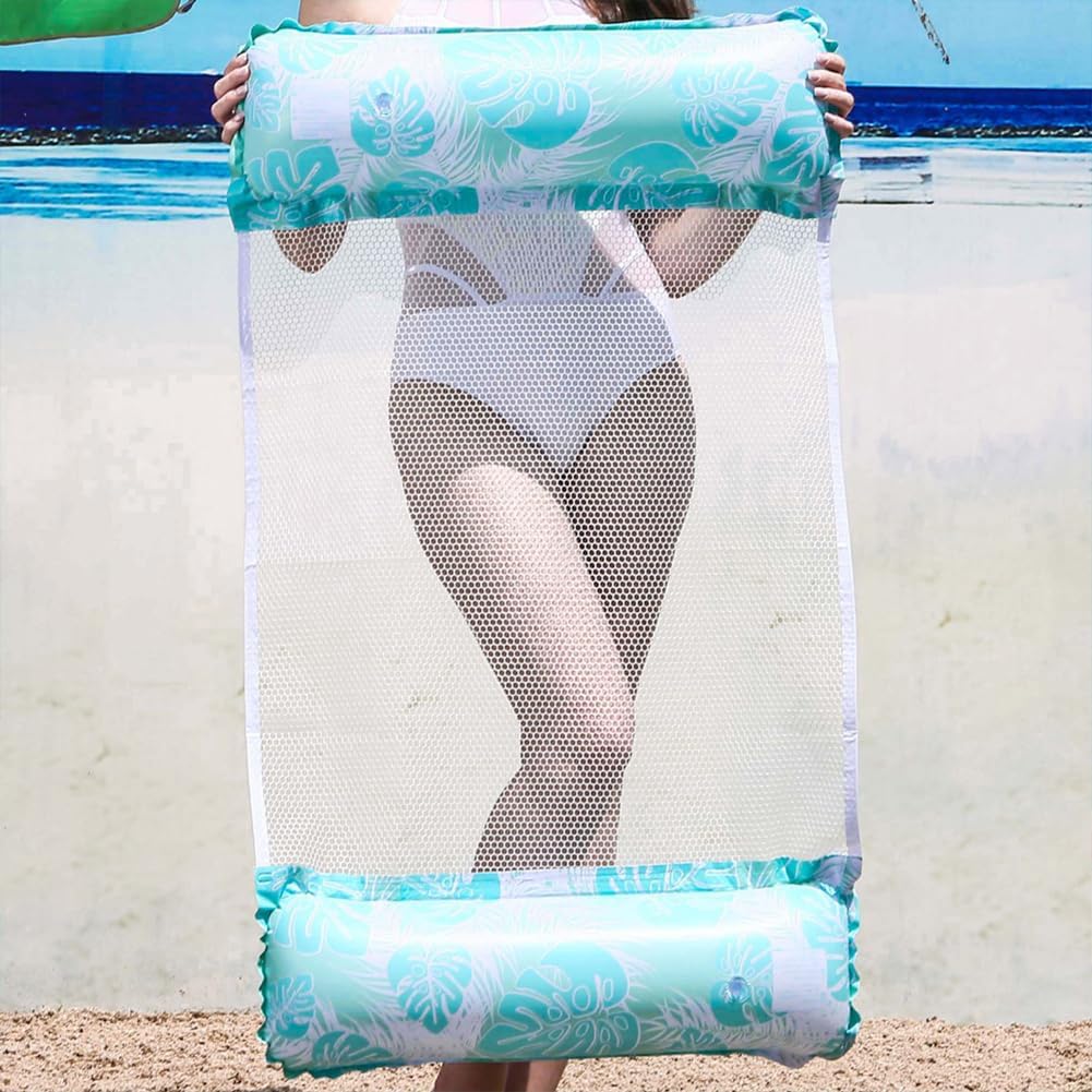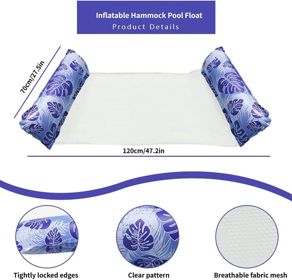 Amaca gonfiabile galleggiante: include due materassi per amaca gonfiabili. Ogni amaca è dotata di due grandi cuscini gonfiabili e di una robusta seduta in rete, in grado di sostenere comodamente un adulto sdraiato su di essa. Ogni dimensione del prodotto è di circa 120 x 70 cm. Un'amaca gonfiabile blu pesa circa 450 g. Design: la sedia da piscina gonfiabile è progettata ergonomicamente per offrire grande comfort, lo schienale gonfiabile consente di sdraiarsi comodamente, la base in rete al centro mantiene il corpo parzialmente immerso nell'acqua, rendendolo più comodo e rilassato rispetto ad altre amache acquatiche. Materiale: l'amaca gonfiabile per piscina galleggia realizzata in PVC ecologico ad alta densità, sarà un materiale più spesso della maggior parte delle amache per piscina, durevole, confortevole e di lunga durata. Può essere utilizzato ripetutamente per lungo tempo e non è facile da deformare. Motivo unico: i cuscini gonfiabili della nostra amaca galleggiante blu sono decorati con motivi a foglie. apporta un tocco di eleganza e comfort, rendendo la tua esperienza di relax sull'acqua ancora più piacevole e indimenticabile. Goditi l'estate: porta la tua famiglia e i tuoi amici a sdraiarsi o sedersi in acqua in una calda giornata estiva, sdraiarsi e prendere il sole. L'amaca gonfiabile è il regalo perfetto per giocare in acqua con il tuo partner, la tua famiglia e i tuoi amici. I bambini devono essere utilizzati sotto la supervisione di un adulto.