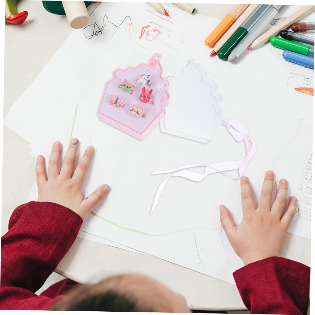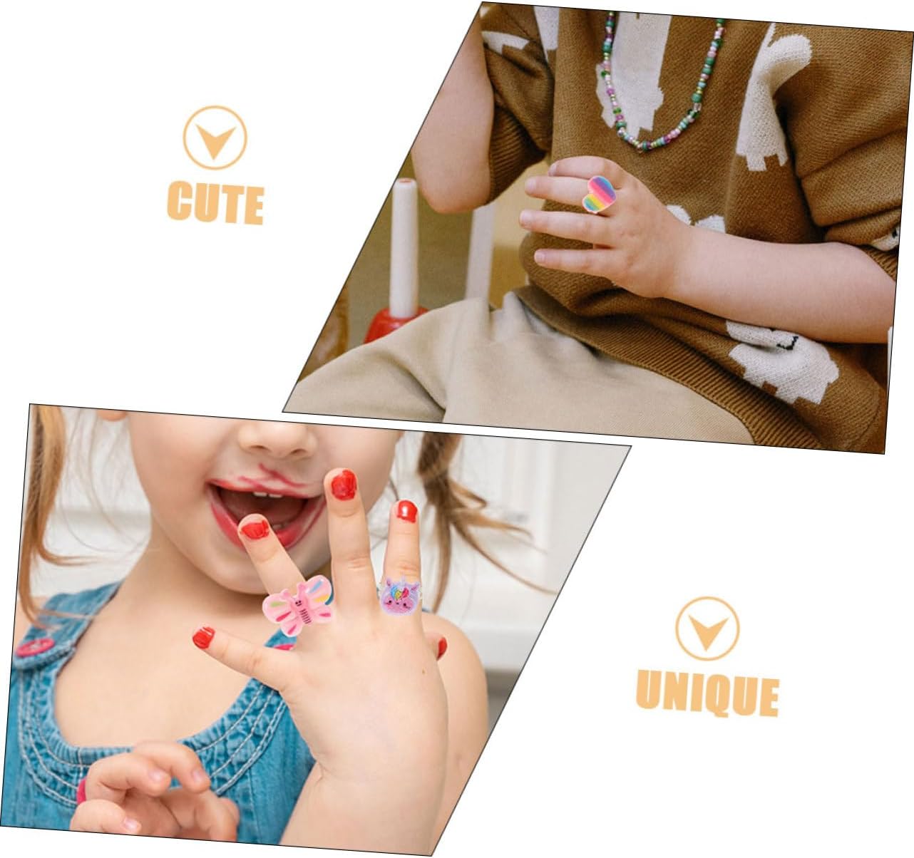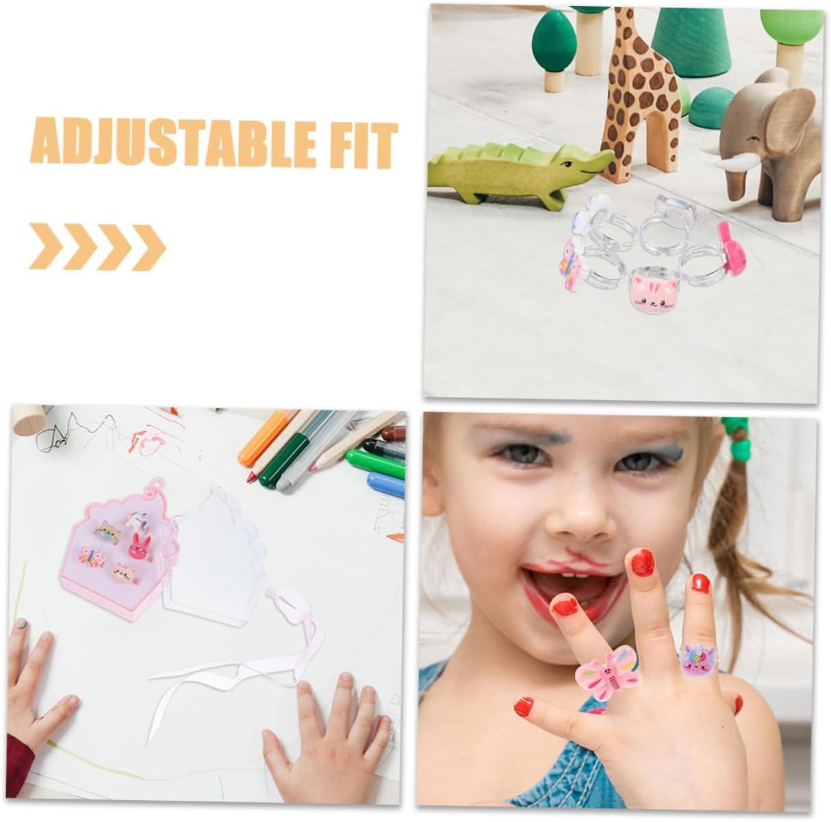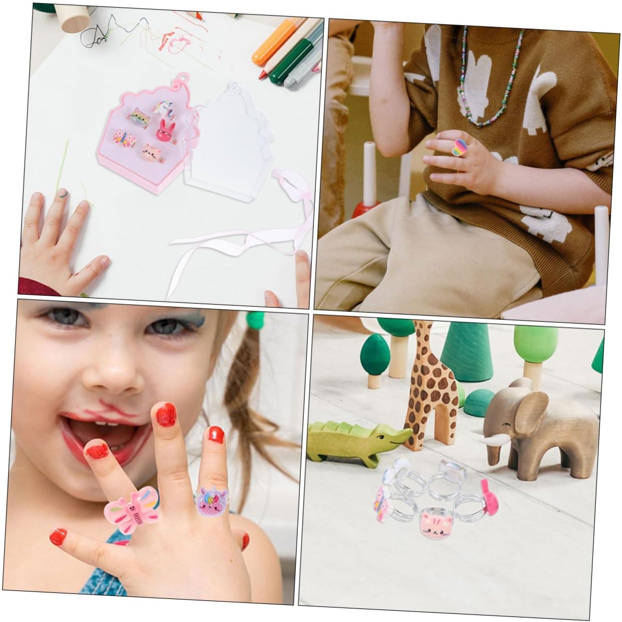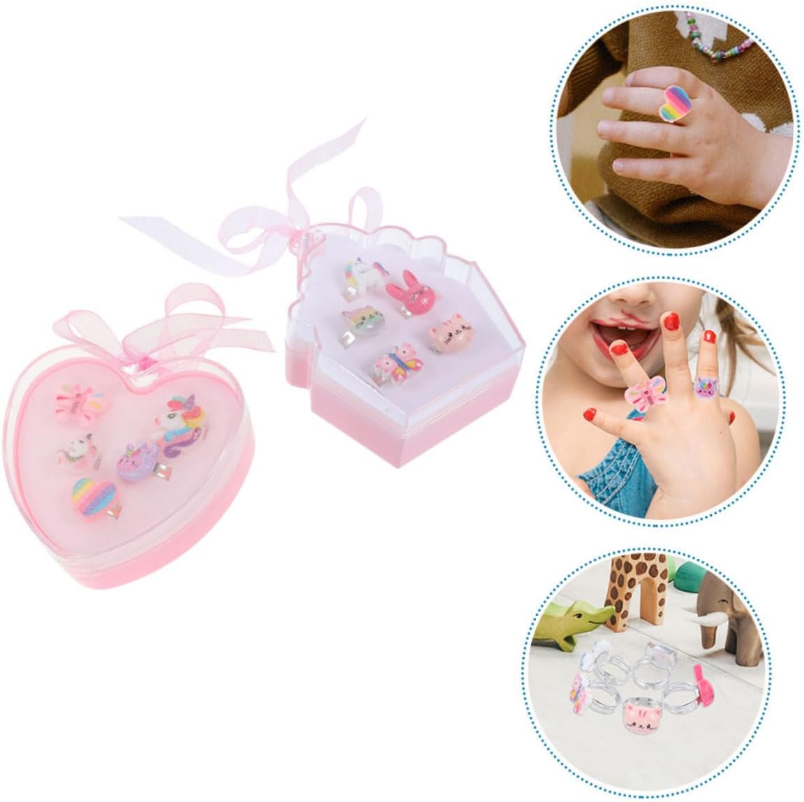 dei pacchetti 2 set di anelli per bambini Caratteristiche - : ideale per compleanni, festività o celebrazioni speciali, questo set di anelli è un premuroso e gioioso per le ragazze di tutto il mondo. Anello dei cartoni animati -Stile trendy e unico: questo accessorio eccezionale aggiunge un tocco speciale a qualsiasi outfit, aiutando le ragazze a esprimere la propria individualità e il proprio stile con graziosi anelli. - Comoda scatola portaoggetti: la confezione inclusa non solo protegge l'anello, ma ne facilita anche il trasporto, assicurando che rimanga organizzato e sicuro. Anelli alla moda -Colore: anelli misti -Materiale: anelli decorativi in plastica -Dimensioni: 8,00X8,00X2,70 cm/3,14X3,14X1,06 pollici gioielli per bambine -Dimensioni: 8,80X7,20X3,50 cm/3,46X2,83X1,38 pollici anelli giocattolo - Vestibilità adattabile a tutti: questo anello regolabile offre una vestibilità ideale per diverse dimensioni delle dita, rendendolo adatto a ragazze di tutte le età e consentendo un uso a lungo termine dei gioielli per bambini per ragazze - Design incantevole dei cartoni animati: l'adorabile design rende questo anello uno dei preferiti bambine, incoraggiando il gioco fantasioso e la creatività per i bambini. Informazioni sulle merci adorabili anelli per bambine Con il loro design accattivante e il tema delizioso, questi anelli ispirano giochi fantasiosi e narrazioni tra amiche. Le ragazze possono mostrare la loro collezione e condividere i loro pezzi preferiti tra loro, promuovendo le abilità sociali e la creatività. Anelli per bambini Questo set di anelli è davvero un'aggiunta all'assortimento di gioielli di qualsiasi bambino