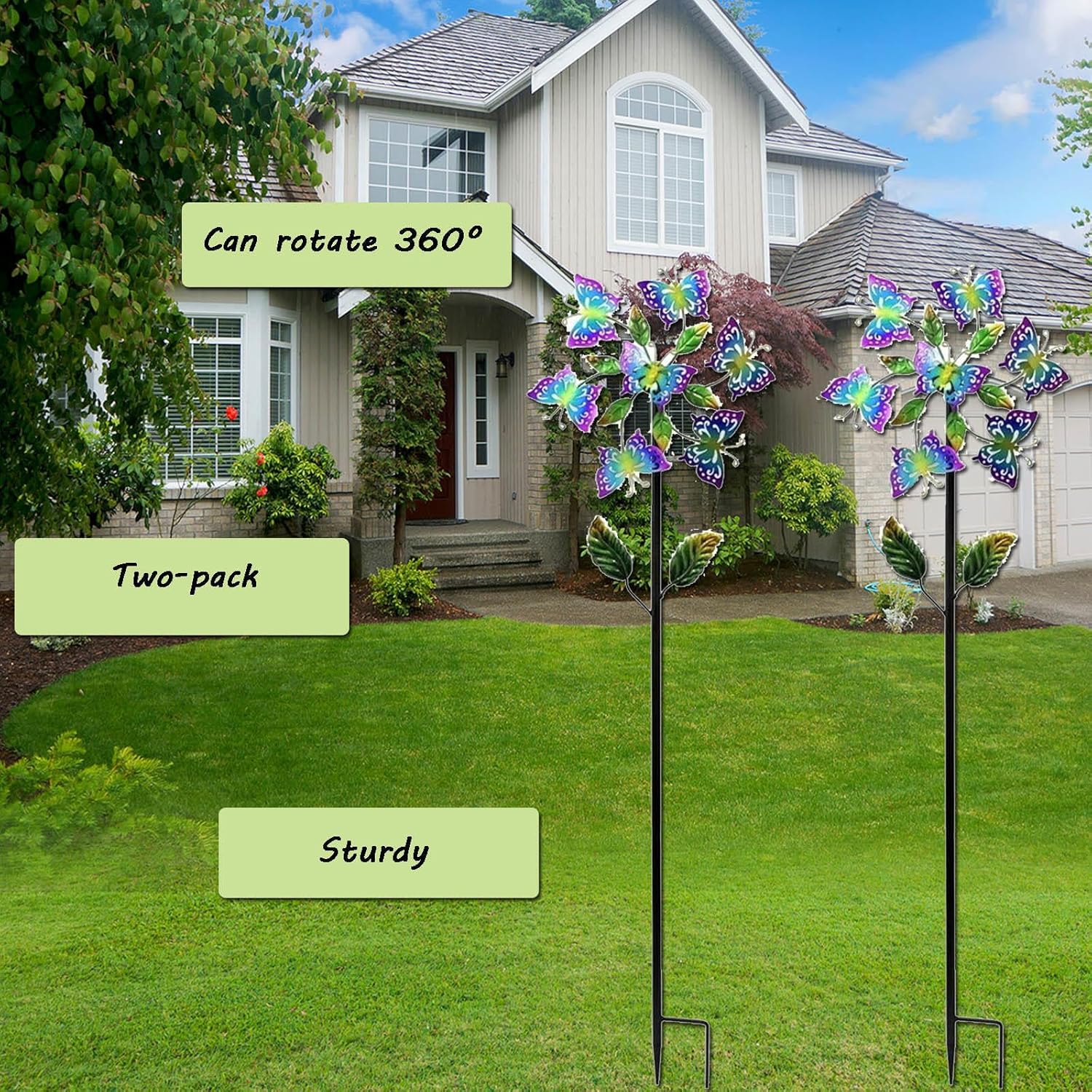 【Mulino a vento a farfalla】Questo set di 2 mulini a vento presenta un vivace motivo a farfalla che porta un fascino tropicale al tuo paesaggio, aggiungendo colori vivaci e movimento al tuo santuario del giardino. 【Resistente agli agenti atmosferici】adatto per uso esterno, la girandola può funzionare normalmente in tutti i tipi di condizioni atmosferiche con il grado di impermeabilità ip65 e resistente alle intemperie, nessuna preoccupazione per pioggia, neve, gelo o nevischio. 【Design unico】Questo accattivante mulino a vento presenta un design vivace che darà vita a qualsiasi spazio esterno, creando un'affascinante effetto di movimento. 【Installazione semplice】 I componenti delle girandole per esterni in metallo sono molto facili da installare, non sono necessari strumenti aggiuntivi, solo per stringere tutte le parti, l'intero processo ti costa solo 2-3 minuti. 【Regalo perfetto】 La girandola può essere installata in giardini, porte, campi e altro e starà benissimo in ogni situazione. È anche un ottimo regalo per la famiglia, i bambini e i bambini per la decorazione delle vacanze di Natale, varie festività e compleanni.