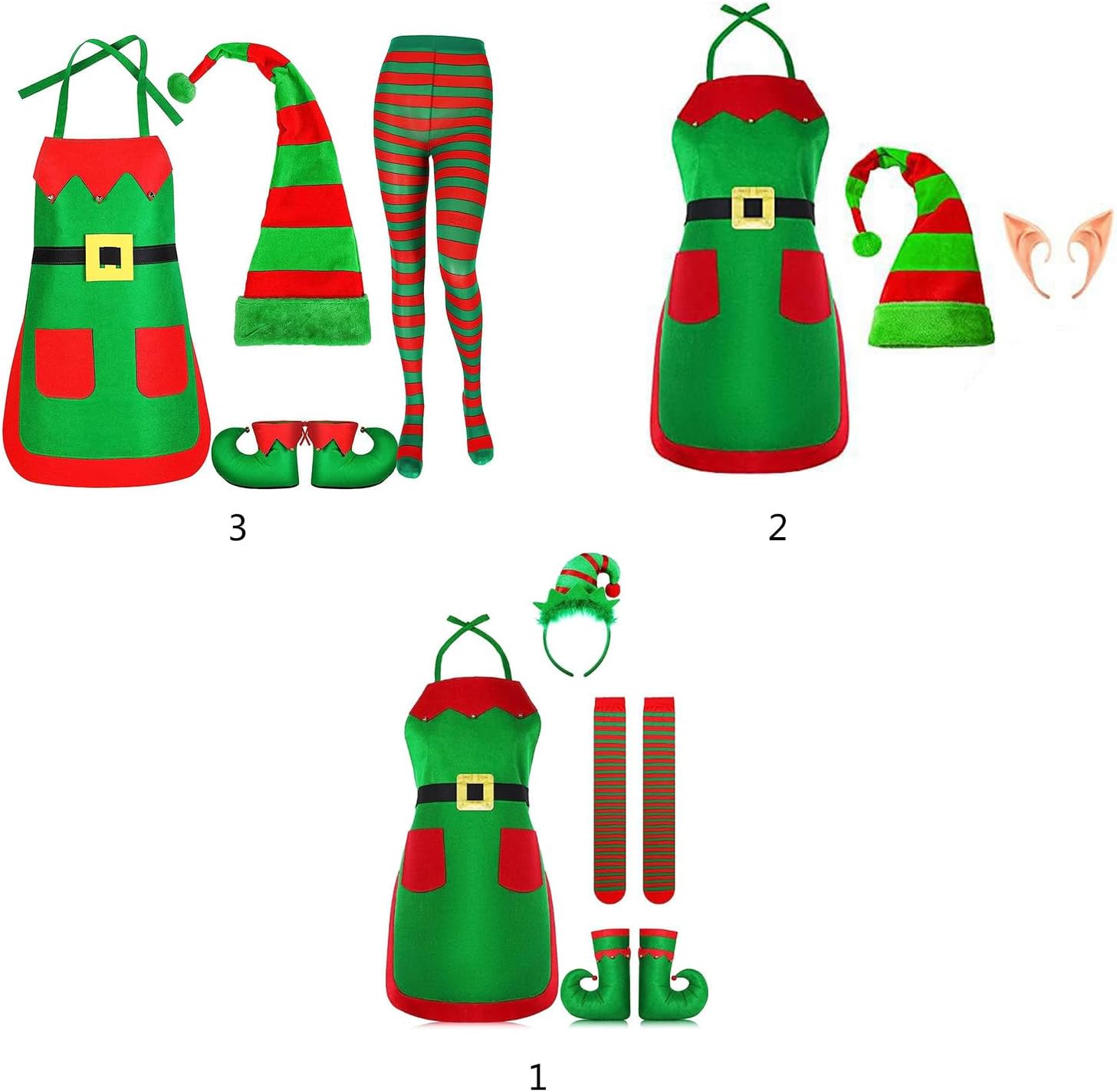 Set natalizio da donna, 1 grembiule natalizio, 1 calzino a righe sopra il ginocchio, collant a strisce, 1 paio di orecchie di Natale, cappello, fascia per capelli, grembiule da cintura. La confezione differnet include diversi, si prega di confermare le vostre esigenze prima di ordinare. Nake di spandex, comodo e morbido, caldo e robusto, non facile da rompere o sbiadire, che può servire a lungo e puoi usarli con fiducia Occasione: che può essere ampiamente applicato per feste in costume a tema, Natale, Halloween, cosplay e così via, portando un allegro alla tua casa; ed è bello per scattare foto, rendendoti accattivante e Meraviglioso, dolce e caldo per amici, familiari o per te stesso. Dimensioni adatte alla maggior parte delle persone.