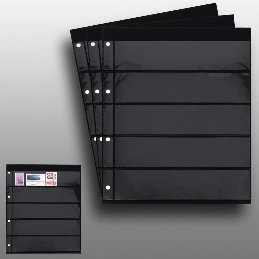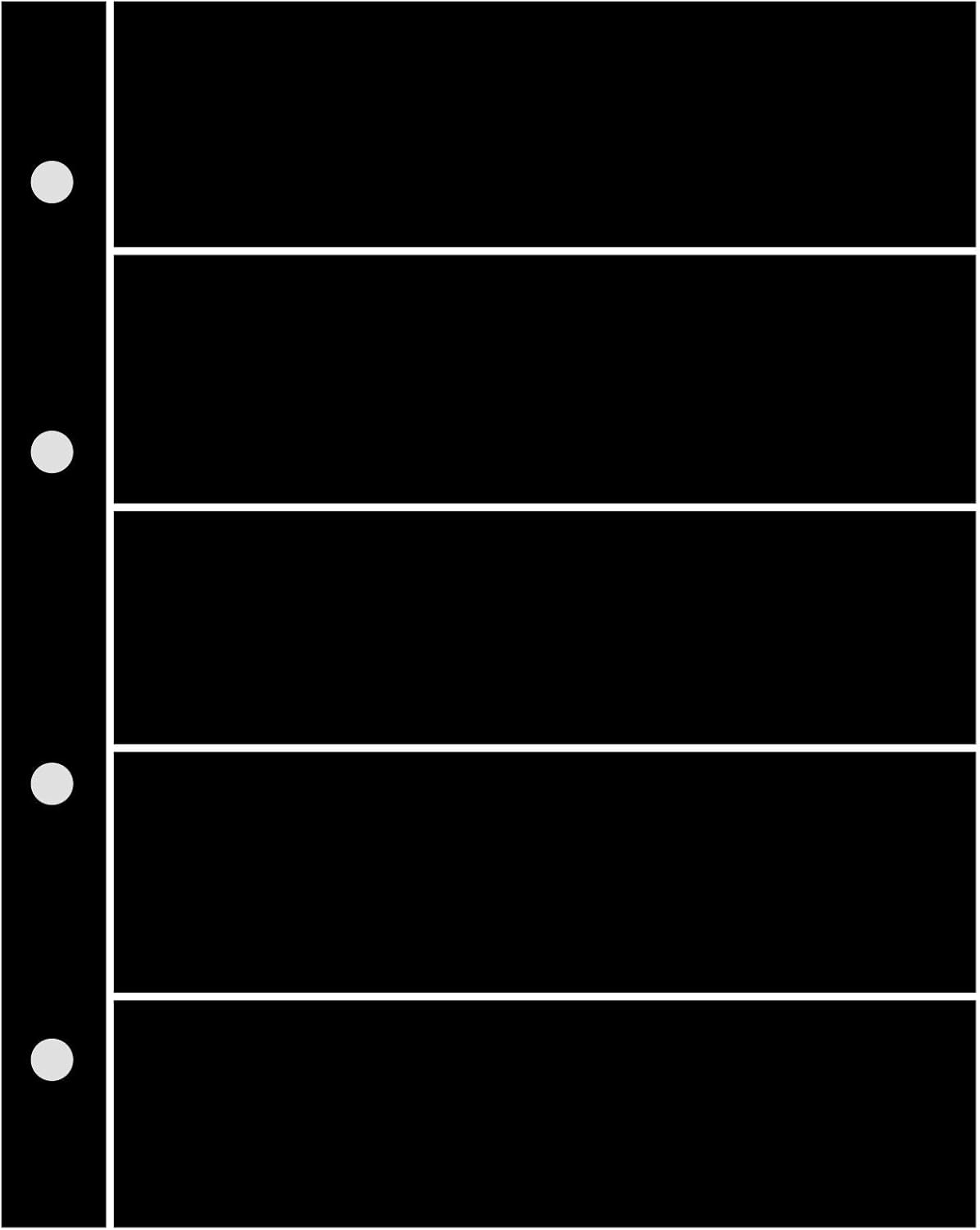 3 fogli di approvazione fronte-retro. Entrambi i lati con 5 tasche trasparenti per libretti, blocco di quattro francobolli e altri francobolli grandi fino a 49 mm di altezza. Pellicola rigida stabile, priva di plastificanti: pellicola di base nera da 0,4 mm (ottimo contrasto con la perforazione del timbro bianco), striscia trasparente da 0,08 mm. Formato A4 quasi standard: 220 x 297 mm. Dimensioni tascabili utili: 195 x 49 mm, apertura verso l'alto. Con 4 fori standard ad anello. Interasse fori 80-80-80 mm. Si adatta a qualsiasi rilegatura ad anelli standard. Sistema di stoccaggio variabile per la raccolta di oggetti di ogni tipo., RLO (unità di vendita): 3 articoli