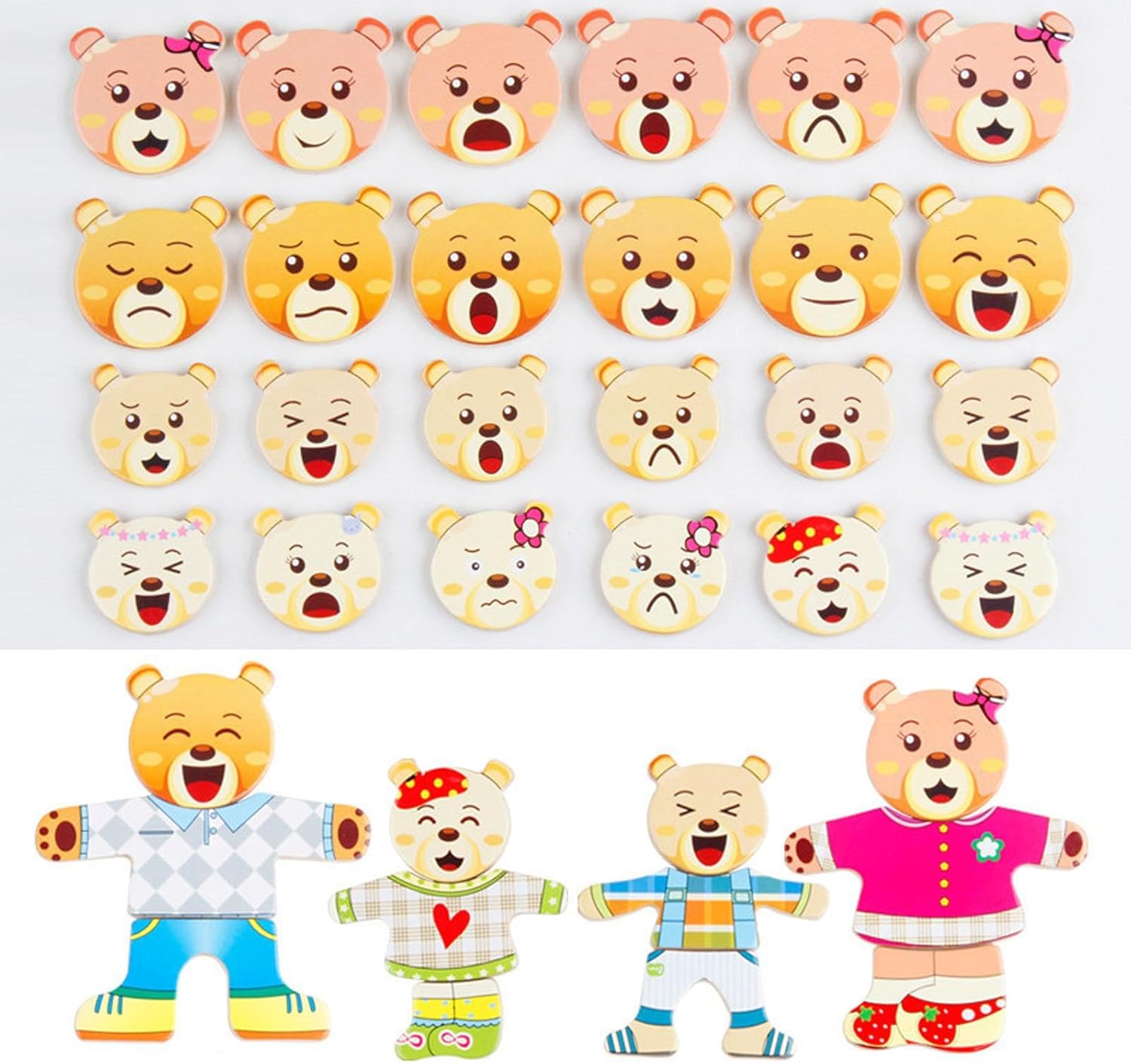 Ottimo regalo per bambini: i vestiti che cambiano giocattolo puzzle adatto ai bambini come regalo compleanno, regalo Natale e incoraggiali a esplorare loro mondo, anche un fantastico giocattolo interattivo per genitore-figlio Materiale selezionato: realizzato in materiale in legno qualificato, lucidato senza barate, nonché acqua resistente all'acqua non tossica, in modo sicuro per i tuoi bambini che giocano Vestiti che cambia forma abbinamento giocattolo puzzle: 3-d abiti colorati e opzionali per orso/coniglio, con design corrispondente per stimolare interessi dei bambini, incoraggiare e stimolare lo sviluppo del cervello, esercizio fisico e migliorare la coordinazione Hand & Eye Giocattolo puzzle educativo: giocattolo puzzle educativo con 4 diversi a tema/espressione del viso lasciano i bambini che combinano, stimola bene loro desiderio esplorare, concetto insegnamento in divertimento per migliorare la concentrazione dei bambini, esercitare loro pensiero logico base e abilità immaginazione Punteggio per l'allenamento delle abilità motorie raffinate: la tavola da puzzle con allenamento educativo per bambini è sottile abilità motoria, coltivare anche la capacità cognitiva abbinamento dei vestiti e un'espressione del viso, migliorano le capacità risoluzione dei problemi, la capacità abilità motoria fine e l'ulteriore sviluppo del cervello