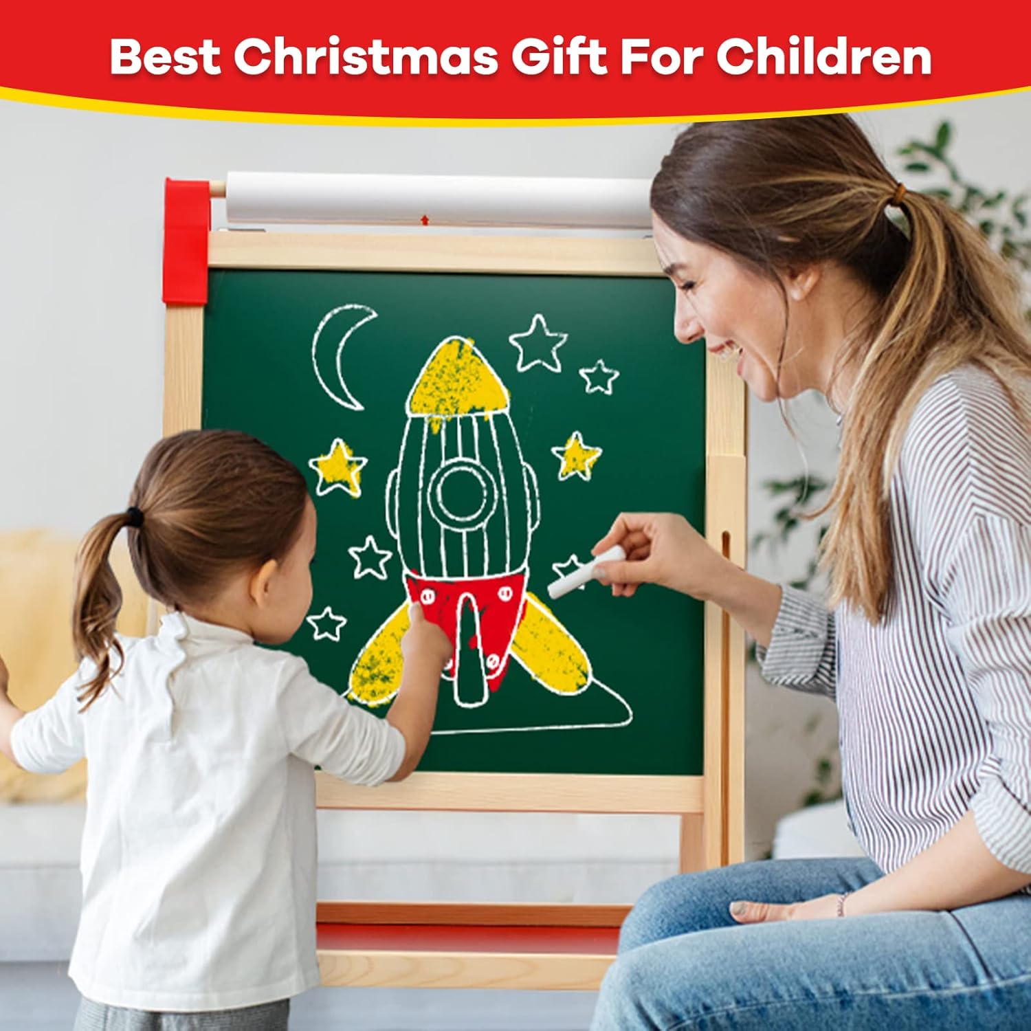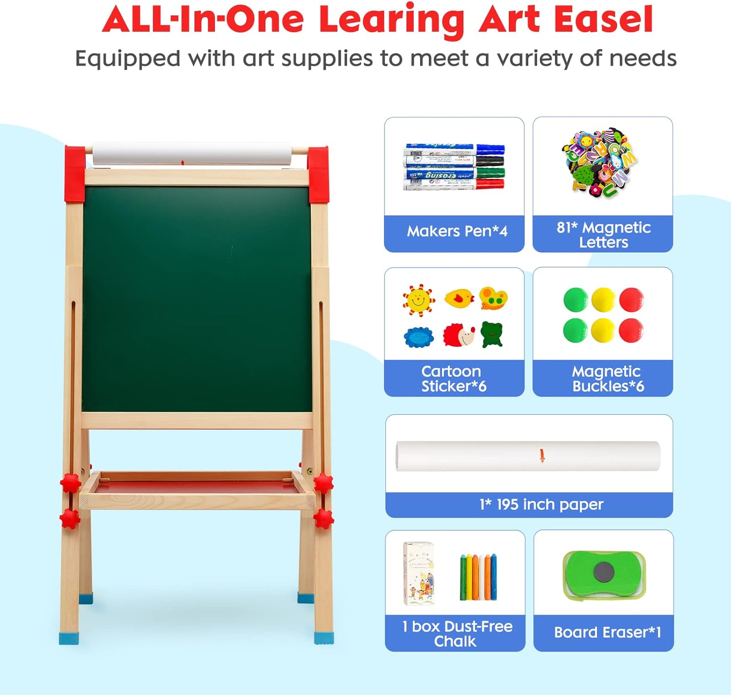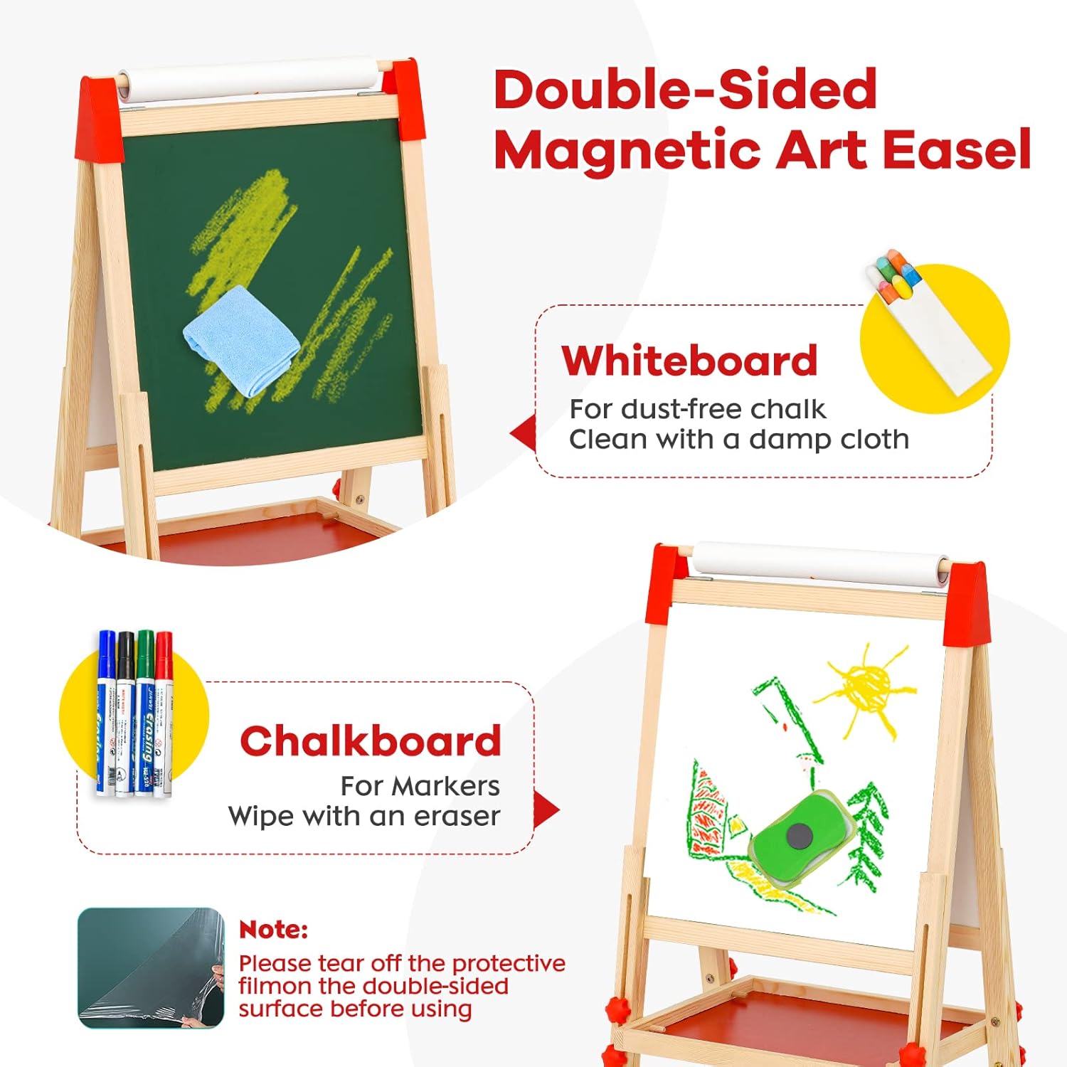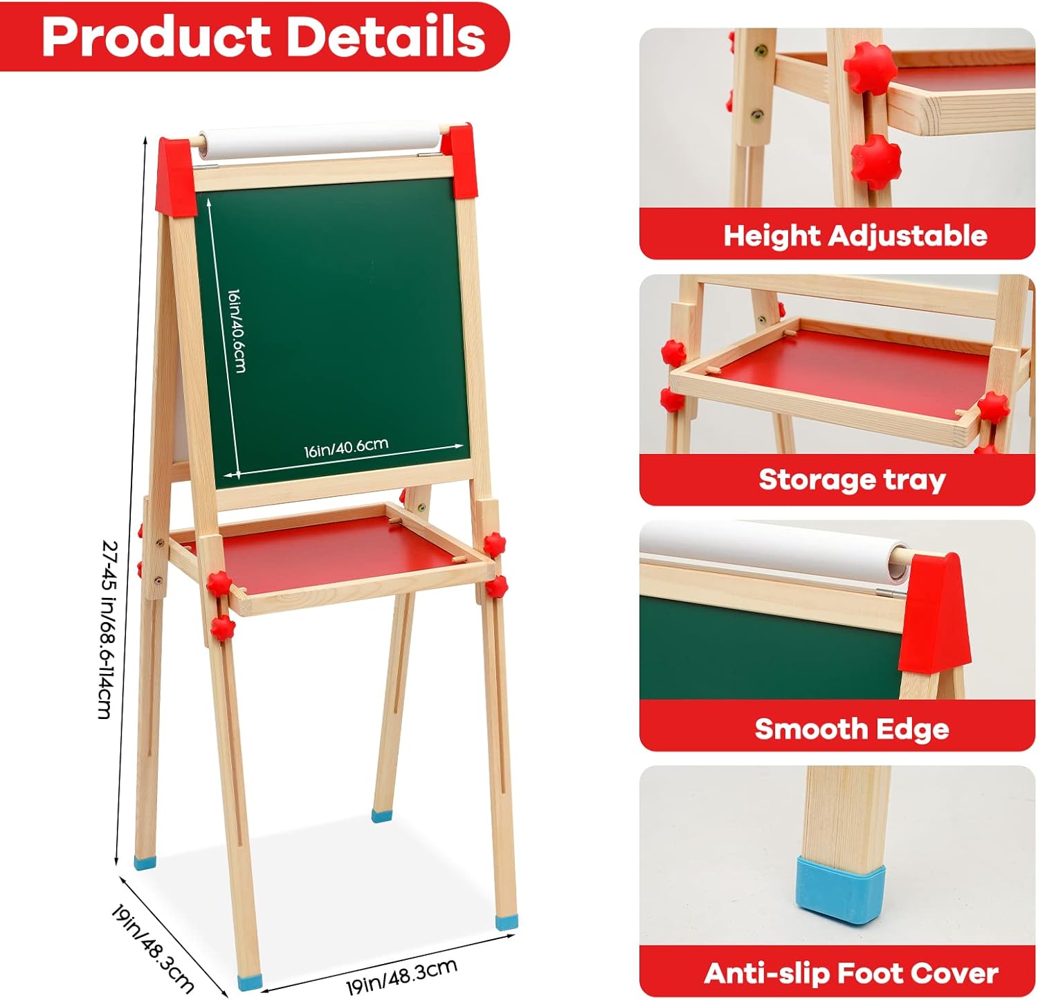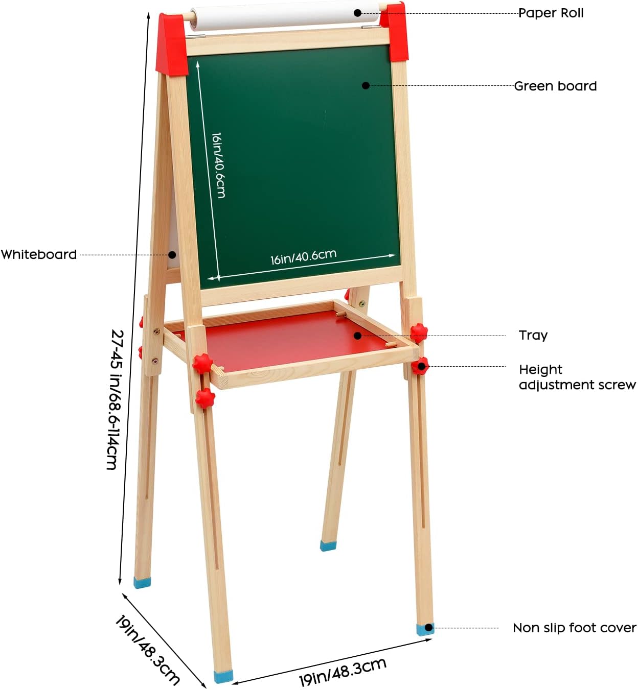 【Cavalletto per bambini in legno 3 in 1】Il cavalletto da pittura per bambini a doppia faccia è versatile. Può essere utilizzato non solo per disegnare su lavagne in bianco e nero, ma anche per tirare la carta da disegno sul rullo per disegnare. Gli adesivi inclusi nel set possono promuovere l'immaginazione e la creatività dei bambini sul tavolo da disegno, così i tuoi bambini potranno divertirsi creando in molti modi! 【Altezza regolabile】Questo Cavalletto Pittura per bambini può essere facilmente regolato in altezza e l'intervallo di altezza regolabile è compreso tra 68,6 cm (27 pollici) e 114 cm (45 pollici), adatto a bambini di diverse età . Il set include viti per fissare l'altezza del cavalletto, che non è facile da far scorrere. Questo cavalletto in legno è la scelta migliore per supportare la crescita dei piccoli artisti. 【Ricchi accessori】Questo cavalletto in legno fornisce ai bambini strumenti per dipingere e numerosi adesivi con numeri, lettere e animali. C'è un ripiano al centro del cavalletto, che può stabilizzare il cavalletto e fornire a tuo figlio un ottimo posto per organizzare gli strumenti di pittura e altri accessori in un unico posto conveniente. Nota: la pellicola di plastica sulla superficie del tavolo da disegno deve essere rimossa prima dell'uso. 【Stabile e sicuro】Questo cavalletto in legno a doppia faccia è realizzato con materiali robusti e adatti ai bambini con una superficie liscia senza sbavature. Nella parte inferiore del tavolo da disegno è presente un ampio vano portaoggetti, che forma un supporto triangolare con entrambi i lati del cavalletto per migliorare la stabilità del cavalletto. E il nostro cavalletto include anche quattro cuscinetti antiscivolo, che forniscono doppia stabilità, garantiscono la sicurezza dei bambini durante la creazione e il gioco e proteggono il pavimento dai graffi. 【Facile da pulire e installare】Questo cavalletto artistico per bambini è progettato per facilitare la pulizia ai genitori e la sua superficie è facile da pulire. Il cavalletto può essere facilmente installato senza attrezzi e viene fornito con chiare istruzioni passo passo. Se avete domande, vi preghiamo di contattarci via e-mail. Nota: la superficie del tavolo da disegno può essere pulita con un panno umido.