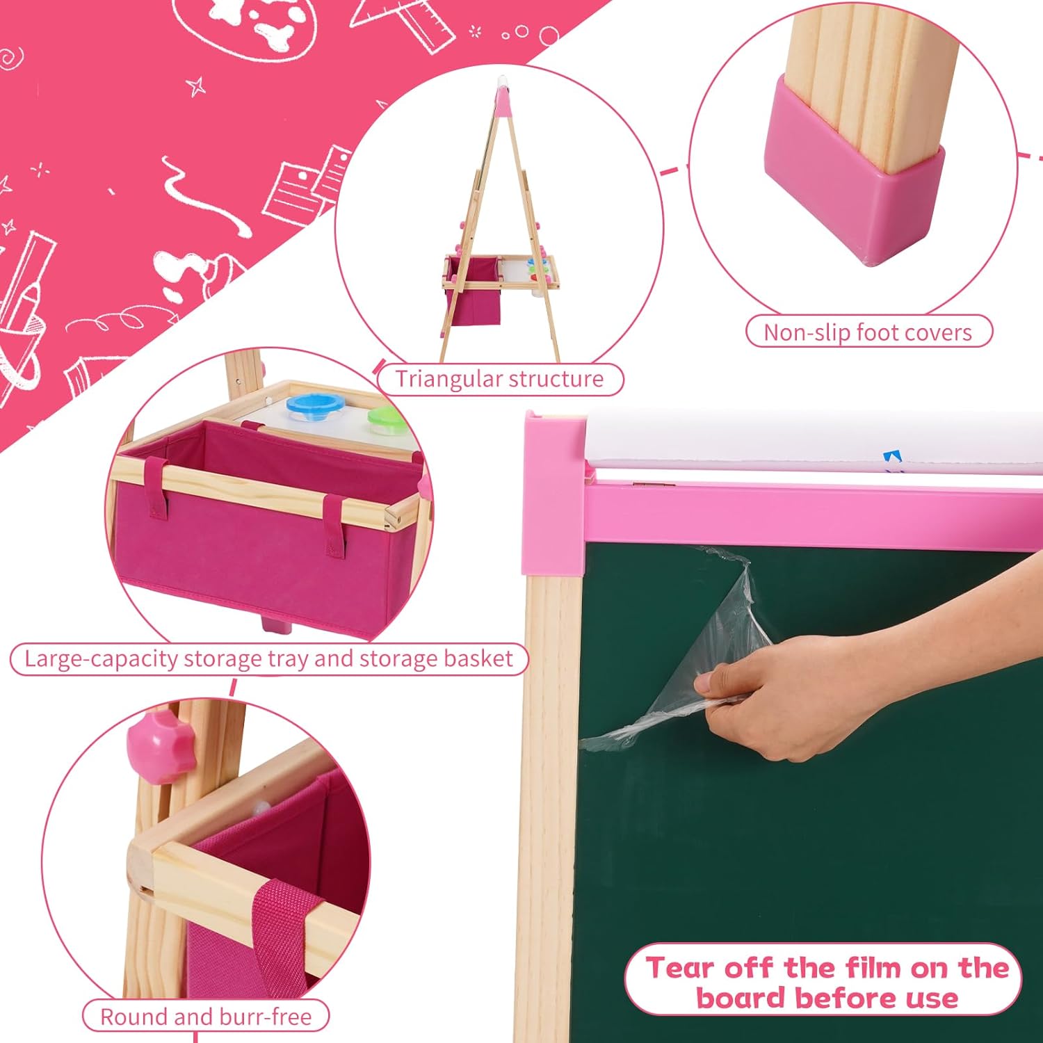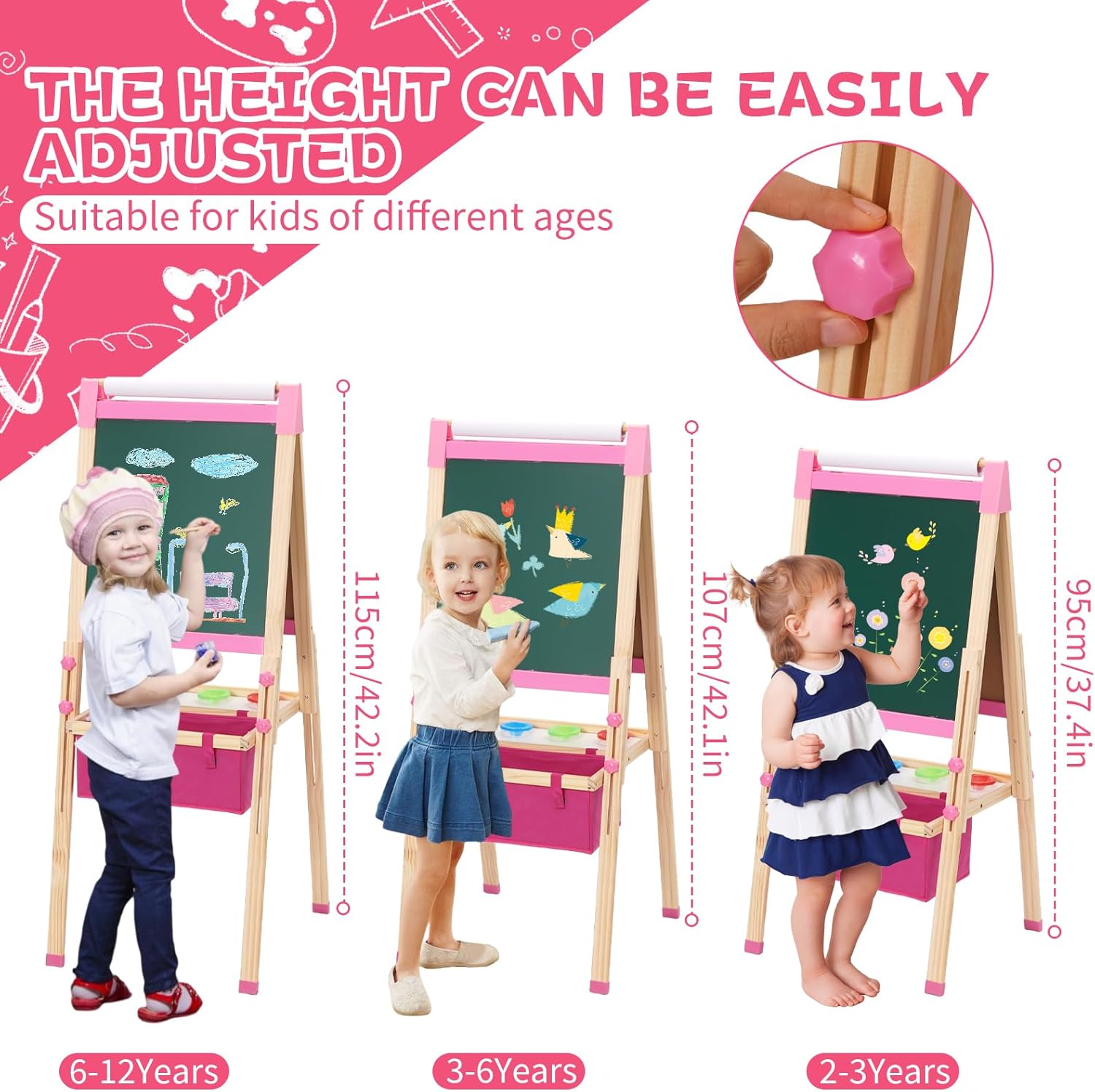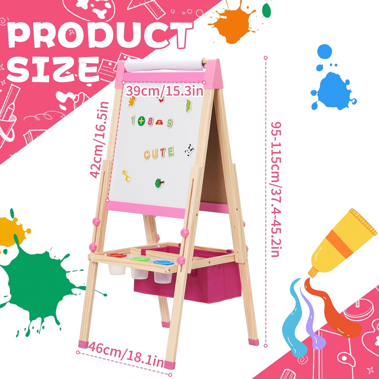 Ampia Gamma di Accessori: questo cavalletto per bambini è dotato di una varietà di pratici accessori da disegno, tra cui un rotolo di carta, pennelli colorati, un grembiule per bambini, adesivi con l'alfabeto e i numeri, una gomma e molto altro. Questo permette ai bambini di supportare in modo ottimale una varietà di attività di apprendimento come disegno, ortografia e matematica. Design Bifacciale: questa lavagna da disegno per bambini presenta un design bifacciale, con una superficie liscia come una lavagna su un lato e una superficie tradizionale come una lavagna bianca sull'altro. Ogni lato può essere utilizzato con pennelli diversi, offrendo diverse esperienze tattili e visive. La lavagna da disegno per due persone permette ai bambini di lavorare contemporaneamente con i genitori o i coetanei. Questo aumenta il divertimento dell'interazione e incoraggia l'espressione artistica e la collaborazione. Altezza Regolabile: questo cavalletto per bambini è regolabile in base all'altezza del bambino (95-115 cm) ed è adatto a bambini dalla scuola materna alla scuola elementare. Offre un'ampia gamma di utilizzi e una compagnia duratura. Perfetto per la casa, l'asilo o la scuola, è un regalo ideale per i bambini. Sicuro e Stabile: questo cavalletto per bambini è realizzato in legno massello di alta qualità, che lo rende particolarmente resistente. La struttura triangolare aumenta significativamente la sua capacità di carico e previene il ribaltamento, quindi il cavalletto non oscillerà durante la scrittura o la pittura. La superficie liscia e senza sbavature e gli angoli arrotondati garantiscono un gioco sicuro e confortevole. I piedini in gomma antiscivolo prevengono i graffi e aumentano la stabilità. Facile da Montare e Trasportare: questo cavalletto per bambini, adatto a bambini dai 3 ai 12 anni, presenta uno speciale design con dado e inserto di grandi dimensioni per un facile montaggio e smontaggio senza l'uso di attrezzi complicati. Il design leggero fa risparmiare tempo e fatica ai genitori, rendendolo ideale per viaggi, gite o visite ad amici e parenti.