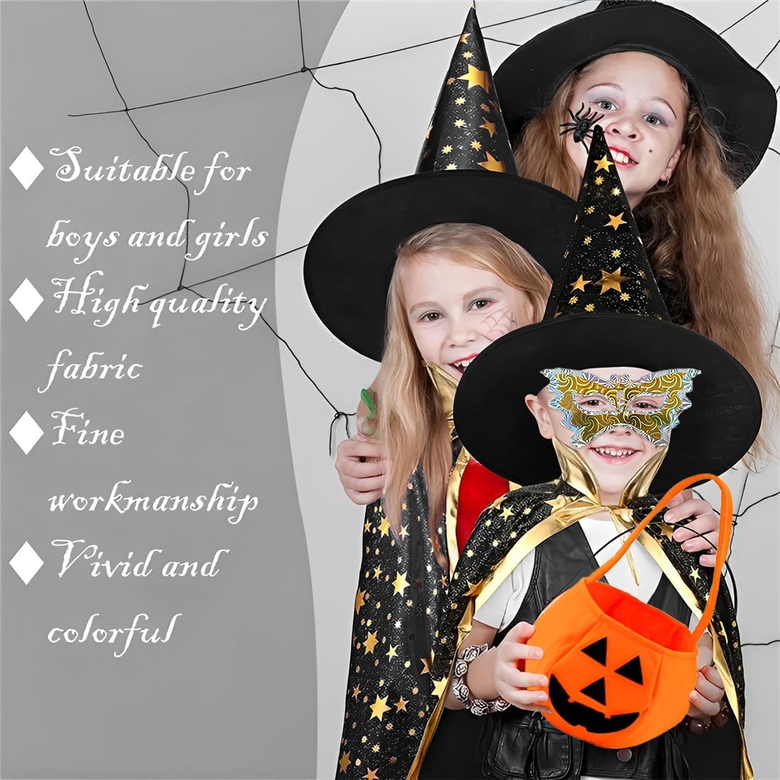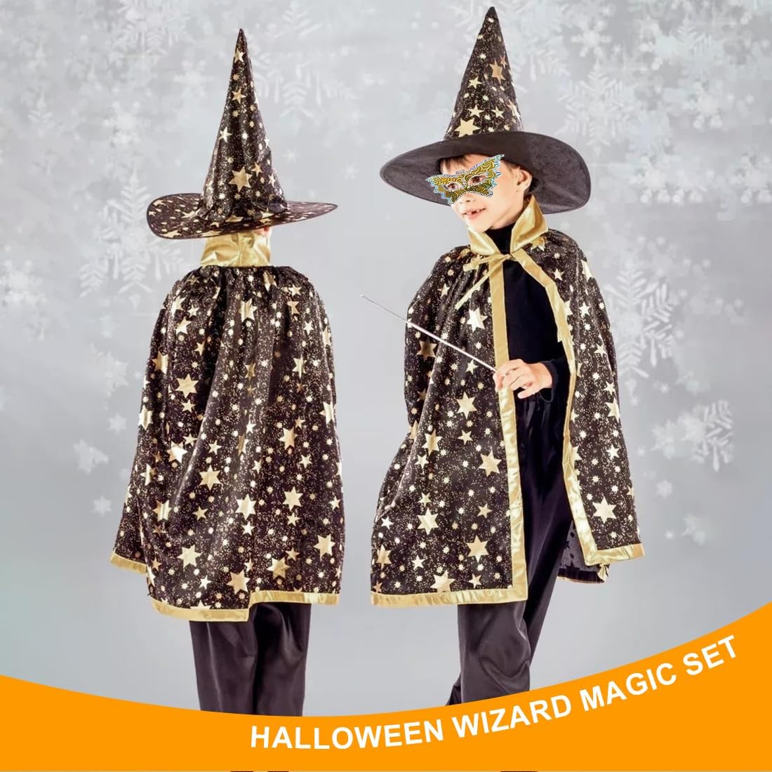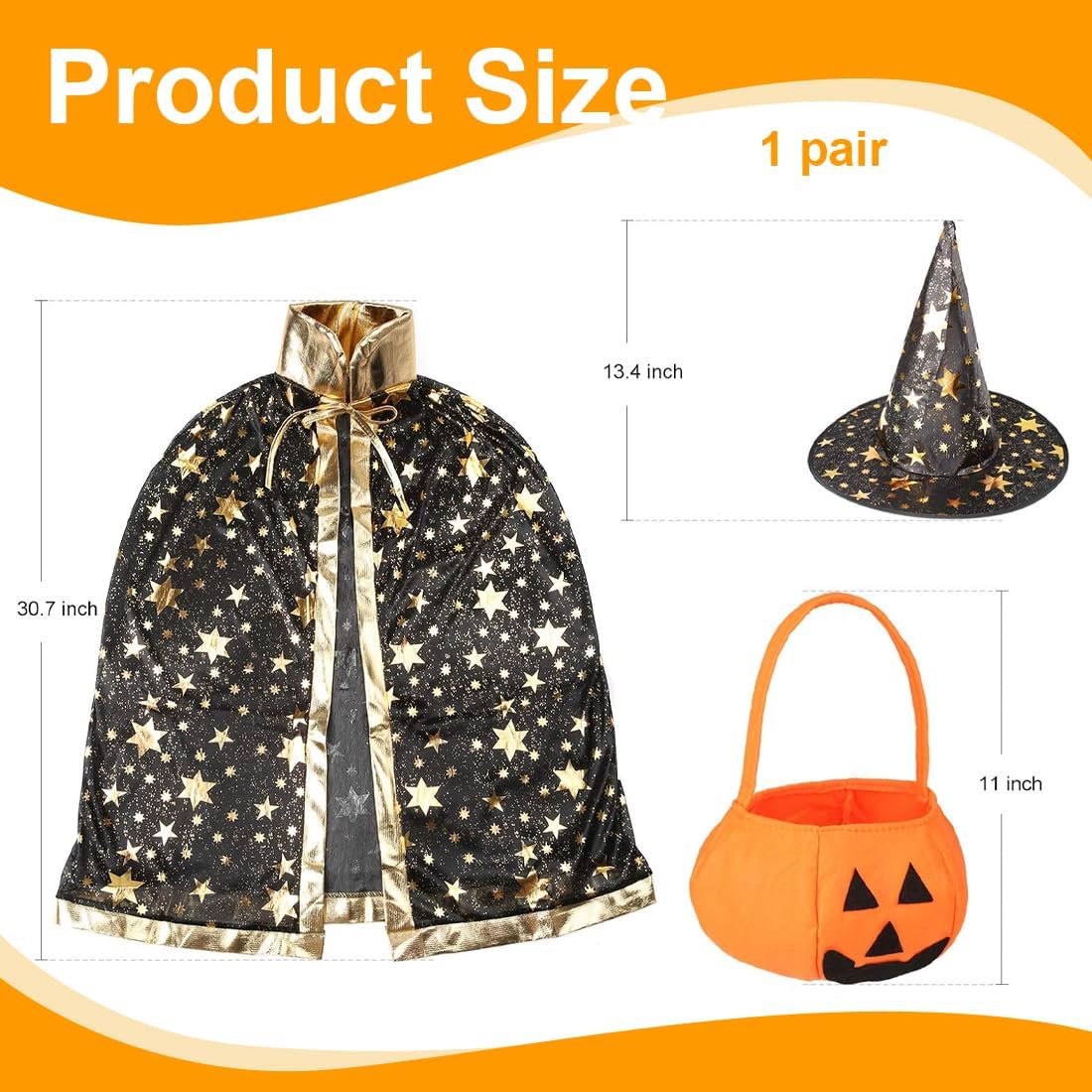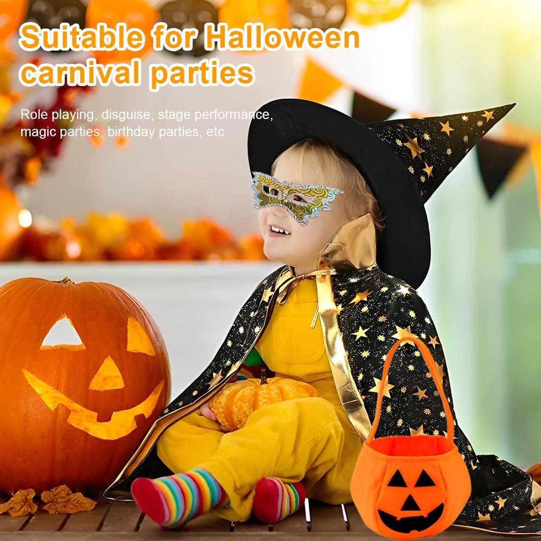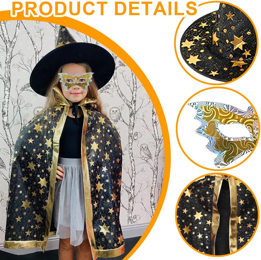 Design unico: con colletto dorato e stelle scintillanti, questa mantella è un vestito scintillante per i più piccoli. Dimensioni: Il mantello da mago è lungo 80 cm ed è adatto alla maggior parte dei bambini di età compresa tra 3 e 12 anni e alti 90-140 cm. Set per bambini Mantello da mago: include 1 mantello, 1 cappello da mago, 1 sacchetto di zucca e una benda sull'occhio per ragazzi e ragazze per interpretare il ruolo di una strega o di un mago. Ampia applicazione: adatto per feste di carnevale di Halloween, cosplay, balli in maschera, spettacoli teatrali, feste di maghi, feste di compleanno, drammi, feste di magia, carnevali per bambini, ecc. Regali per le feste: regali perfetti per figli, figlie, nipoti durante i carnevali, la festa dei bambini, i compleanni, Halloween, Natale.