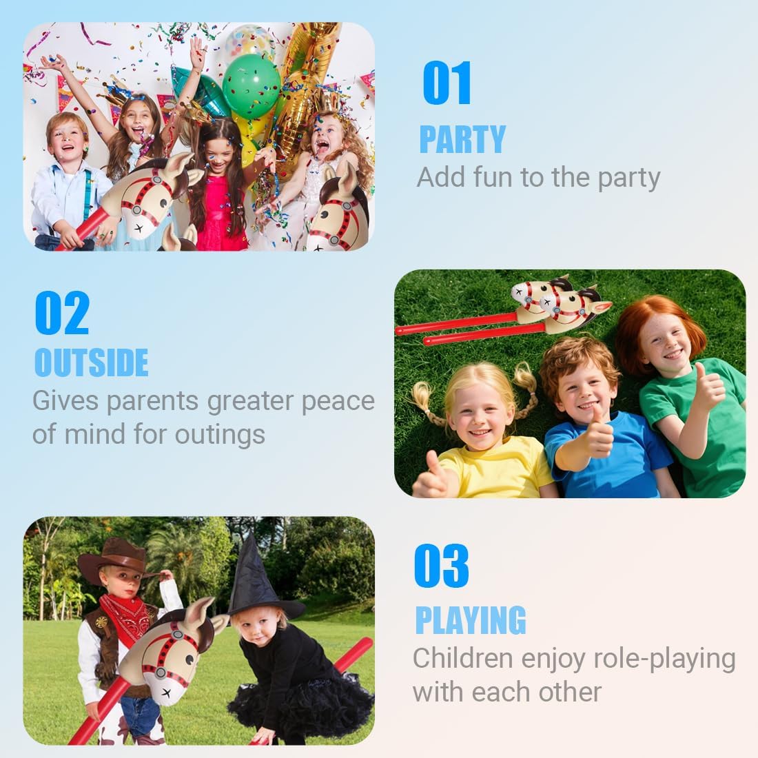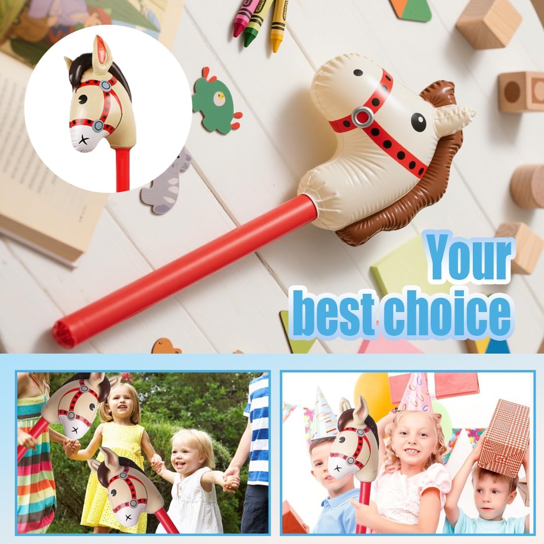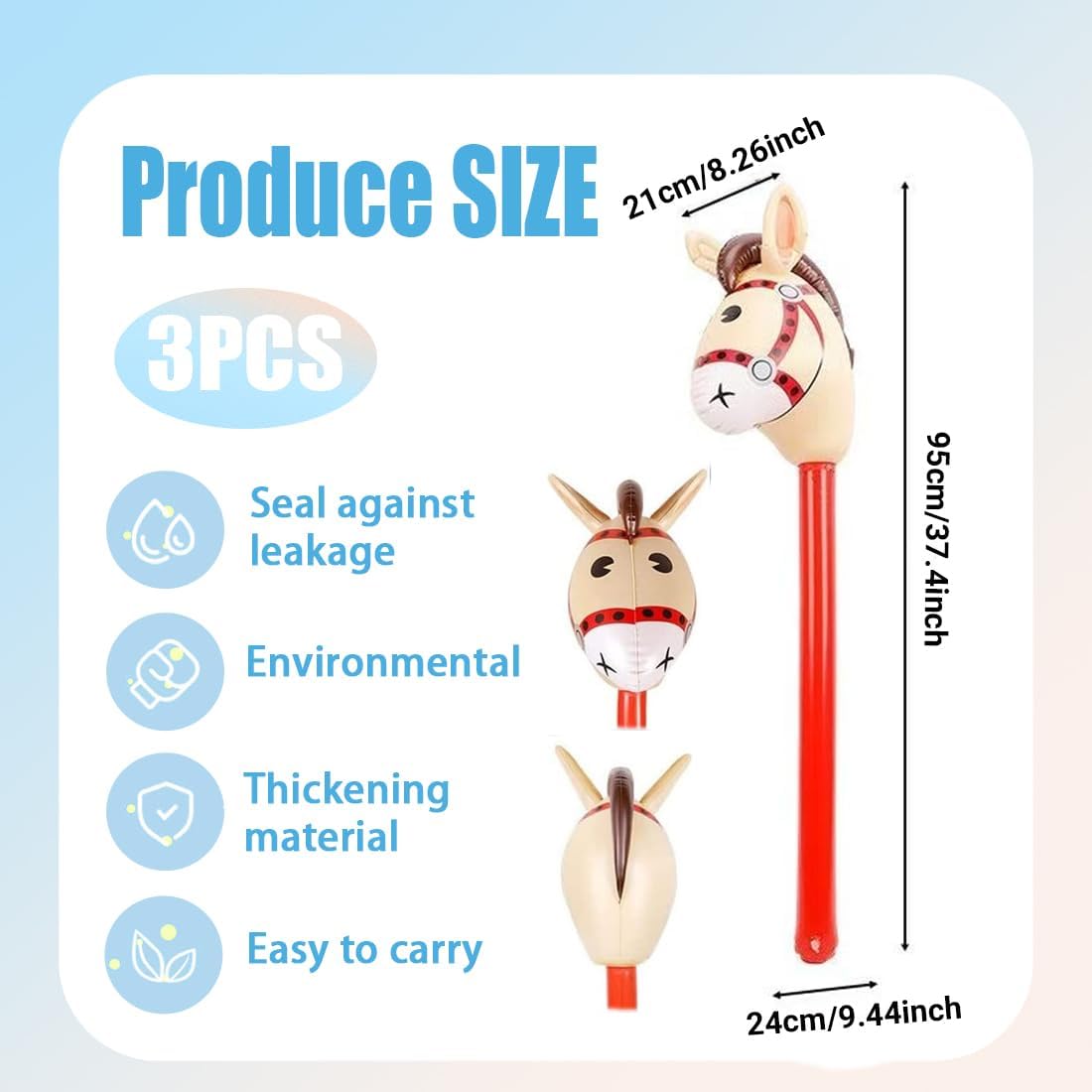 Contenuto della confezione: riceverete 2 bastoncini gonfiabili a forma di testa di cavallo, che una volta gonfiati misurano 95 x 30 cm. Utilizzabili per decorazioni di feste, giochi divertenti e accessori per feste. Materiali di alta qualità: i nostri cuscini gonfiabili a forma di testa di cavallo sono realizzati in PVC di alta qualità, sicuro e inodore, morbido al tatto e resistente, per garantire la sicurezza dei bambini e offrire un ottimo effetto stampato. Divertente accessorio: questo cavallo gonfiabile è realistico e facile da cavalcare come un cavallo vero. È perfetto per spettacoli comici a tema equestre, nonché come decorazione e accessorio per feste a tema equestre. Facile da usare: questo cavallo a dondolo gonfiabile è dotato di valvole di gonfiaggio e sgonfiaggio di alta qualità, che rendono il gonfiaggio e lo sgonfiaggio facili e convenienti, oltre che riutilizzabili. Ampia gamma di utilizzi: questo cavallo gonfiabile è perfetto come accessorio per feste a tema con animali, cosplay di carnevale, Natale, balli in maschera, Halloween e altre feste, ma può anche essere utilizzato come oggetto di scena per foto.