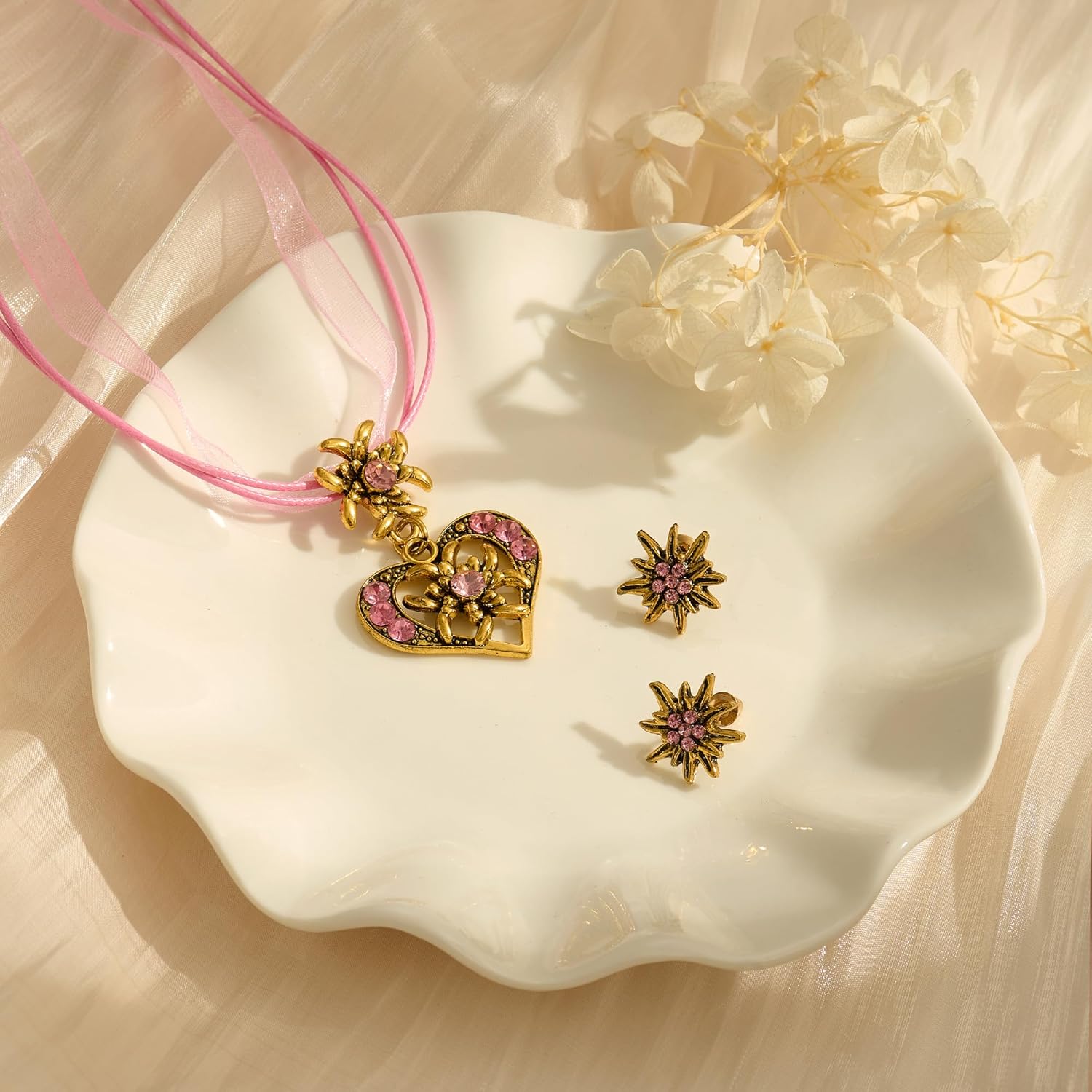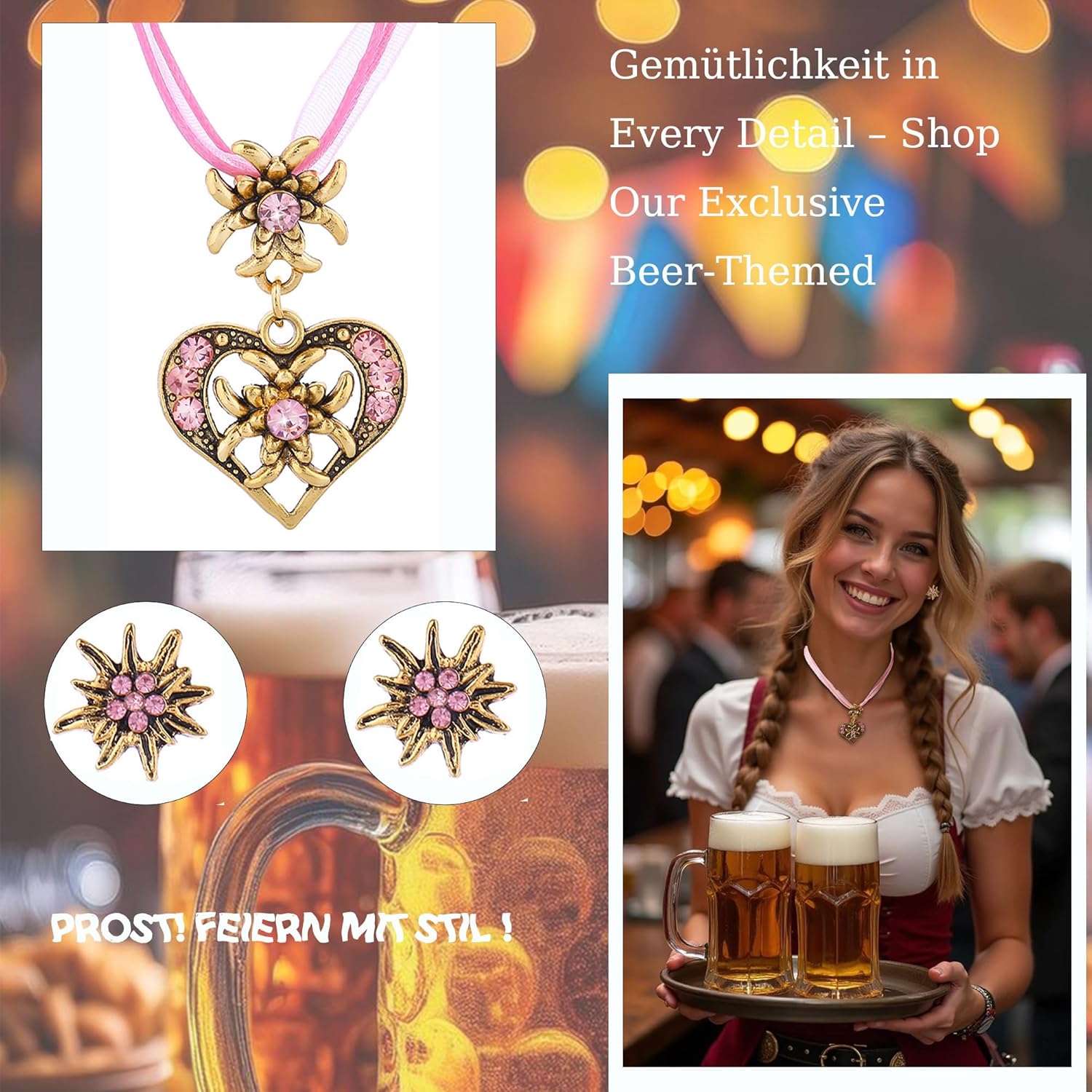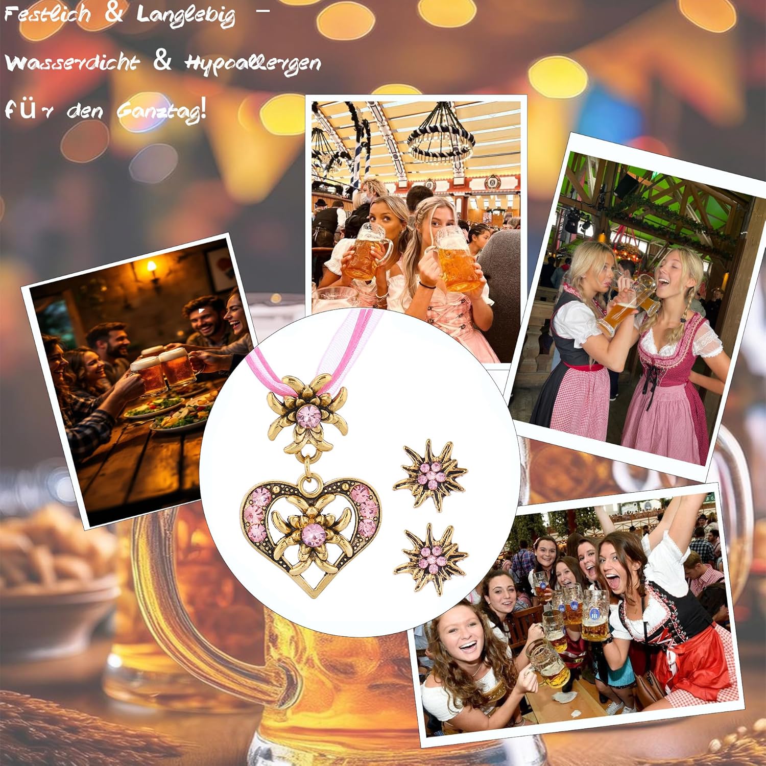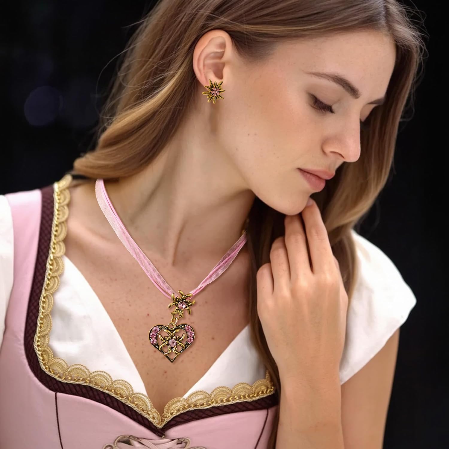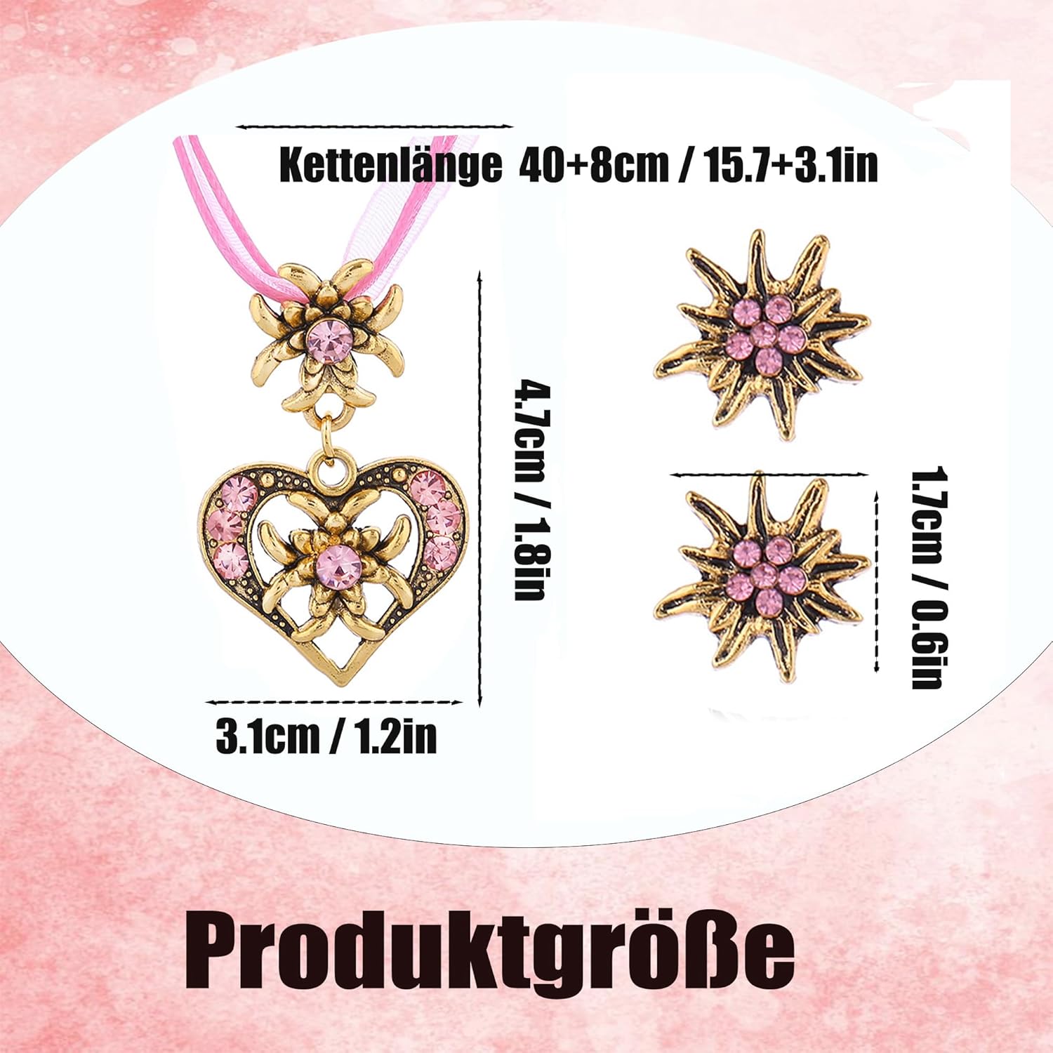 Completo di 3 pezzi per dirndl da donna Elegante set: Collana regolabile (lunga circa 40+6 cm) con elegante ciondolo (circa 2,8 x 4,4 cm) e due orecchini coordinati (circa Ø 1,5 cm). Dettagli eleganti: Decorata con strass scintillanti per una lucentezza festosa. Eleganza tradizionale: Gioielli perfettamente coordinati che completano con stile gli abiti dirndl e i costumi tradizionali. Un regalo ideale per gli amanti della moda tradizionale. Alta qualità artigianale: Design senza tempo combinato con una lavorazione meticolosa per apparire indimenticabili nelle occasioni di festa. Robusto e delicato sulla pelle: Realizzato in lega di ottone di alta qualità per una lucentezza e una durata durature. Lavorata appositamente per garantire la compatibilità con la pelle e la resistenza allo sbiadimento e alla deformazione. Pratico & affascinante: Il materiale resistente sfida l'umidità e il movimento attivo. Le pietre scintillanti di colore rosa dispiegano il loro splendore in un'atmosfera festosa. Perfezione del costume: Appositamente progettato per essere abbinato al dirndl e alla moda tradizionale del costume. Basta indossarlo per enfatizzare immediatamente il fascino tradizionale.