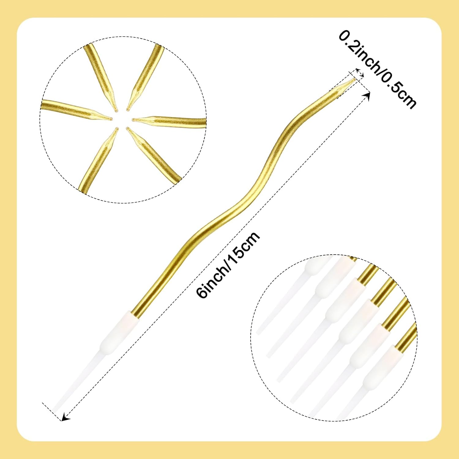 La confezione include: riceverai 30 candele di compleanno metalliche tortuose in oro. Questa quantità è sufficiente per soddisfare le vostre esigenze di decorazione e lasciare un'impressione duratura sui vostri ospiti. Dimensioni adatte: ogni candela tortuosa misura circa 15,5 cm di lunghezza (incluso il supporto) e 0,4 cm di diametro. Il supporto in plastica è lungo circa 4,5 cm. Questa dimensione si adatta perfettamente alla maggior parte delle tort Materiale del prodotto: queste candele a spirale sono realizzate in cera di alta qualità, inodore, atossiche e sicure da usare. Sono facili da accendere e forniscono un bagliore luminoso e caldo che aggiunge un tocco vivace e festoso alla tua festa. Design unico: queste candele sono progettate con una forma a spirale con un rivestimento metallico, che ricorda le fate che ballano sulla torta. Creano senza sforzo un'atmosfera romantica. I supporti in plastica proteggono la superficie della torta, garantendo che rimanga intatta e bella. Ampia applicazione: queste candele a spirale sono perfette per varie occasioni, tra cui feste di compleanno, matrimoni, anniversari, eventi aziendali, decorazioni per cupcake, celebrazioni e persino proposte. Portano un'atmosfera romantica e dolce a qualsiasi evento.