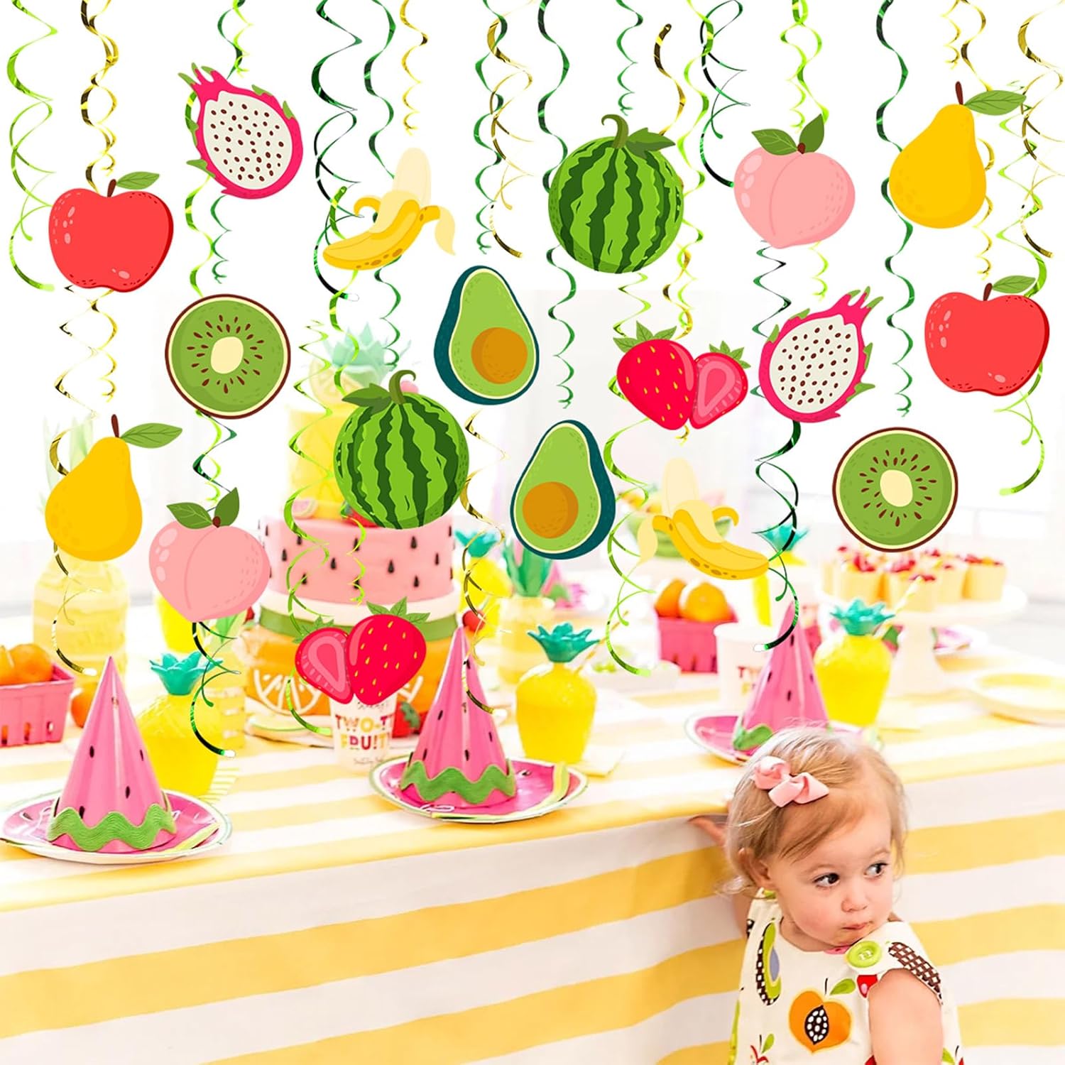 Trasformare il tuo spazio in una scena di frutta, adatta per feste, compleanni o eventi, creando un ambiente felice che sia adatto per condividere i social media Migliora l'atmosfera delle tue feste con le nostre decorazioni a spirale da appendere, un'aggiunta luminosa a qualsiasi celebrazione a tema frutta che promette di attirare i tuoi ospiti Adatto per i genitori che pianificano una prima festa di compleanno o baby shower, queste decorazioni a forma di frutta sono adatte anche a chiunque cerchi di aggiungere un tocco di fascino al loro evento Realizzati con materiali, questi vortici colorati presentano 18 ritagli unici a doppia stampa di frutti lussureggianti, abbinati a 30 vortici scintillanti per un display dinamico e festivo Veloce e facile da installare, questi vortici da appendere offrono una soluzione di rilascio di disordine alle decorazioni per feste, consentendo di trascorrere più tempo a festeggiare e meno tempo a decorare