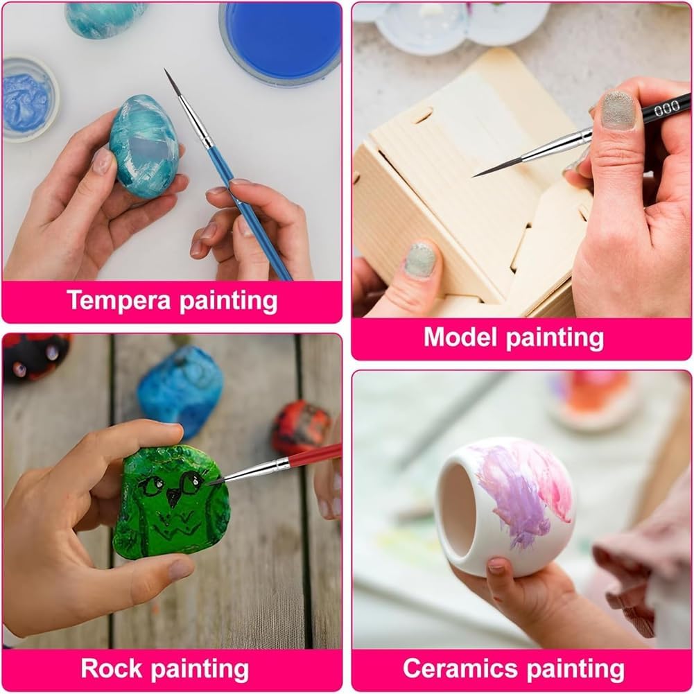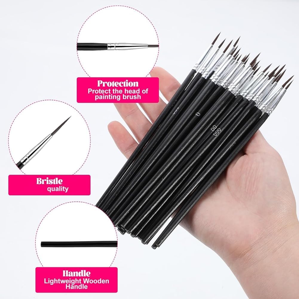 Questi pennelli dettagliati sono adatti per una varietà di , tra cui , pittura a guazzo, pittura acrilica, nail art, pittura facciale, modello in miniatura e pittura artigianale. sono strumento indispensabile per la collezione di qualsiasi artista. Realizzati con setole sintetiche anticaduta durevoli, anelli di ghiera antiruggine e un manico in legno, questi pennelli sottili sono progettati per un uso a lungo termine. Ogni pennello è dotato di un tubo protettivo per mantenere la sua forma e qualità. Questo set contiene 30 pennelli sottili, tre diverse dimensioni: #000, #00 e #0, 20 pennelli per ogni dimensione. Perfetto per artisti e principianti che bisogno di pennelli di tutti i tipi di dettagli. La lunghezza del pennello n. 0 è di circa 0,28 pollici (circa 0,6 cm), il pennello per il trucco n. 00 ha 0,47 pollici (circa 0,1 cm) di setole, il pennello per il trucco n. 000 ha 0,6 pollici (circa 1,6 cm) di pelscentimetro). Questi pennelli a punta fine sono perfetti per vernici complesse e sottili. I nostri pennelli a punta fine sono facili da pulire con acqua e sapone. possono essere rimodellati con le e possono resistere all'uso quotidiano, rendendolo una scelta affidabile per le tue esigenze di pittura.