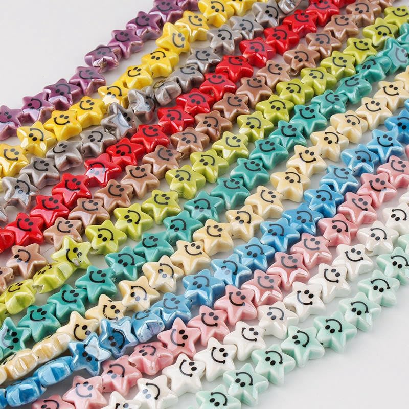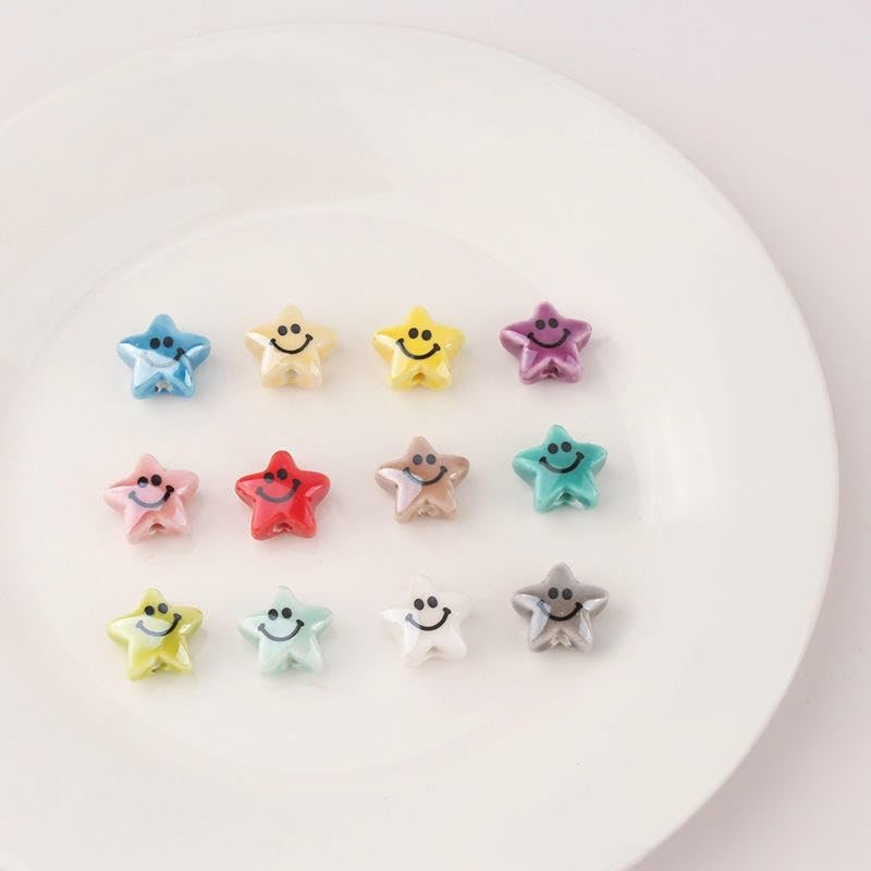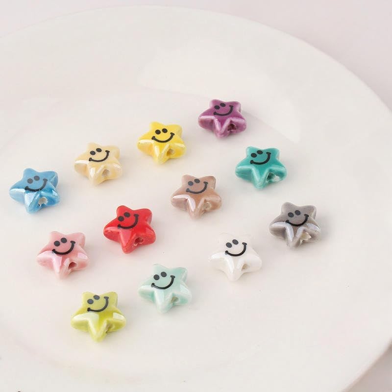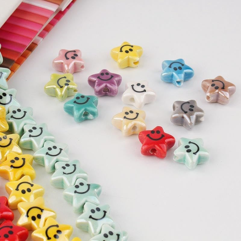 Perline sfuse in ceramica smaltata a forma di smiley, foro verticale, dimensioni: 14x15 mm, diametro del foro: circa 2 mm, 30 pezzi/confezione Queste perle di porcellana a forma di faccina sorridente sono realizzate in ceramica, hanno un aspetto liscio, non si rompono o sbiadiscono facilmente, sono comode da indossare e possono essere utilizzate a lungo Queste perle di porcellana a forma di faccina sorridente sono facili da abbinare, puoi aggiungere le tue perle con lettere, perle o perline di filo come perline distanziatrici, oppure semplicemente infilarle insieme per creare un bellissimo braccialetto Queste perle di porcellana sorridenti sono disponibili in design rotondi, a cuore, a fiore o a stella per un look carino e unico e sono smaltate in giallo o colorate per colori vivaci Queste perle di porcellana a forma di faccina sorridente sono molto adatte per realizzare braccialetti, collane, orecchini, ciondoli, portachiavi fatti a mano e possono anche essere regalati ad amici a cui piacciono le perle fatte a mano