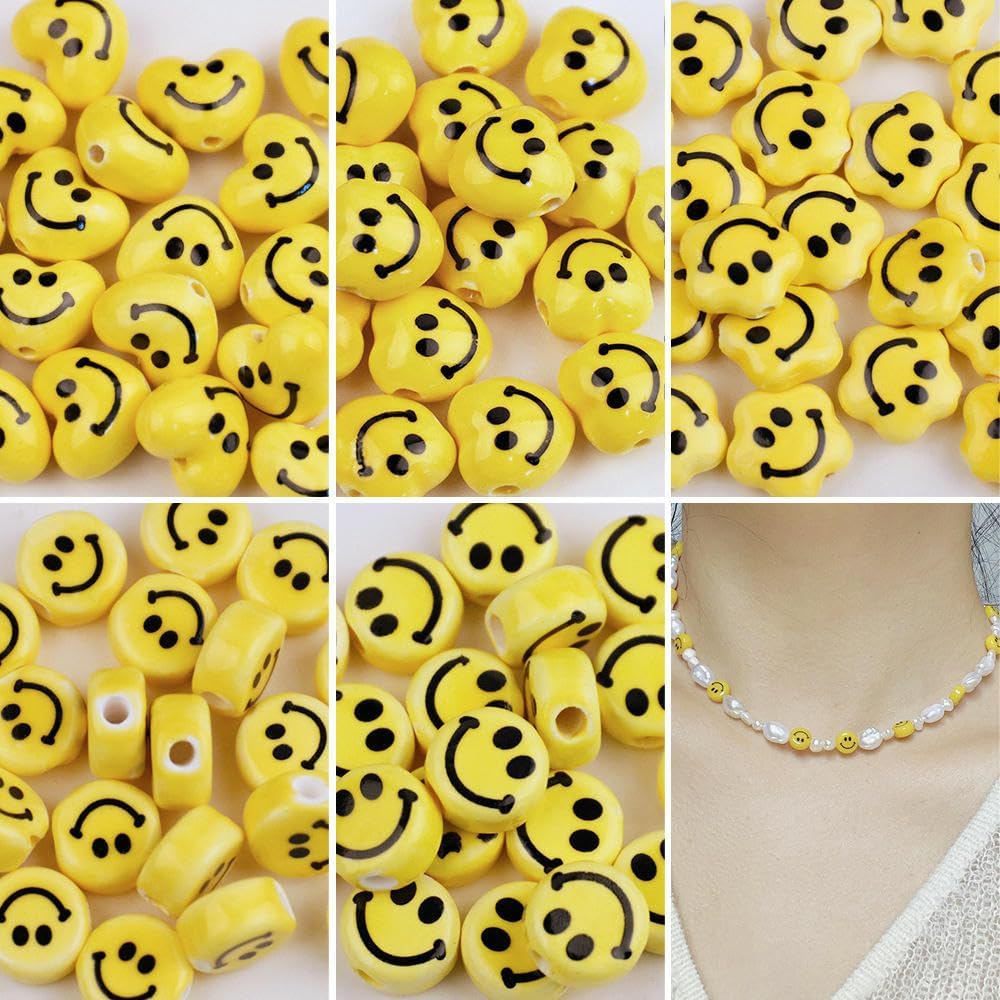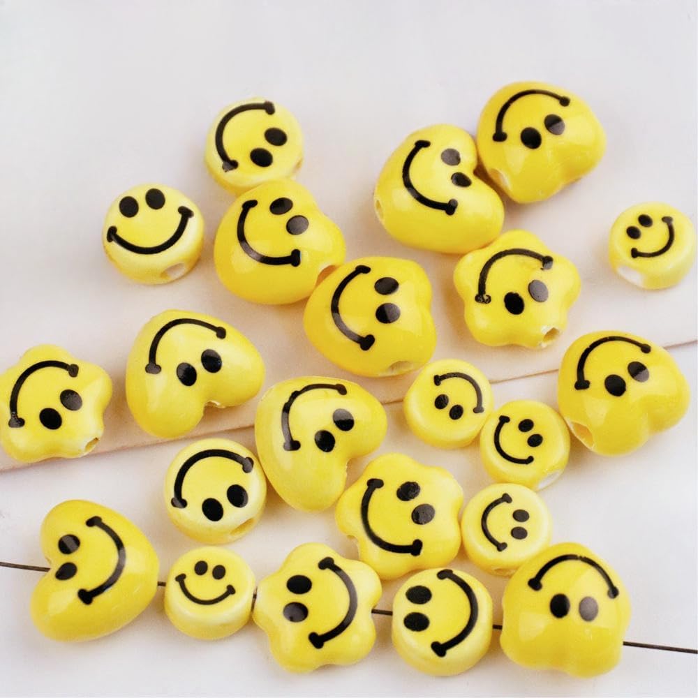 Perline sfuse in ceramica smaltata a forma di smiley, dimensioni: 10 mm, 12 mm, 15 mm, 17 mm, 30 pezzi/confezione Queste perle di porcellana con faccina sorridente sono realizzate in ceramica, hanno un aspetto liscio, non si rompono o sbiadiscono facilmente, sono comode da indossare e possono essere utilizzate a lungo Queste perle di porcellana a forma di faccina sorridente sono facili da abbinare, puoi aggiungere le tue perle con lettere, perle o perline di filo come perline distanziatrici, oppure semplicemente infilarle insieme per creare un bellissimo braccialetto Queste perle di porcellana sorridente sono disponibili in design rotondi, a cuore, a fiore o a stella per un aspetto carino e unico e sono smaltate in giallo o colorate per colori vivaci Queste perle di porcellana a forma di faccina sorridente sono molto adatte per realizzare braccialetti, collane, orecchini, ciondoli, portachiavi fatti a mano e possono anche essere regalati ad amici a cui piacciono le perle fatte a mano