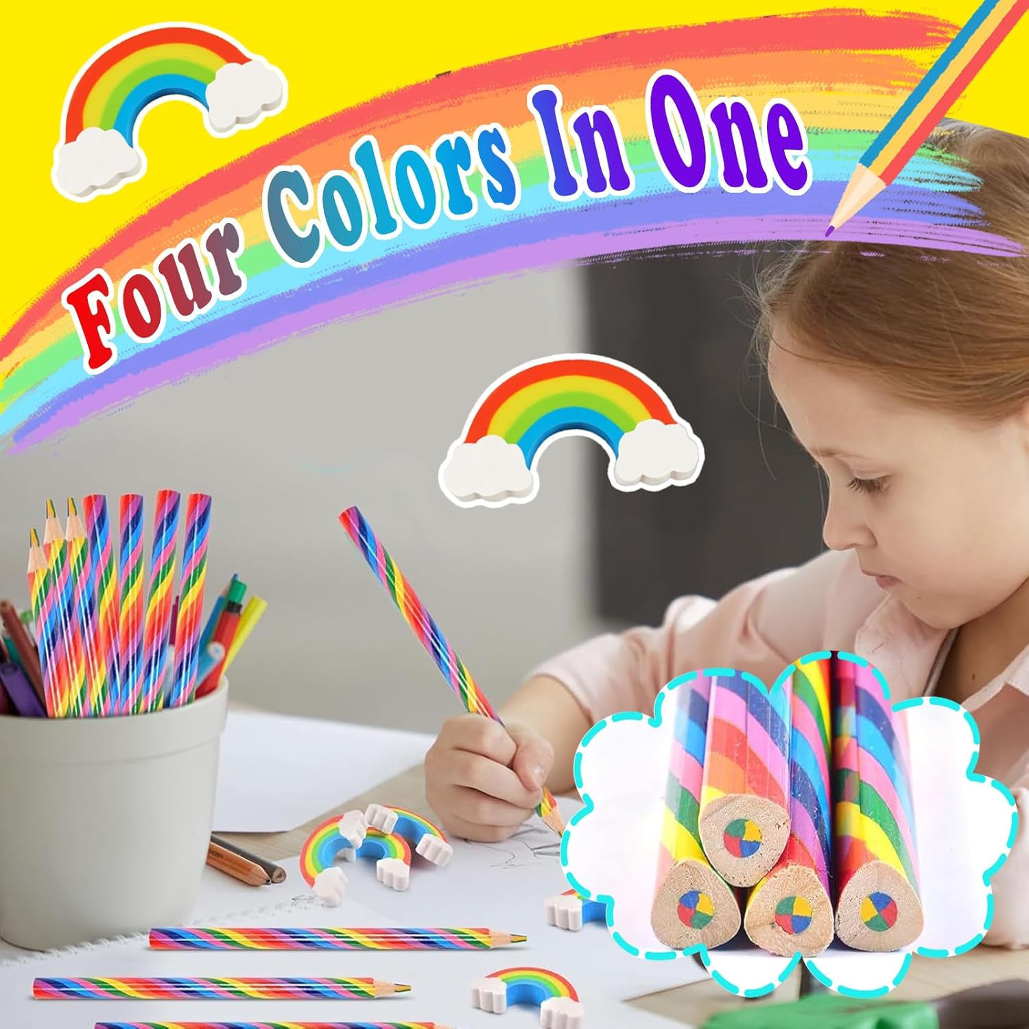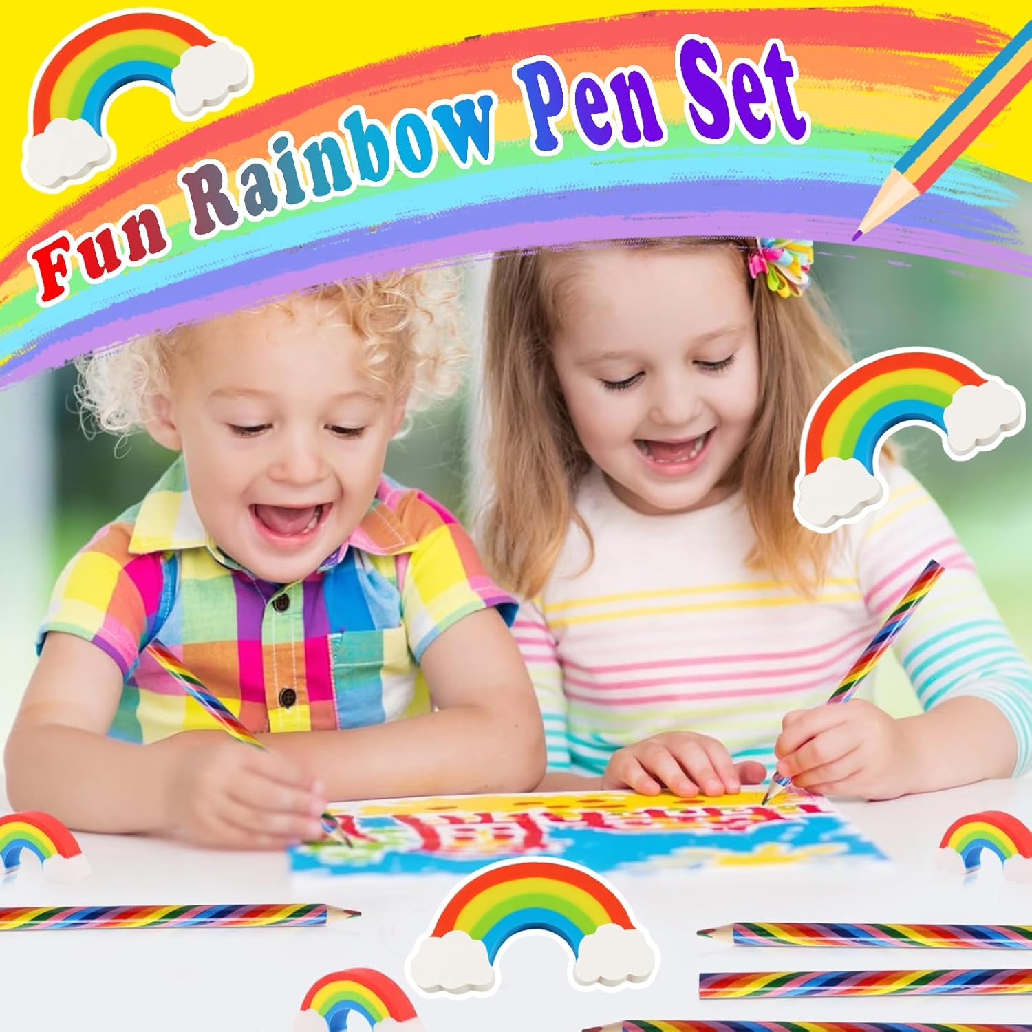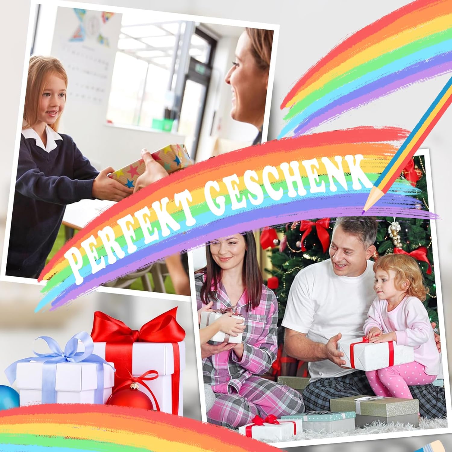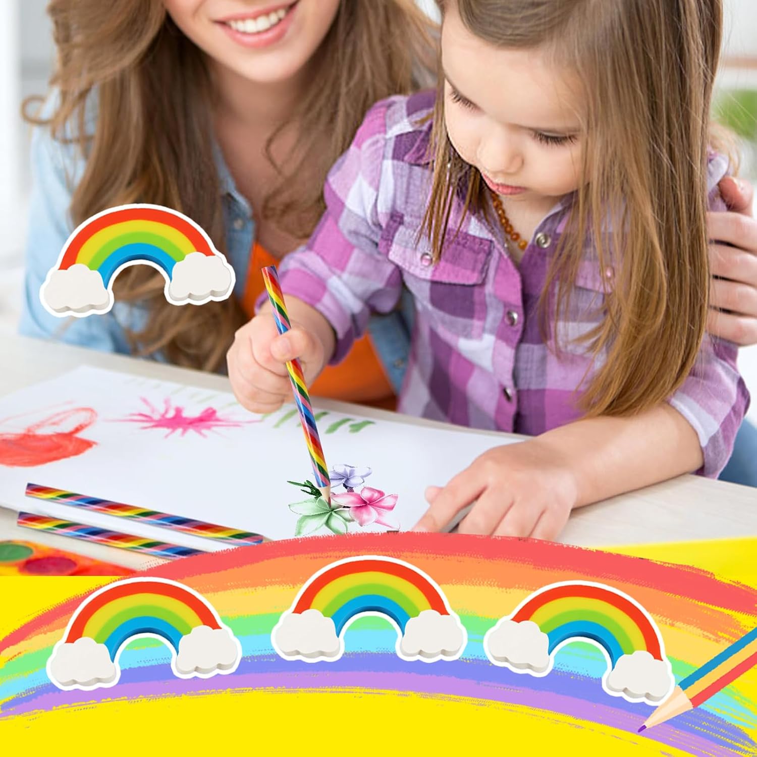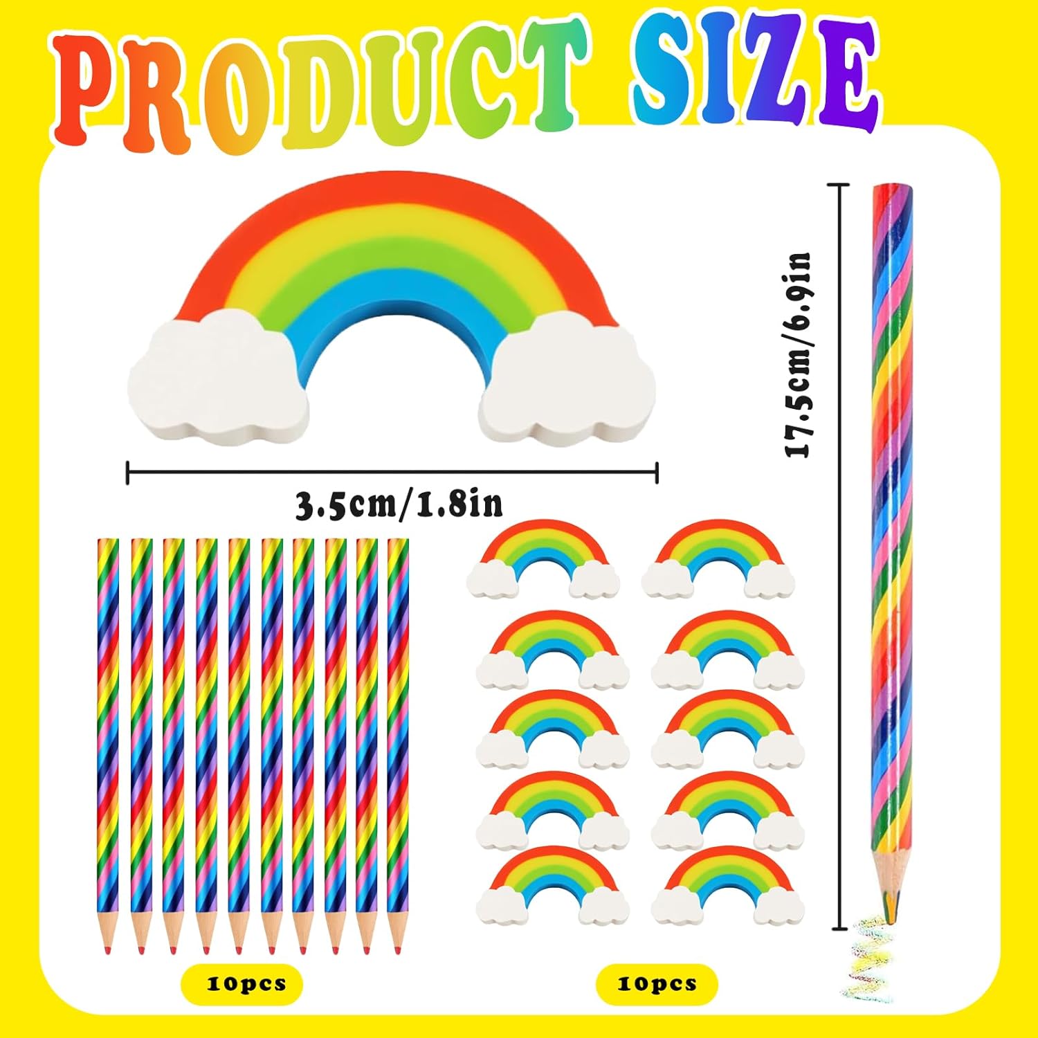 [SET GOMME] - Ogni confezione contiene 10 gomme morbide a forma di arcobaleno, la dimensione della gomma è di 3,5 cm. La gomma per bambini 2B non contiene sostanze nocive, non invecchia, è morbida e pulita, ha le migliori prestazioni di cancellazione e non si usura quasi. La normale scrittura a matita può essere cancellata in modo pulito. [SET DI CANCELLERIA ARCOBALENO] - Le matite colorate sono realizzate in legno di alta qualità e le gomme arcobaleno sono realizzate in gomma, che ha elevata tenacità e morbidezza. Sono morbidi, facili da cancellare e non si attaccano alla carta. Il braccialetto a forma di cuore da donna è realizzato in lega. Il set di cancelleria arcobaleno porta più divertimento ai bambini [COLORI DELL'ARCOBALENO] - La confezione contiene 10 matite colorate in diversi colori, la lunghezza delle matite arcobaleno è di circa 17,5 cm, adatte a bambini e adulti. Il set di matite colorate triangolari è colorato e adatto al design artistico dei bambini. [BRACCIALETTI AMORE E AMICIZIA] - 10 bellissimi e squisiti braccialetti con corda a cuore in 10 colori diversi, che possono essere facilmente adattati alle dimensioni del polso per soddisfare le diverse esigenze di dimensione. Questo braccialetto è semplice e alla moda, adatto ad adulti e bambini da indossare sempre e ovunque. [REGALO PERFETTO] - Il set di cancelleria comprende pastelli, gomme da cancellare e braccialetti, che lo rendono un regalo perfetto per i compleanni dei bambini, il ritorno a scuola e i premi. Adatto a scuole, aule di disegno e uffici e può essere utilizzato da adulti e bambini.