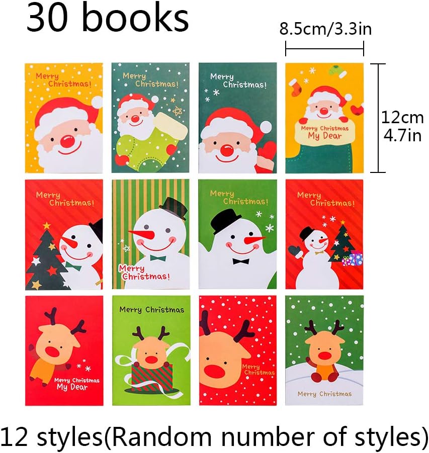 ❀【Notebook】Il nostro palmare sta facilmente nella tasca posteriore o in una camicia ❀【Design natalizio】I mini taccuini natalizi hanno un classico design a tema natalizio: Babbo Natale, pupazzo di neve, renna. Sembra elegante, bello e chic. Le sue dimensioni ridotte ti permettono di trasportarlo facilmente in borsa. ❀ 【Regalo perfetto】 Un must per ogni viaggiatore e un regalo ideale per la tua famiglia e i tuoi amici, o anche per te stesso, questo distintivo diario ricaricabile aiuterà le parole a fluire liberamente. Questo taccuino è un modo meraviglioso ed elegante per registrare la tua vita. ❀ 【Regalo di Natale】 Mini quaderni con copertina con simpatico motivo a cartoni animati, un regalo molto carino per i bambini a Natale, Capodanno e vacanze. Fantastico regalo di Natale, ideale per omaggi e premi delle fiere scolastiche. ❀【Riempitivi per sacchetti da festa】I quaderni di Natale sono perfetti per conservare riempitivi e sacchetti da festa per bambini. Crea un'atmosfera natalizia