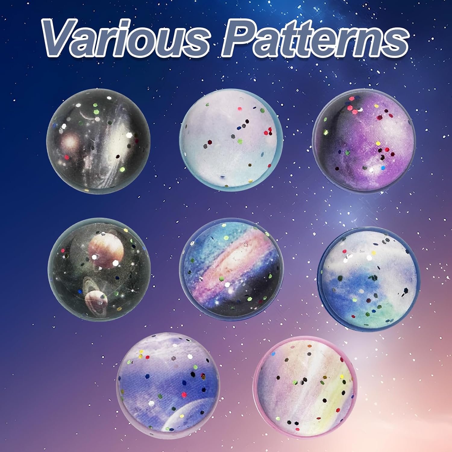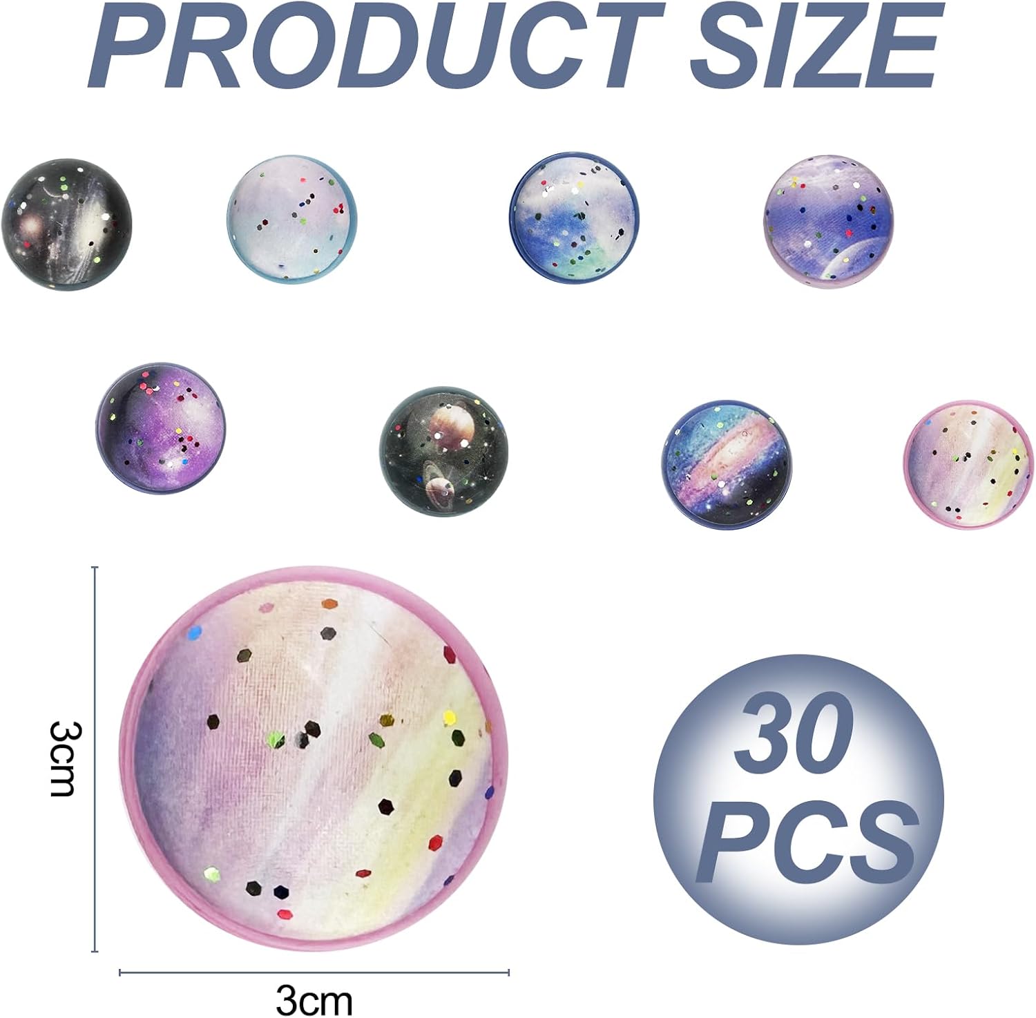 【Tema spaziale】Il set contiene 30 palline rimbalzanti per bambini a tema spaziale, con un design "cielo stellato", paillettes scintillanti e bellissimi motivi. Ci sono 8 diversi motivi in totale e la quantità è sufficiente per soddisfare le tue diverse esigenze. Molto adatto come regalo per feste a tema spaziale. 【Materiale sicuro】Le pallina rimbalzante sono realizzate in materiale di gomma, sicuro e atossico, che garantisce la sicurezza dei bambini durante il gioco. Non solo è leggero e resistente, ma ha anche una buona elasticità, portando ai bambini più divertimento rimbalzante. Nota: non adatto a bambini di età inferiore a 3 anni. 【Super rimbalzo】Basta far cadere la palla rimbalzante per bambini a terra, rimbalzerà molto in alto o colpirla contro il muro e rimbalzerà indietro. È molto adatto a genitori e bambini per giocare insieme e godersi un momento felice e rilassante insieme. 【Facile da trasportare】Il diametro della palline di gomma rimbalzanti è di 30 mm. Sia gli adulti che i bambini possono tenerlo facilmente in mano. È di piccole dimensioni, facile da trasportare e può essere utilizzato non solo al chiuso ma anche in occasioni all'aperto come parchi e piazze. 【Ampia gamma di utilizzi】Queste palline rimbalzanti a tema spaziale possono essere utilizzate non solo come riempitivi per sacchetti da festa, regali per gli ospiti, giocattoli per bambini, premi in classe, regali di Halloween e Natale, ecc., ma anche come giocattoli o decorazioni per gatti.