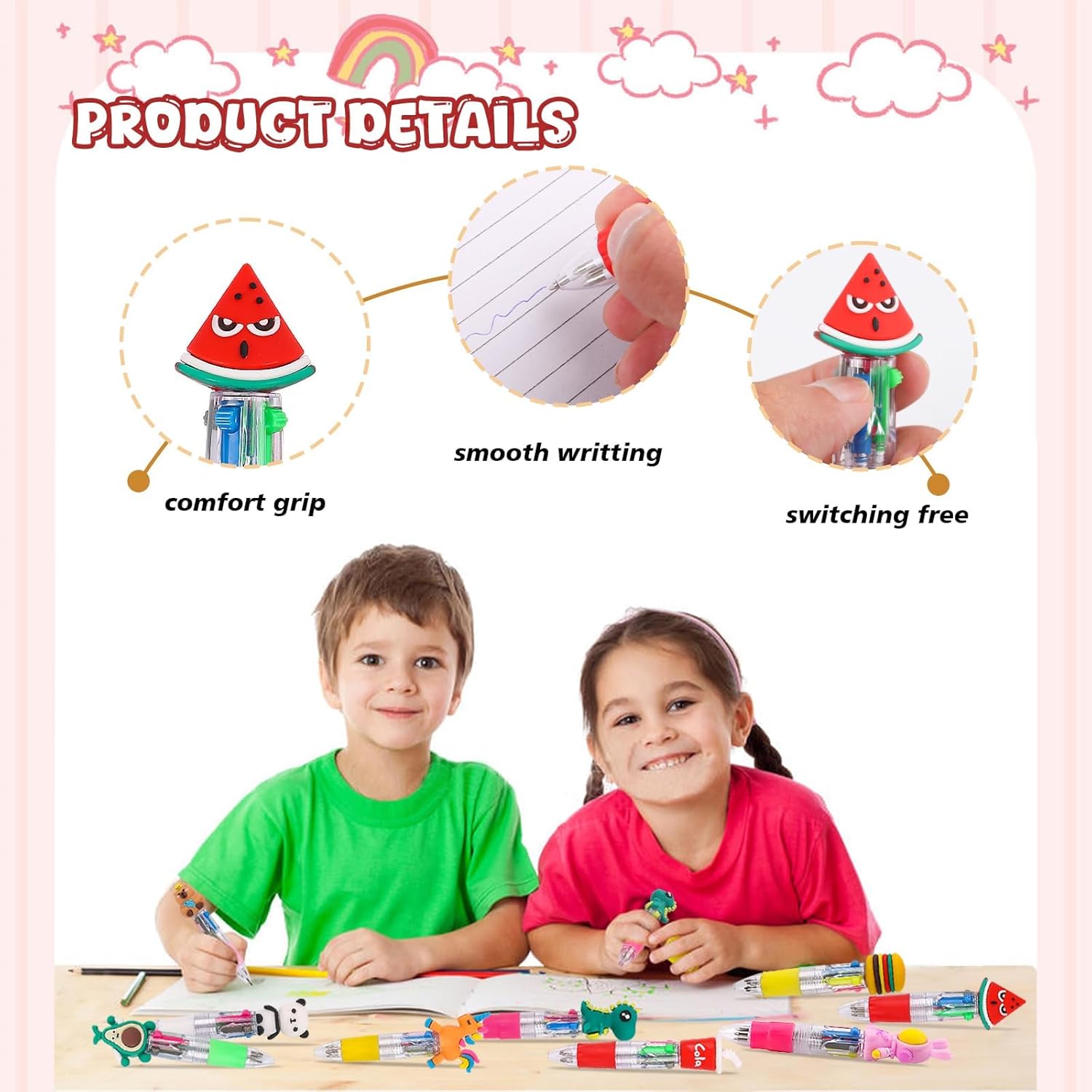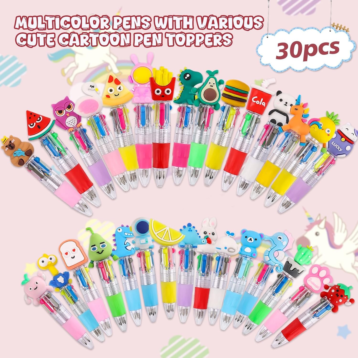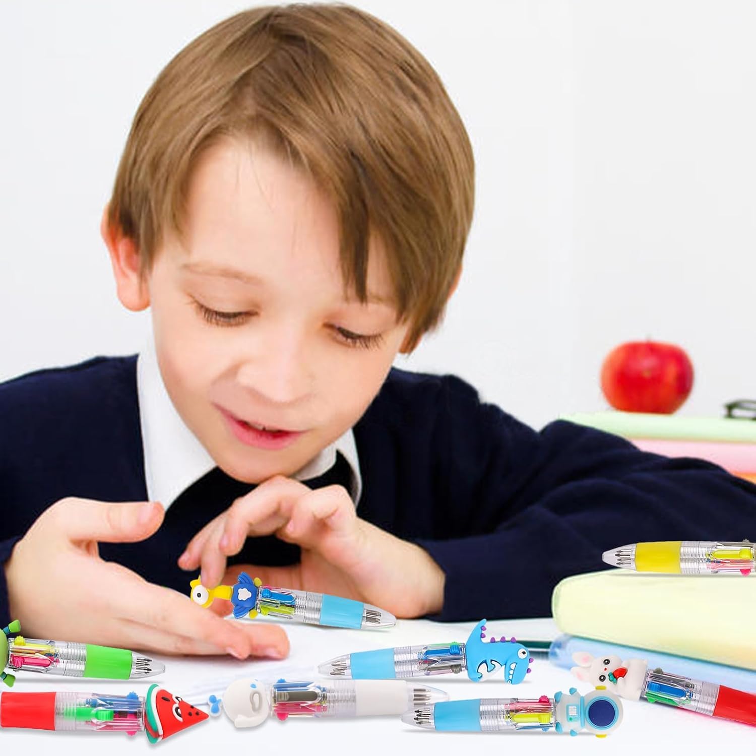 【Penne multicolore per bambini】Il set include 30 mini penne a sfera multicolore con 30 motivi diversi, tra cui dinosauri, gufi, squali, unicorni e altri simpatici stili di cartoni animati, aggiungendo divertimento illimitato alla tua vita! 【Efficienti e adatte ai bambini】Le penne colorate sono progettate appositamente per i bambini. Il corpo della penna più corto offre una presa comoda per i bambini. È anche possibile cambiare il colore a piacimento per scrivere in modo creativo, il che aumenta il divertimento dei bambini nella scrittura e riduce il carico di lavoro per i genitori. 【Scrittura fluida】La penna a sfera combina quattro colori di inchiostro in uno e la fluidità della scrittura garantisce una scrittura precisa senza sbavature o sbavature sulla carta. 【Regalini Fine Festa di Compleanno】Penne colorate in quattro tonalità vivaci (blu, rosso, verde e nero) che i bambini possono cambiare a piacimento, con simpatici cappucci per ispirare la loro creatività e il loro interesse per l'apprendimento. 【Regalo creativo】Questo set di penne a sfera colorate è un regalo perfetto per i bambini, ottimo per aggiungere colori unici a varie feste.