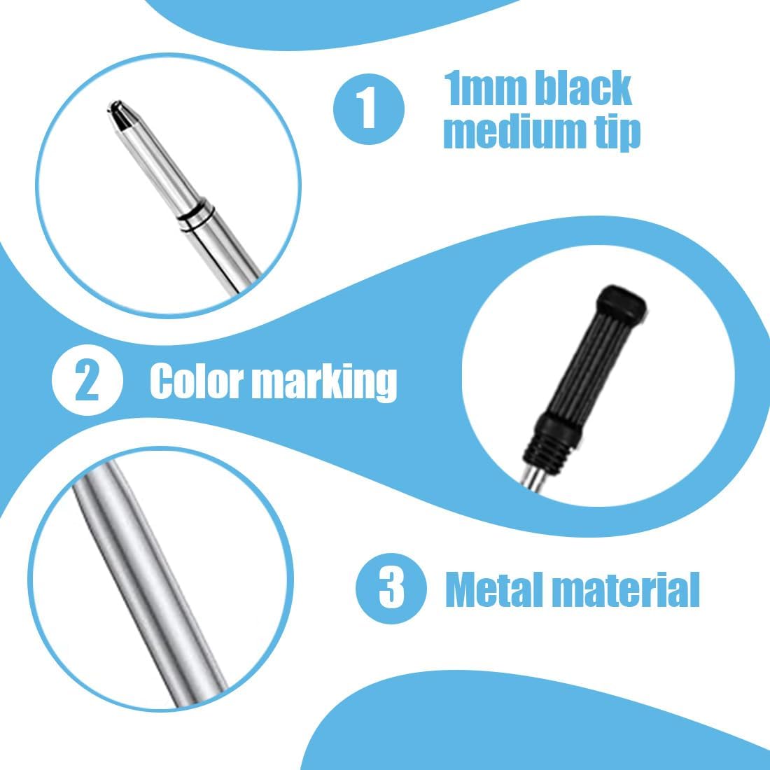 【Confezione pratica】: la confezione contiene 30 ricariche di inchiostro, sufficienti per l'uso quotidiano. Potete conservarne alcune nel vostro studio o ufficio oppure condividerle con compagni di classe o amici. 【Materiale metallico】: il rivestimento della ricarica per penna è realizzato in metallo di alta qualità, anche l'inchiostro all'interno è di alta qualità, con un'elevata resa cromatica e scorre in modo uniforme, rendendo l'intera ricarica molto resistente e consentendo di scrivere sulla carta senza intoppi. 【Scrittura fluida】: le nostre ricariche per penne a sfera sono realizzate con materiali di alta qualità, con una superficie lucida e una buona consistenza. Grande capacità, puoi scrivere a lungo. 【Asciugatura rapida】: l'inchiostro di alta qualità da 1,0 mm garantisce un flusso regolare e un'esperienza di scrittura eccellente. L'inchiostro scorrevole scrive in modo uniforme sulla carta senza sbavature o colature e aiuta a mantenere pulite le mani e i polsini. 【Ampia applicazione】: le ricariche per penne a sfera in metallo sono adatte per la scuola, l'ufficio e la casa. Ideali per scrivere, prendere appunti, annotare, documentare, disegnare e altro ancora.