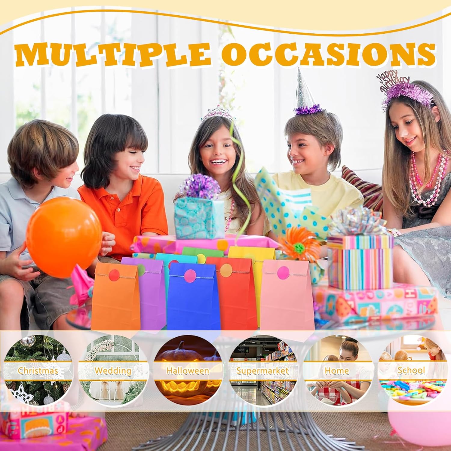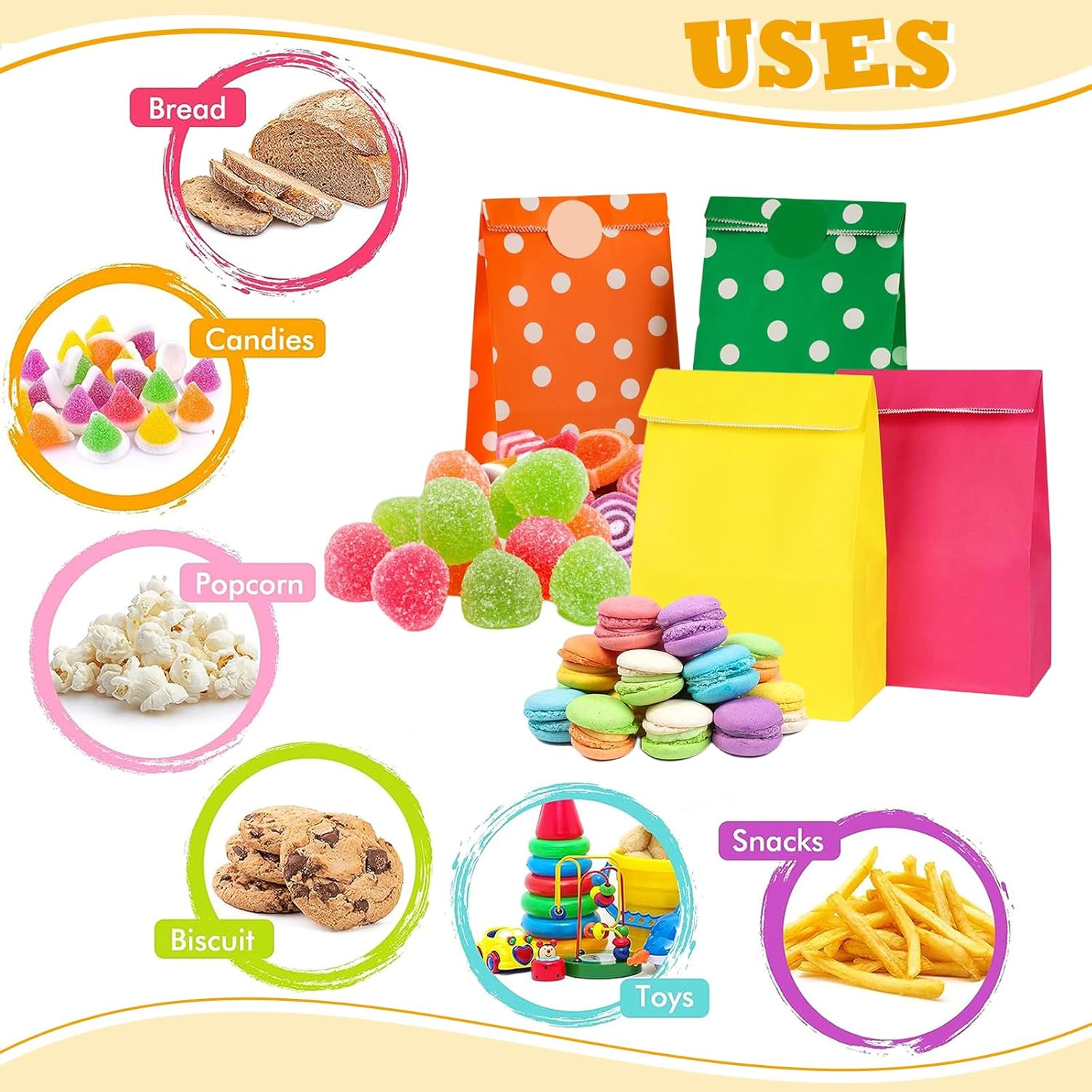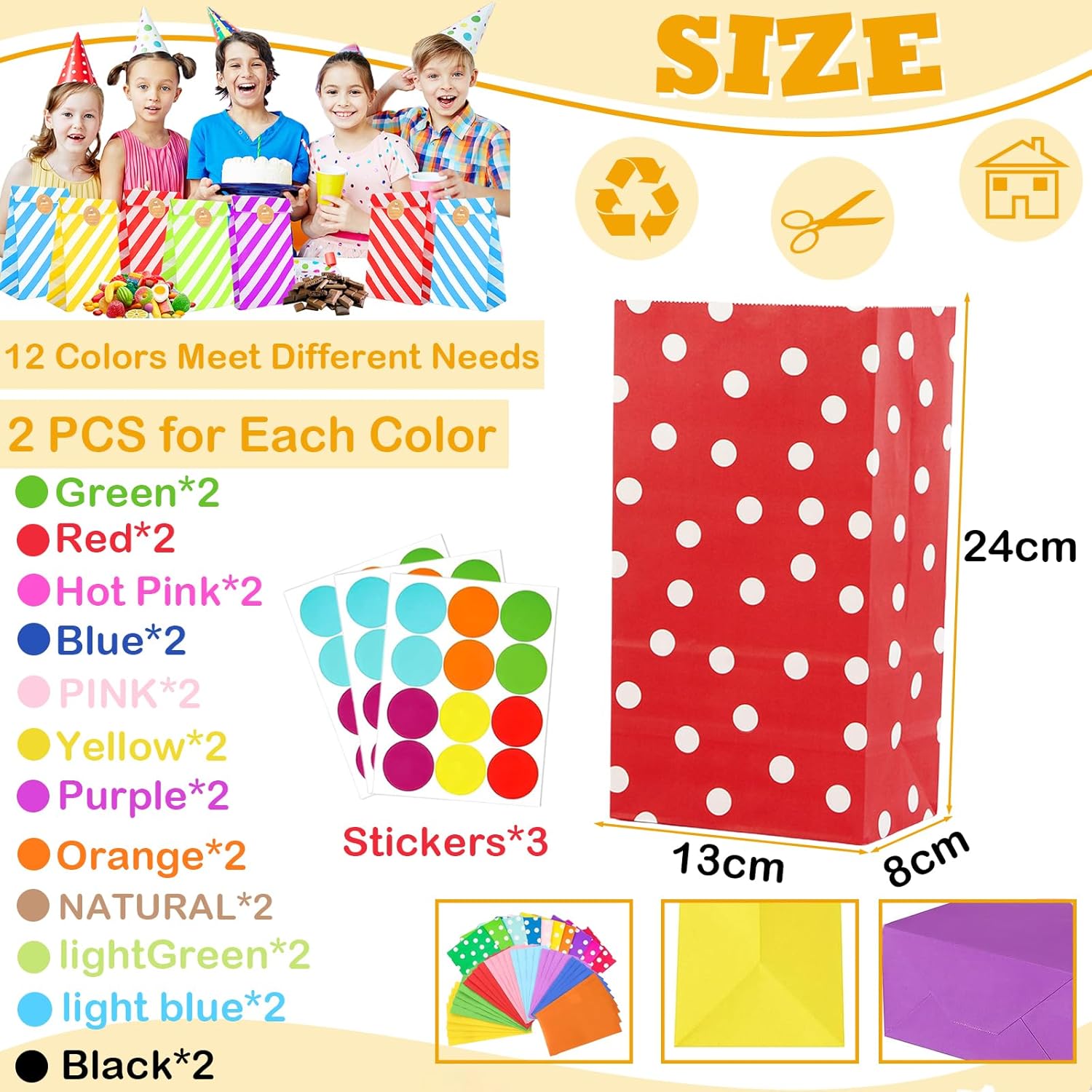Materiale: il nostro sacchetto di carta colorato è realizzato in carta kraft, resistente e infrangibile. Inoltre, la carta ecologica è riciclabile e biodegradabile, quindi puoi usarla in sicurezza. Dimensioni: 24 x 13 x 8 cm per sacchetto di carta aperto. Il design del fondo pieghevole consente alla borsa di stare in piedi in modo indipendente, ideale per l'uso come borsa per coppie e anche facile da trasportare. Multifunzionale: il piccolo sacchetto di carta è adatto per piccoli regali, giocattoli, snack, biscotti, popcorn, pane e caramelle. Possono essere utilizzati come sacchetti regalo, sacchetti per caramelle, sacchetti per feste, sacchetti per snack, sacchetti per panini, sacchetti per buffet, sacchetti da asporto, sacchetti per il pranzo, ecc. Ampia applicazione: il sacchetto per feste in carta è adatto per feste di compleanno, baby shower, matrimoni, Natale, Halloween, addii al nubilato, San Valentino, Pasqua, Ringraziamento o altre feste. È adatto anche per l'artigianato e le attività dei bambini come burattini, pinata, corone di carta, vasi di colori, ghirlande, cestini, ecc. La confezione include: 30 sacchetti di carta e 36 adesivi, sufficienti per l'uso quotidiano.