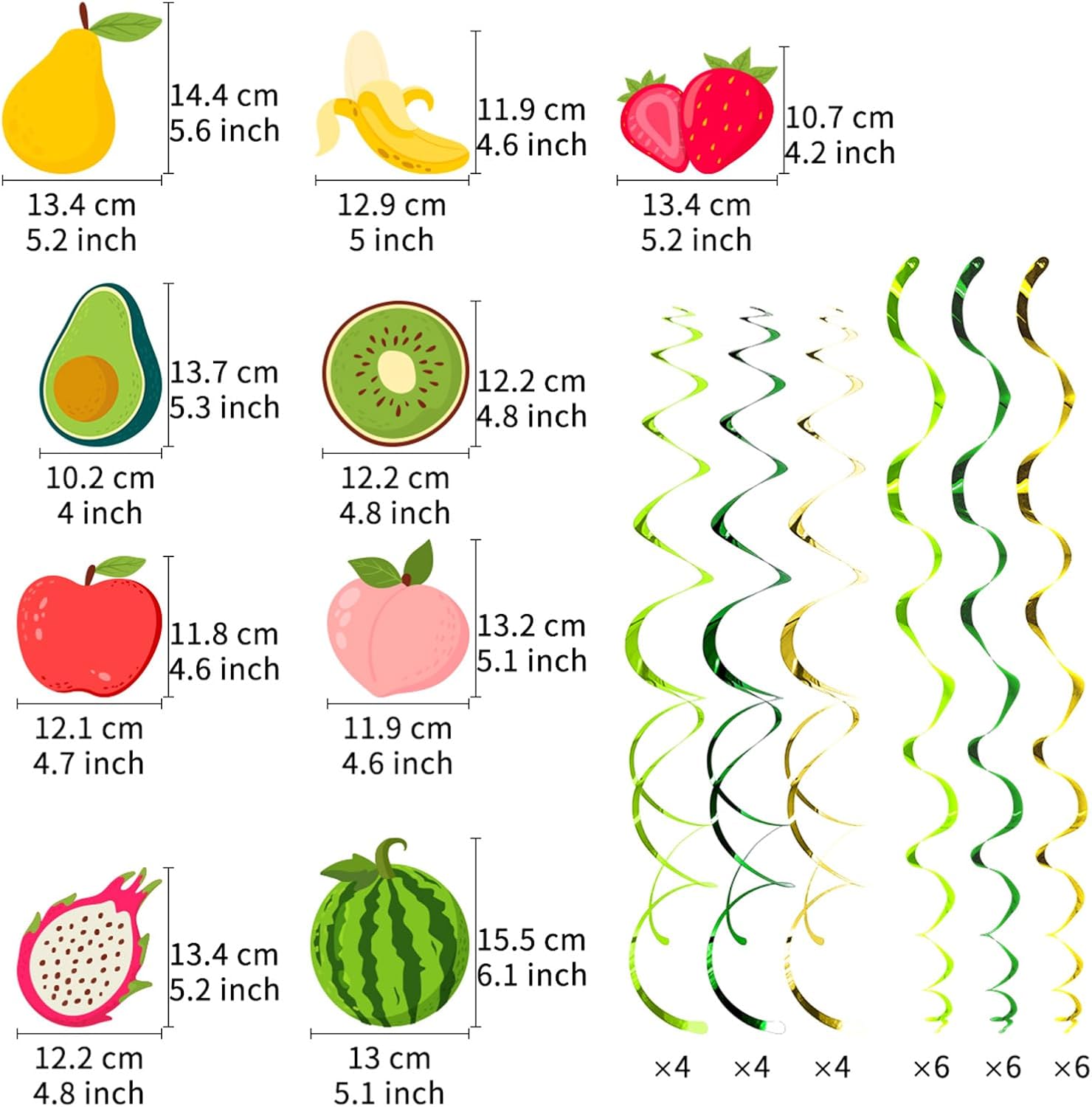 Migliora l'atmosfera delle tue feste con le nostre decorazioni a spirale da appendere, un'aggiunta luminosa a qualsiasi celebrazione a tema frutta che promette di attirare i tuoi ospiti Veloce e facile da installare, questi vortici da appendere offrono una soluzione di rilascio di disordine alle decorazioni per feste, consentendo di trascorrere più tempo a festeggiare e meno tempo a decorare Trasformare il tuo spazio in una scena di frutta, adatta per feste, compleanni o eventi, creando un ambiente felice che sia adatto per condividere i social media Adatto per i genitori che pianificano una prima festa di compleanno o baby shower, queste decorazioni a forma di frutta sono adatte anche a chiunque cerchi di aggiungere un tocco di fascino al loro evento Realizzati con materiali, questi vortici colorati presentano 18 ritagli unici a doppia stampa di frutti lussureggianti, abbinati a 30 vortici scintillanti per un display dinamico e festivo