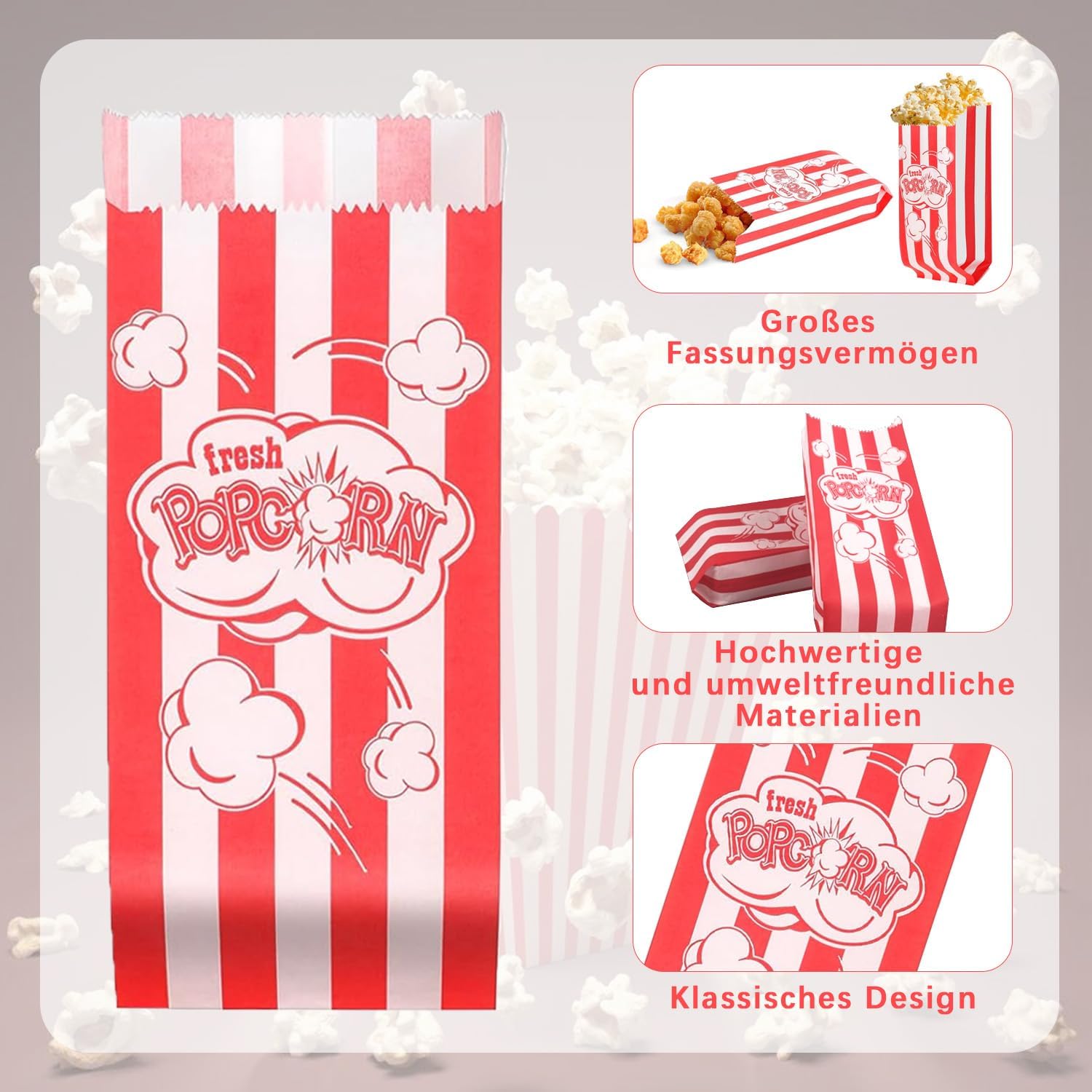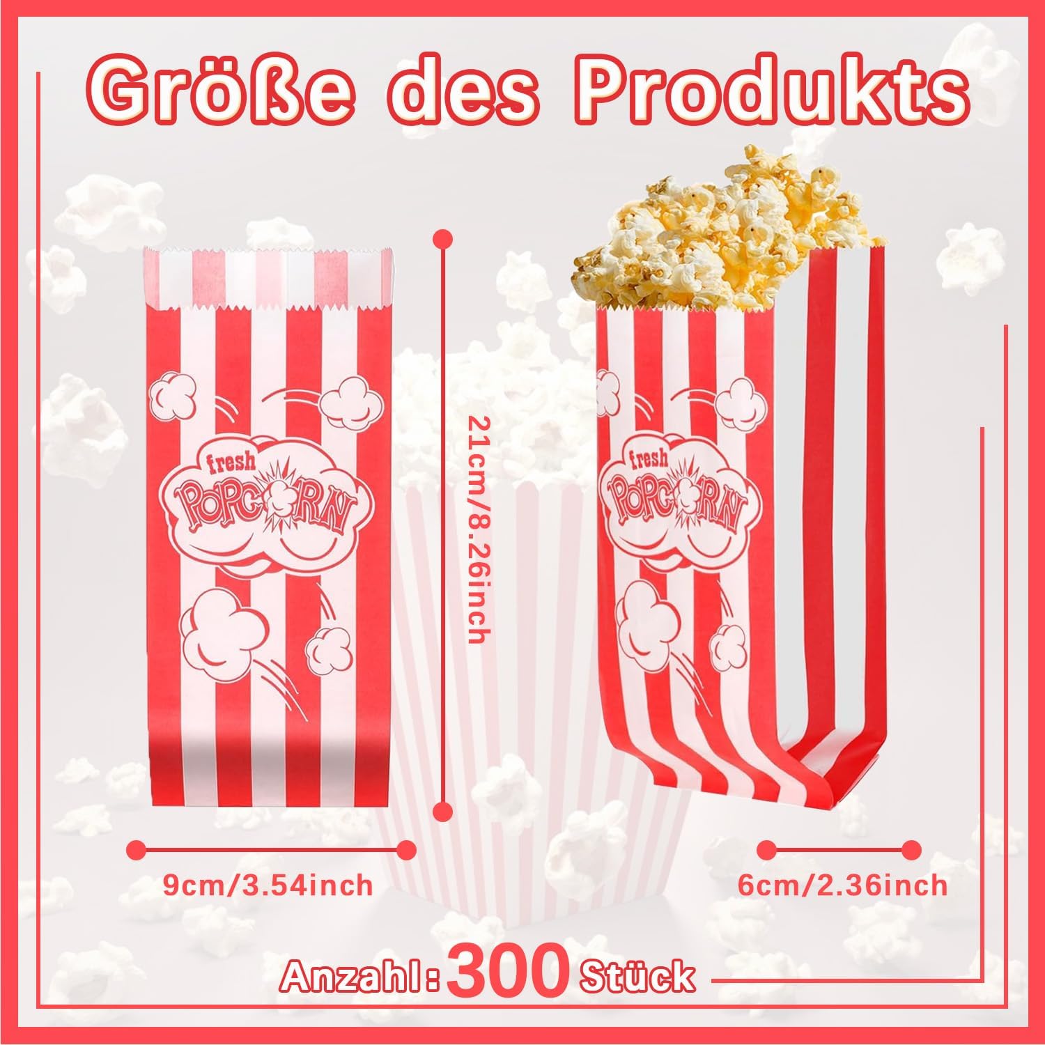 Materiale di alta qualità: i sacchetti per popcorn sono realizzati con carta oleata di alta qualità per alimenti: sicura, affidabile, repellente al grasso e a prova di perdite. Le tazze per popcorn sono innocue per la salute, non contengono sbiancanti ottici e possono essere utilizzate senza esitazione. Anche i popcorn caldi appena preparati non rilasciano sostanze nocive. Nota: i prodotti in carta non sono adatti per l'uso diretto nel microonde. Sacchetti di popcorn classici rossi: riceverai 300 piccoli sacchetti di popcorn in un classico design di colore rosso per mostrare il tuo gusto e la tua personalità unici. Che tu stia godendo una serata al cinema a casa o un picnic all'aperto, aggiungeranno un tocco di stile al tuo evento. Dimensioni perfette: scatola di popcorn 9*6*21 cm. La capacità è abbastanza grande da contenere una varietà di popcorn, caramelle, pasticcini, noci e altri snack, sufficienti per soddisfare le diverse esigenze. Leggeri e facili da trasportare: questi contenitori per popcorn hanno un design pieghevole che li rende facili da riporre e trasportare, perfetti per varie occasioni, in particolare attività all'aperto o viaggi. Quando non vengono utilizzati, possono essere appiattiti e riposti per risparmiare molto spazio e trasportati in modo più semplice ed efficiente, perfetti per confezionare e condividere i pasti. Ampia gamma di usi: i sacchetti di popcorn sono adatti per cinema, concerti, ristoranti, parchi divertimento, bar e altro ancora. Sono ideali anche per feste di compleanno, matrimoni, carnevali, feste del fine settimana, riunioni di famiglia o di amici, Natale e altri eventi.