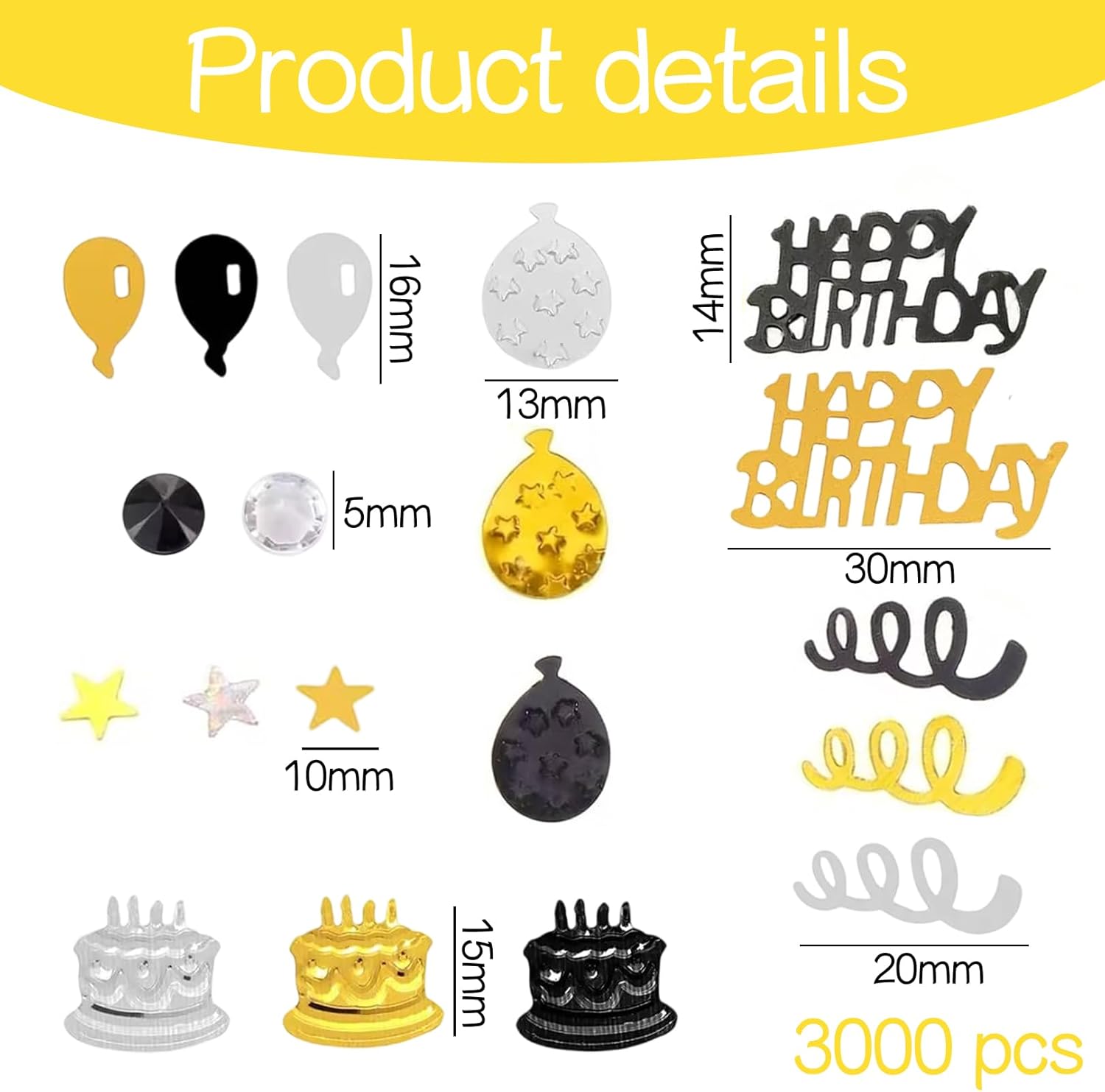 Acquistando questo prodotto, gli acquirenti riceveranno una confezione da 3000 coriandoli compleanno negli eleganti colori nero e oro, perfetti per ravvivare le vostre celebrazioni. I coriandoli sono realizzati con materiali di alta qualità, sicuri e durevoli, garantendo tranquillità nell'uso. Grazie ad un preciso processo di lavorazione, i confetti hanno forme regolari e colori vivaci. Il loro design elegante che unisce nero e oro dona un tocco glamour a qualsiasi decorazione. Questo prodotto è rivolto a tutti coloro che organizzano feste di compleanno, sia per uomini che per donne. Può essere utilizzato anche in occasione di carnevali o altre feste per adulti. I coriandoli possono essere utilizzati per decorare tavoli, piatti, bicchieri, ecc. Ti ringraziamo moltissimo per aver scelto i nostri coriandoli di compleanno. Il nostro team è pronto ad offrirti un servizio di qualità e a rispondere a tutte le tue domande. Che la tua festa sia un successo!