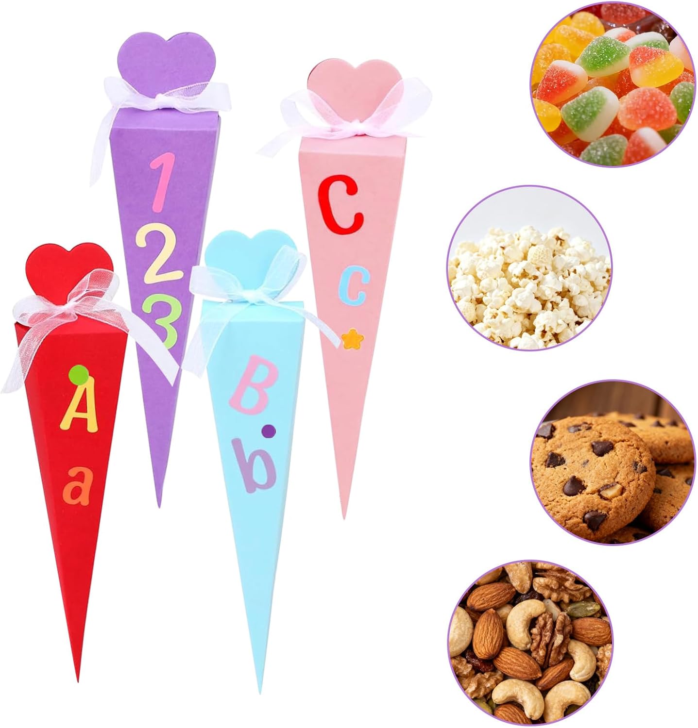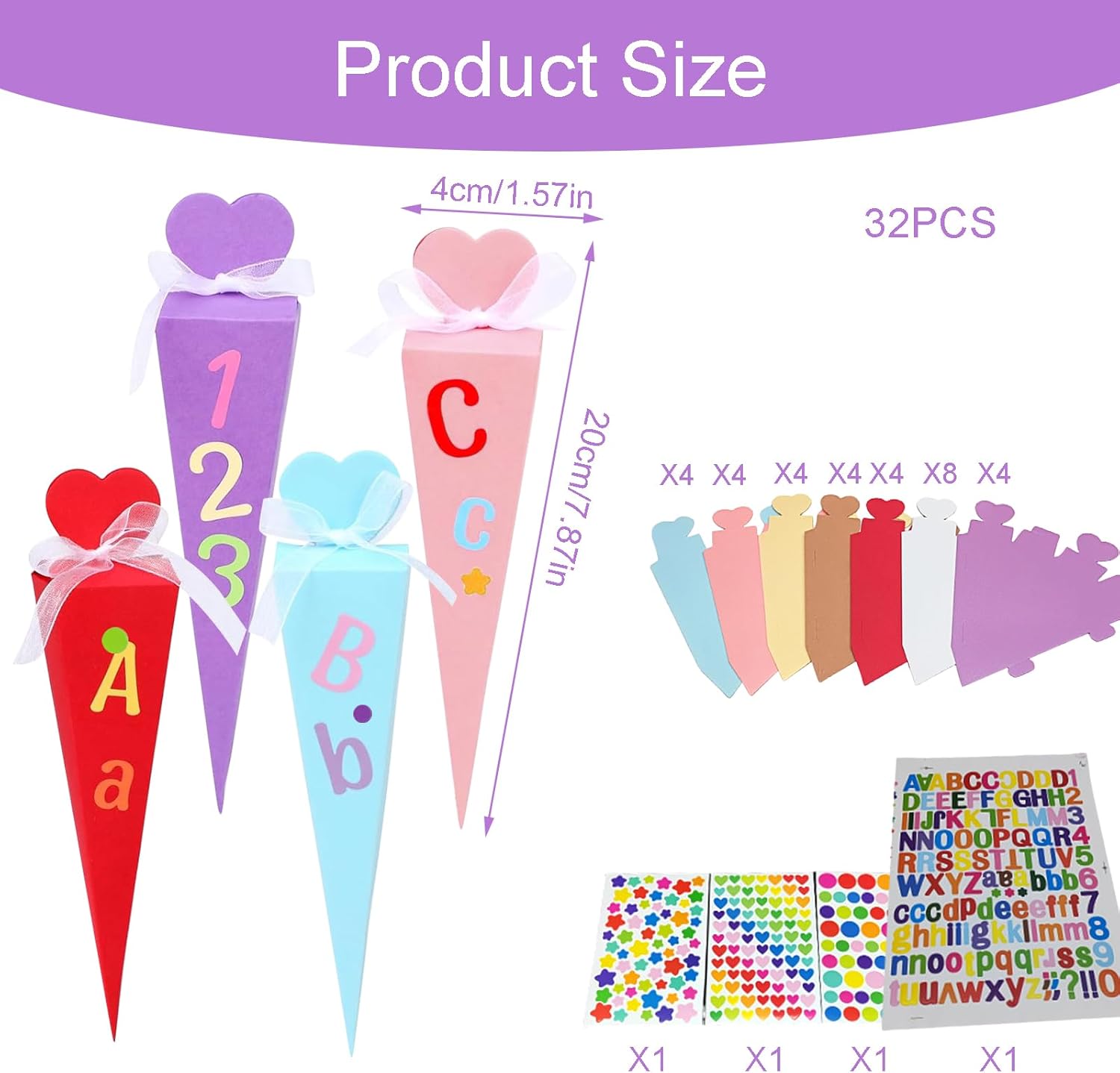 Ampia scelta di design: questo set contiene sette coni di zucchero colorati, adatti a ragazzi e ragazze per sorprendere all'infinito i bambini a scuola Materiali ecocompatibili di alta qualità: realizzati in cartone di alta qualità, superficie liscia, sicuri per l'ambiente, non facili da strappare o sbiadire, garantiscono un uso prolungato Comodo assemblaggio: il design del piccolo cono scolastico è facile da piegare e può essere trasformato in una bellissima confezione di caramelle in pochi semplici passaggi, risparmiando tempo e fatica Ampia applicabilità: quelli piccoli non sono adatti solo come regalo di ingresso, ma possono anche essere usati come Halloween accessori, decorazioni per feste di compleanno e altre occasioni Splendidi adesivi: include quattro adesivi fai-da-te che rendono più semplice per i bambini personalizzare le loro decorazioni e aiutarli a registrare il proprio nome per renderlo più divertente