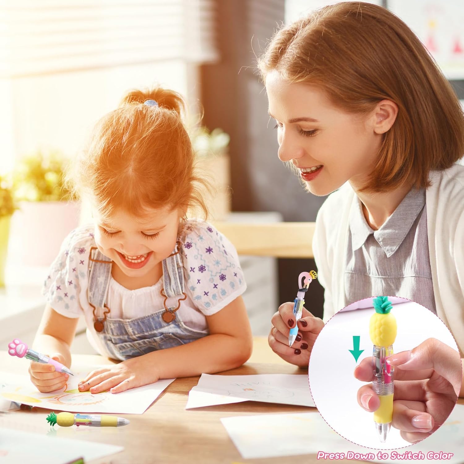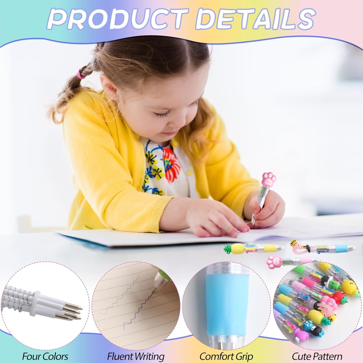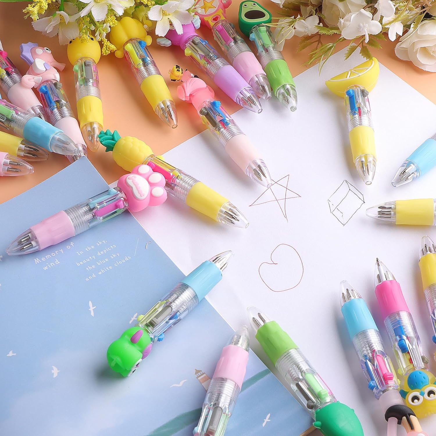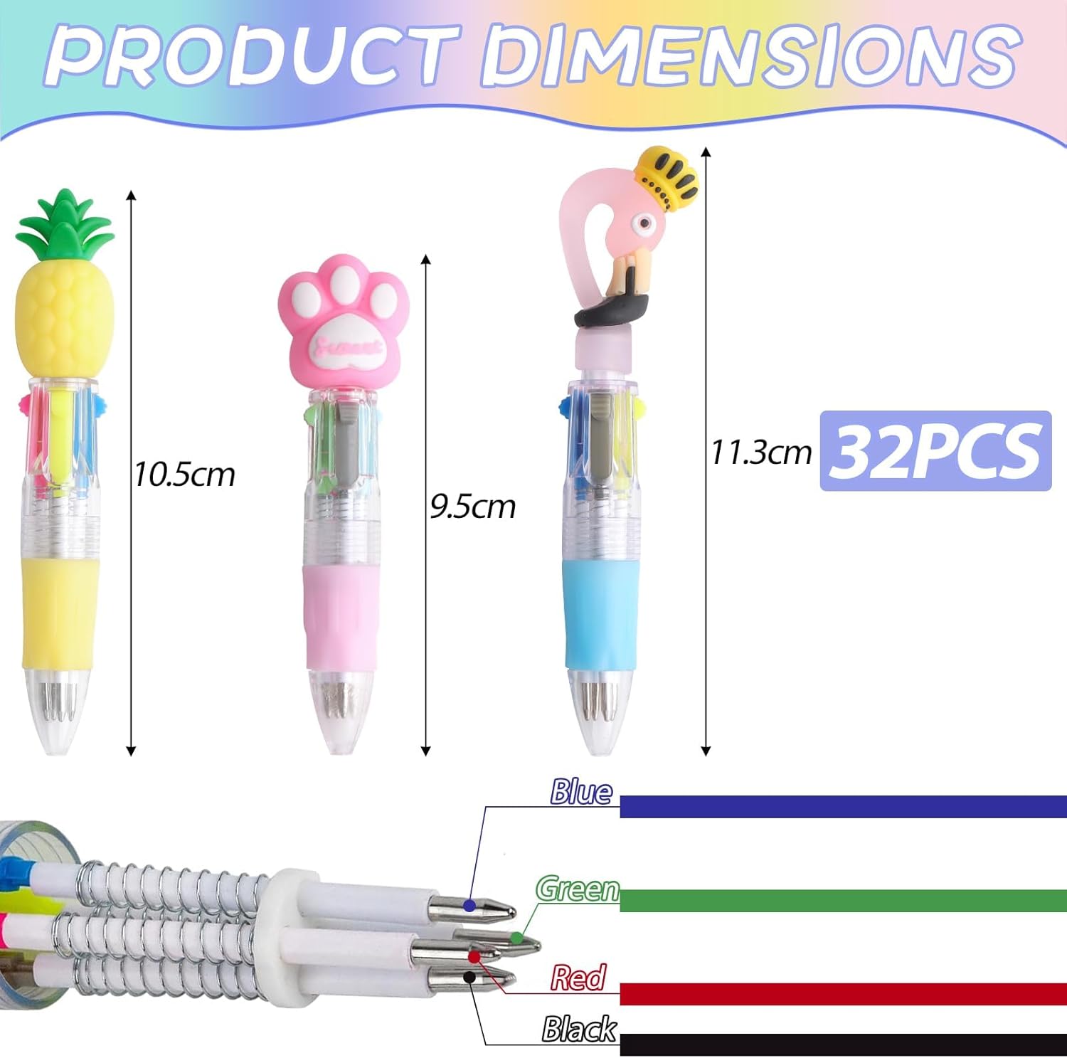 Penna per Cartoni Animati a Colori 4 in 1 - Include un totale di 32 penne a colori retrattili, un vantaggio quantitativo sufficiente. Ogni penna è disponibile in quattro colori (rosso, verde, blu e nero), il che consente di avere una penna con più colori, risparmiare sui costi e i quattro colori possono essere cambiati a piacimento Stili Ricchi - Il simpatico cappuccio della penna in quattro colori ha una funzione staccabile e i modelli sono ricchi e diversi, inclusi frutti e piante come ananas, zucca, avocado e animali come unicorni, fenicotteri, ecc. Le divertenti penne colorate saranno sicuramente amate dai bambini Design Umanizzato - Questo set di bellissime mini penne per cartoni animati è lungo circa 9-10 cm, piccolo e affascinante, facile da trasportare; la penna colorata ha un fusto più spesso e una presa comoda È appositamente progettata per la scrittura dei bambini ed è molto adatta per le piccole mani dei bambini Ampia Gamma di Usi - Questi recinti per animali non possono essere utilizzati solo come regali per gli ospiti in visita in varie occasioni, come feste di compleanno per bambini, riunioni di bambini, premi di classe e altre attività, ma sono anche ideali per far scrivere e disegnare bambini di età diverse; e scarabocchiare Scrivi un'Infanzia Felice - Penne a sfera colorate con varie forme possono stimolare l'interesse e la creatività dei bambini, consentendo loro di registrare attivamente i loro pensieri, sviluppando così buone abitudini di scrittura e dipingendo un bellissimo capitolo per l'infanzia