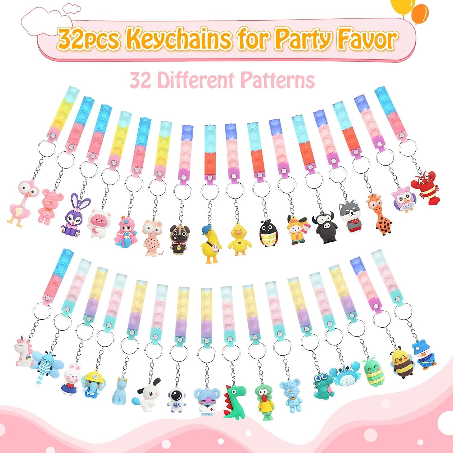 【Gadget compleanno bambini】: 32 pezzi portachiavi animale con pop it per bambini, adatti sia per bambini che bambine. 32 modelli diversi: api, conigli, gufi, sirene, dinosauri, cuccioli, koala, anatroccoli, granchi, astronauti, ecc. 【Portachiavi pop it】: Portachiavi fidget toy per alleviare l'ansia e lo stress. Quando si preme il giocattolo antistress, emette un leggero rumore secco. l'deale per chiunque cerchi un modo divertente e rilassante per passare il tempo. Che tu stia cercando un passatempo veloce o un modo per alleviare lo stress, il portachiavi antistress è quello che fa per te. 【Regalini fine festa compleanno】: Portachiavi regalati agli amichetti partecipanti ad un compleanno che da strumento per alleviare lo stress. È molto apprezzato sia dai bambini che dagli adulti alle feste di compleanno. È adatto anche come premio per gli studenti da parte dei loro insegnanti. 【Materiale】: Il portachiavi gadget compleanno è realizzato in silicone alimentare, senza BPA, atossico e inodore, rendendolo sicuro per i bambini. Morbido e solido, facile da pulire. 【Portachiavi per decorazione】: Decorazione per la vostra borsa, la chiave, l'auto o clip di loro o li appendere ovunque ti piace. Ogni portachiavi gadget bambini ha un gancio che ti consente di tenere attaccate le chiavi o di appenderle come accessorio.