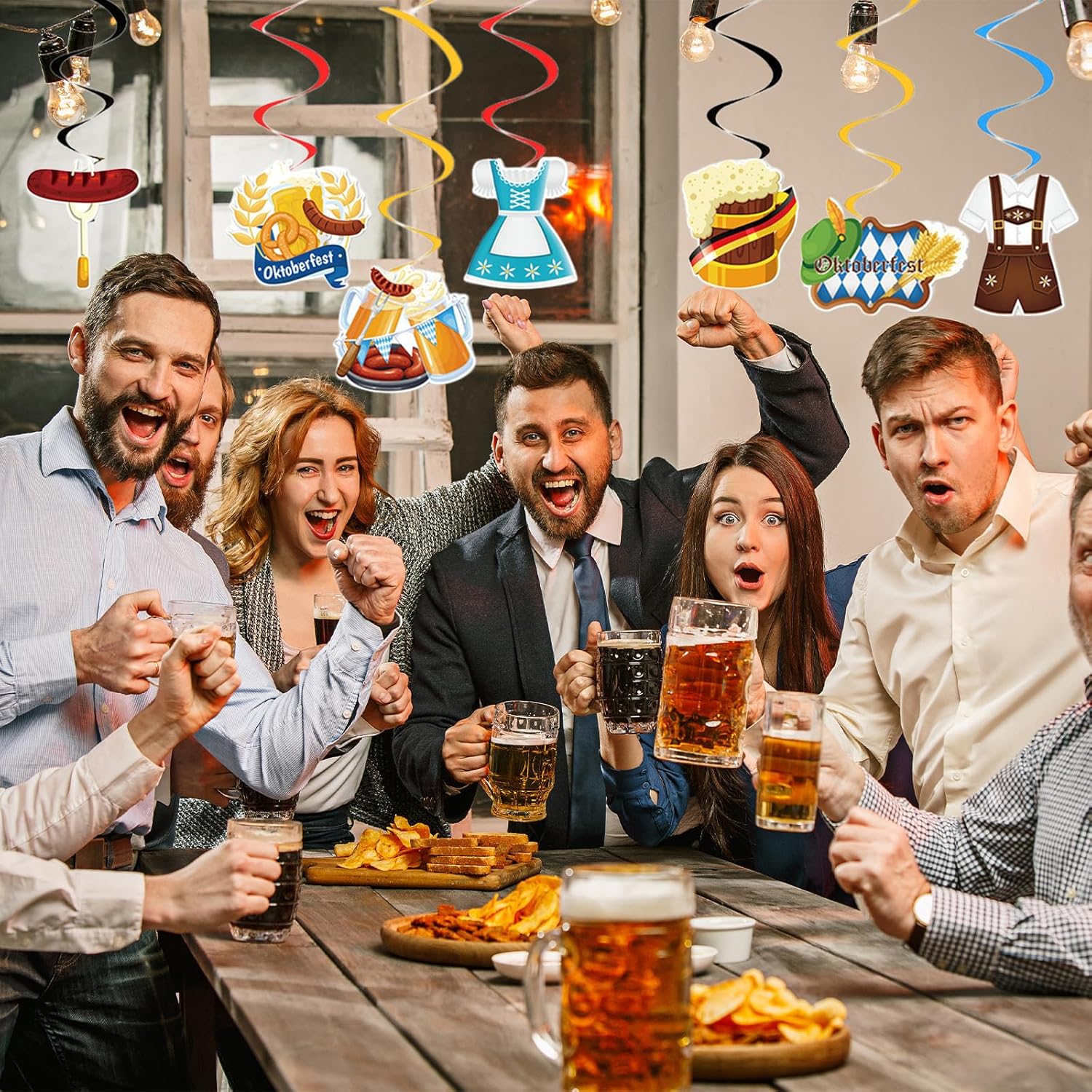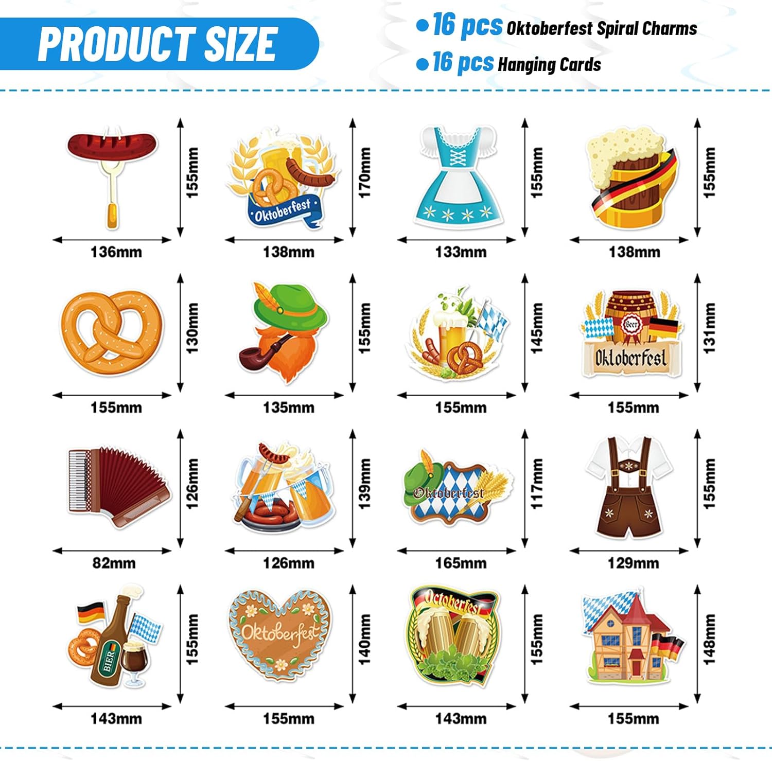 APPLICAZIONE FACILE PER DECORAZIONE RAPIDA: Ogni spirale decorativa e ogni bandiera dell'Oktoberfest è dotata di un foro pre-stampato, rendendo l'installazione particolarmente semplice. Con 32 pezzi, questo set offre abbastanza decorazioni a spirale per il tuo Oktoberfest SALUTO FESTOSO BAVARESE CON "CHEERS PROST": Brinda alla vita e celebra con questa decorazione tipicamente bavarese. La spirale decorativa aggiunge vivacità a ogni decorazione Wiesn e porta gioia a famiglia e amici DESIGN AUTENTICO OKTOBERFEST: La decorazione a spirale è progettata con elementi classici dell'Oktoberfest - come motivi blu e bianchi, brezel e boccali di birra. Perfetta come decorazione bavarese per uso interno o esterno PROMUOVE L'ATMOSFERA FESTOSA: La ghirlanda a spirale dell'Oktoberfest aggiunge più festività alla tua festa. Gli striscioni e i ganci a spirale sono ideali complementi per la tua festa con nastro decorativo bianco-blu creando immediatamente un'atmosfera Oktoberfest VERSATILE PER INTERNO ED ESTERNO: Appendi la ghirlanda a spirale sul soffitto, recinzione, terrazza o come sfondo per foto. Questa decorazione bavarese evoca un'autentica atmosfera da tendone a battesimo, festa o celebrazione Wiesn