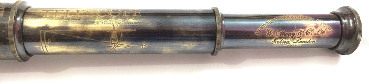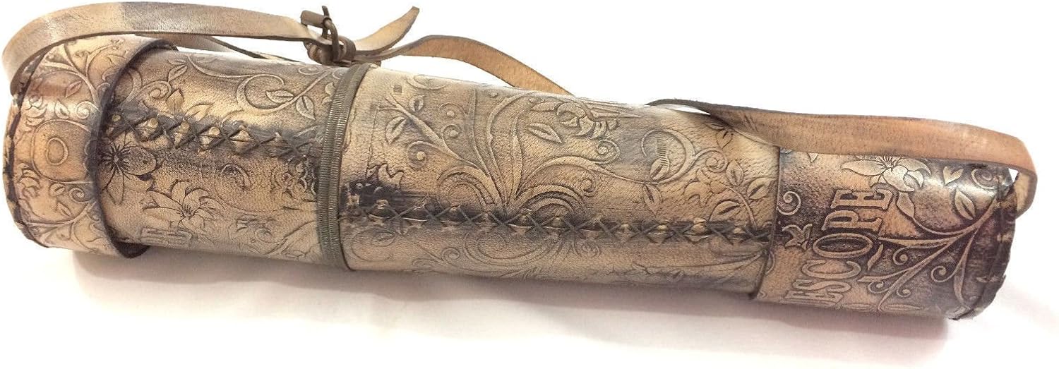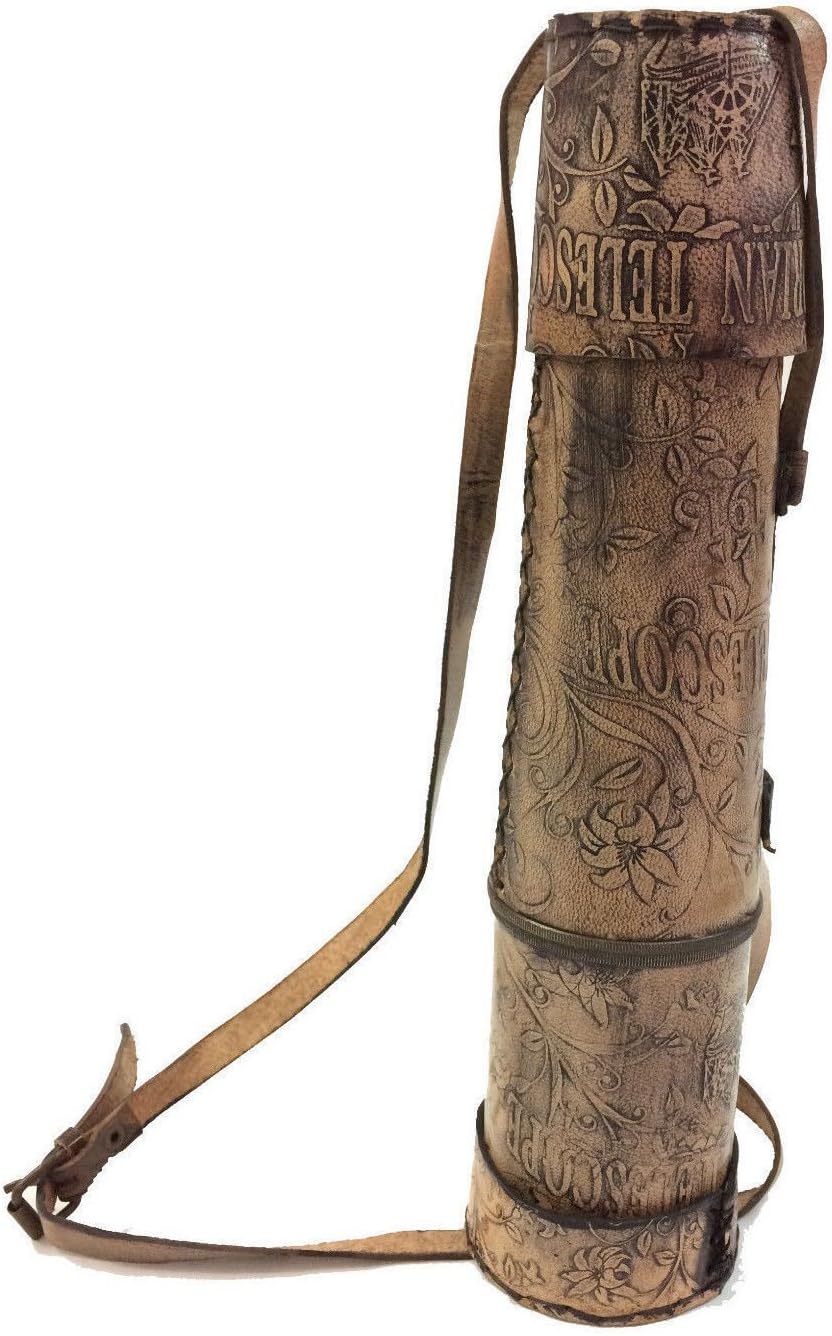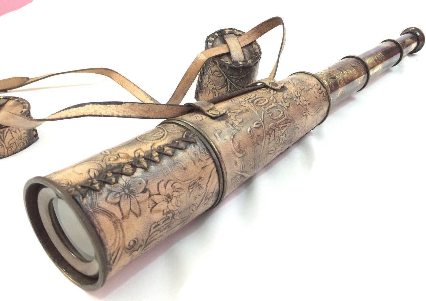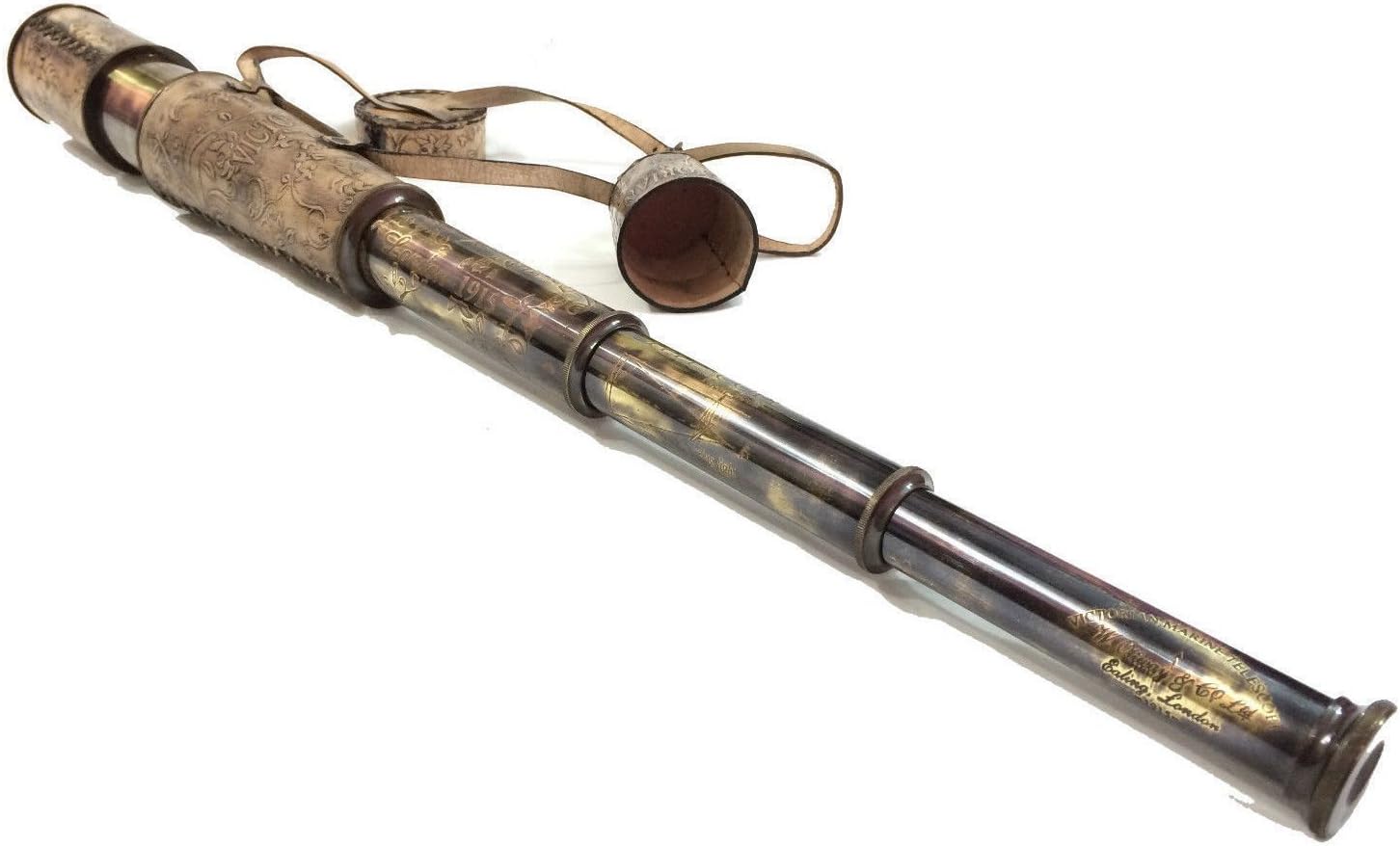 Materiale: ottone e pelle Finitura: marrone antico (come mostrato nell'immagine) Dimensioni: 81,28 cm circa. Telescopio in ottone antico in stile nautico marittimo con parasole in pelle. Si tratta di un articolo di riproduzione, non venduto come antico