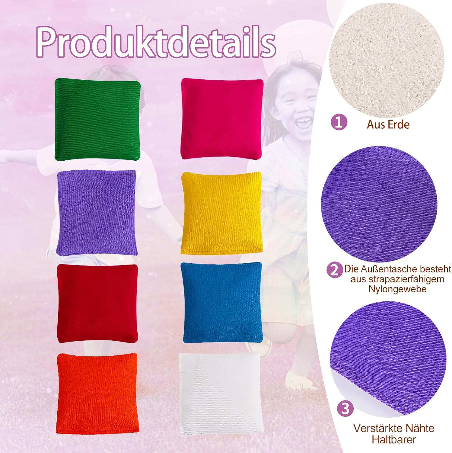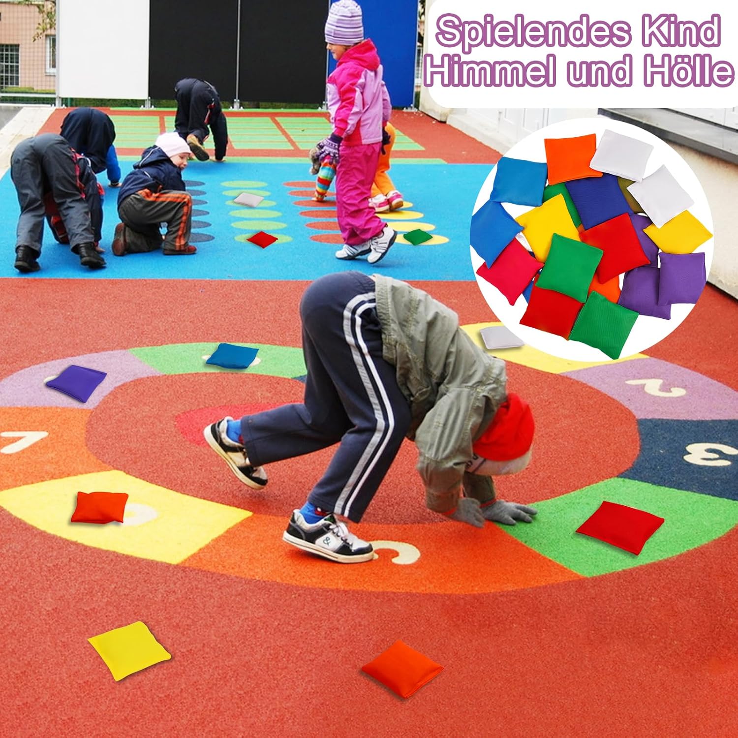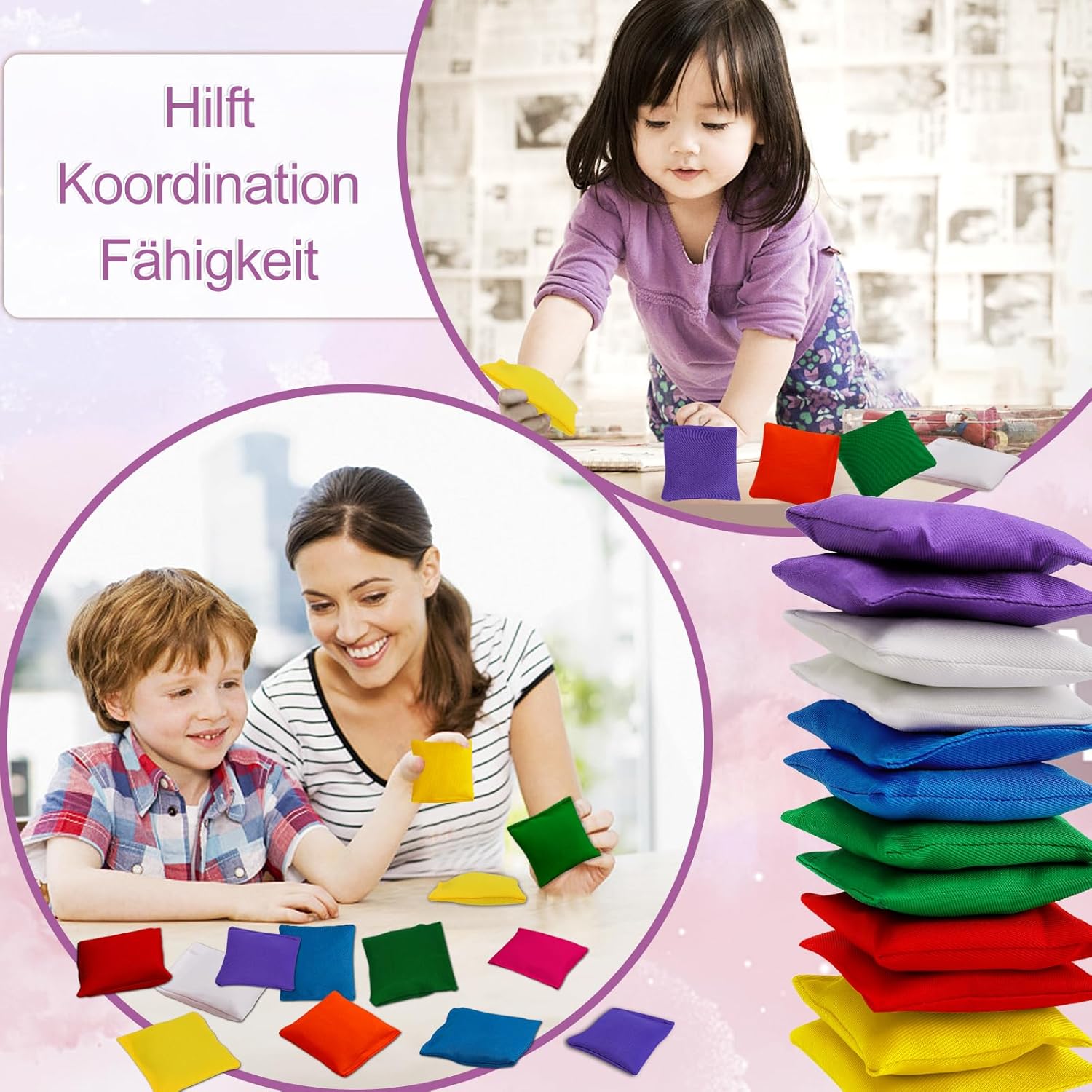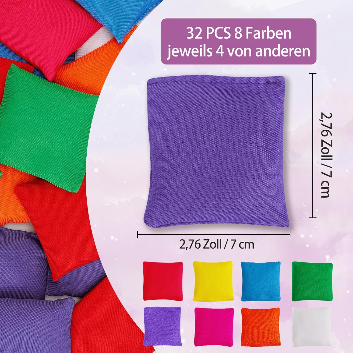 Multicolore: contiene 32 sacchetti in nylon in 8 colori (rosso, giallo, verde, blu, bianco, rosa, arancione e viola), 4 pouf per colore, in modo da avere abbastanza pouf per ogni gioco e aggiungere un tocco di colore al tuo gioco Materiali di alta qualità: questi sacchetti per corno riempiti con granuli ceramici e avvolti in tessuto di nylon sono progettati per non fuoriuscire e strappare. Cuciture rinforzate che li rendono ideali per giochi su erba, sabbia Migliora le capacità di coordinazione: giocando a lanciare e catturare con i nostri sacchi di fagioli, i bambini possono sviluppare la coordinazione occhio-mano e allo stesso tempo rimanere fisicamente attivi. Ottimo regalo: questi pouf compatti sono ideali come regalo per i bambini, ma anche gli adulti li apprezzeranno. Ogni borsa misura 7 x 7 cm, leggera e facile da impugnare per mani piccole Multiuso: questi mini pouf hanno un design compatto che è facile da trasportare, quindi sono ideali per una varietà di occasioni come feste interne ed esterne, giochi di pouf per bambini, riunioni di famiglia