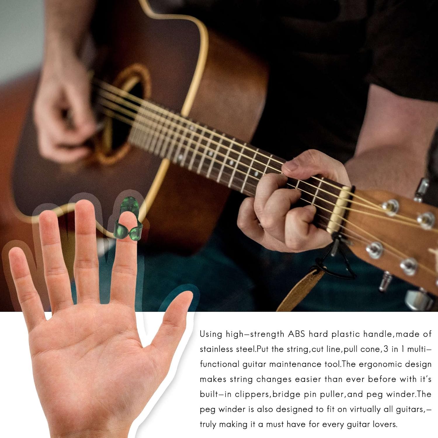 L'avvolgitore di pioli è inoltre progettato per adattarsi praticamente a tutte le chitarre, rendendolo davvero un must per tutti gli amanti della chitarra. 1. Si abbassa tastiera della chitarra a un determinato tasto, i capos accorciano la lunghezza di tutte le corde allo stesso tempo, tutte le corde suonano in tonalità più alte rispetto a il capo. Il pad in silicone proteggerà lo strumento da graffi o danni .Dimensioni leggere e compatte, adatte per insegnanti di musica, giocatori professionisti e principianti. 2.Utilizzando l'impugnatura in plastica ABS ad alta , realizzata in acciaio inossidabile.Metti la corda, la di taglio, il cono di trazione, lo strumento di manutenzione della chitarra multifunzionale .Il design ergonomico rende più facile che mai il cambio delle corde con i suoi tronchesini integrati , estrattore di pin a ponte e avvolgitore di pioli. 3. Le impostazioni predefinite del sintonizzatore per chitarra ti offrono un output preciso, tra cui note e stringhe, per evitare confusione, display digitale LCD con retroilluminazione, che rende facile la lettura, se non utilizzato, il sintonizzatore sarà in 3 minuti dopo lo spegnimento automatico .