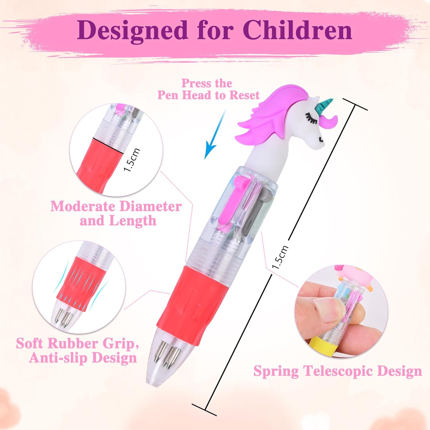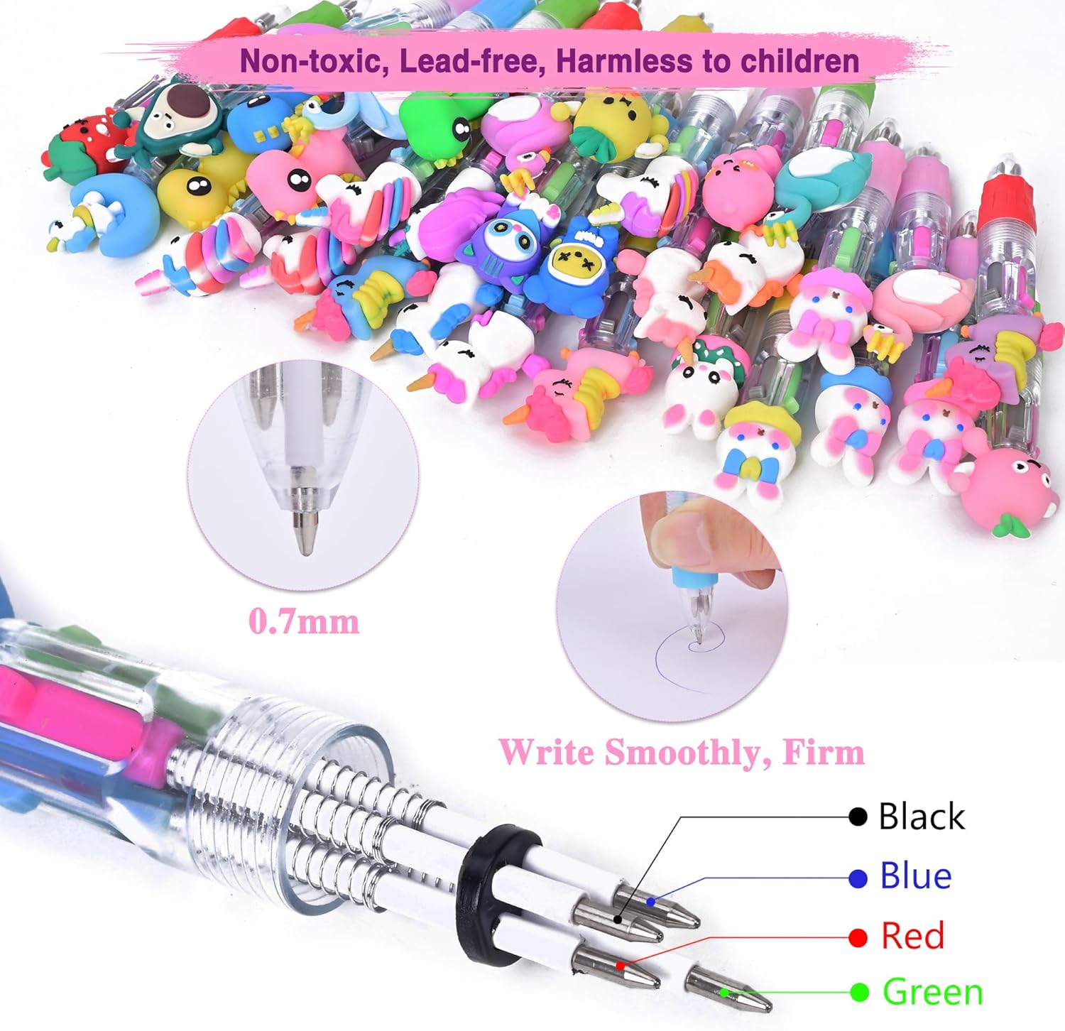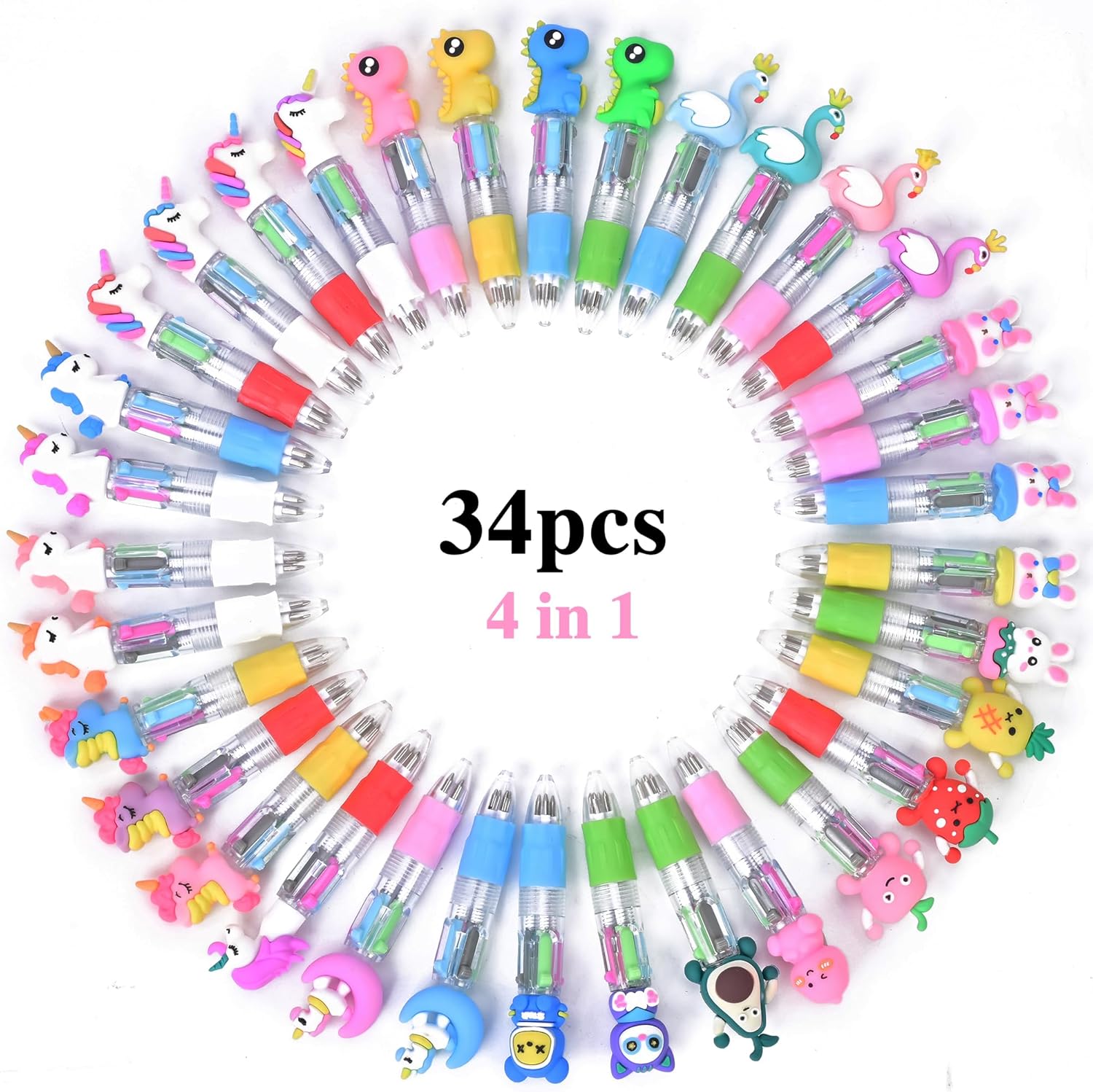 【34 penne a sfera multicolori kawaii 4-in-1】Progettate con adorabili temi a cartoni animati come dinosauri, conigli, unicorni, ecc. Ogni penna ha 4 colori (nero, blu, rosso e verde), che possono essere cambiati liberamente. Queste penne pratiche e divertenti possono aumentare l'interesse dei bambini nell'apprendimento e stimolare la loro creatività. 【Penne Multicolori Progettate per Bambini】Questa penna a quattro colori con motivi cartoon è stata appositamente progettata per i bambini, con dimensioni moderate che la rendono facile da trasportare. La presa in morbida gomma, con un design antiscivolo, offre un tocco confortevole che permette ai bambini di apprezzare la scrittura e il disegno. I vari motivi a cartone animato attraggono l'attenzione dei bambini e li riempiono di gioia. 【Materiale di Qualità e Sicuro】Realizzata con inchiostro di alta qualità, dai colori intensi, non tossica, priva di piombo, senza alcun danno per i bambini. Utilizza una scocca in plastica ABS e una presa in gomma morbida, con una forma innovativa e leggera, adatta per un utilizzo prolungato da parte di studenti o bambini. Può soddisfare le preferenze dei diversi bambini di tutte le età. 【Scrittura Scorrevole】 4 ricariche a punta da 0,7 mm ad alta capacità. Realizzate con inchiostro di alta qualità resistente alla sbiadimento, garantiscono una scrittura fluida e chiara. Adatte per evidenziare informazioni importanti su carta o libri con colori diversi. Il design retrattile a molla consente un cambio rapido del colore con una leggera pressione. 【Ampio Utilizzo】Questa penna a quattro colori con motivi cartoon è perfetta per scrivere, disegnare, prendere appunti ed evidenziare informazioni importanti. È un regalo ideale per bambini, compagni di classe e amici. Ottima anche per feste di compleanno di bambini, Natale, feste in giardino o come premio scolastico o regalo di compleanno.