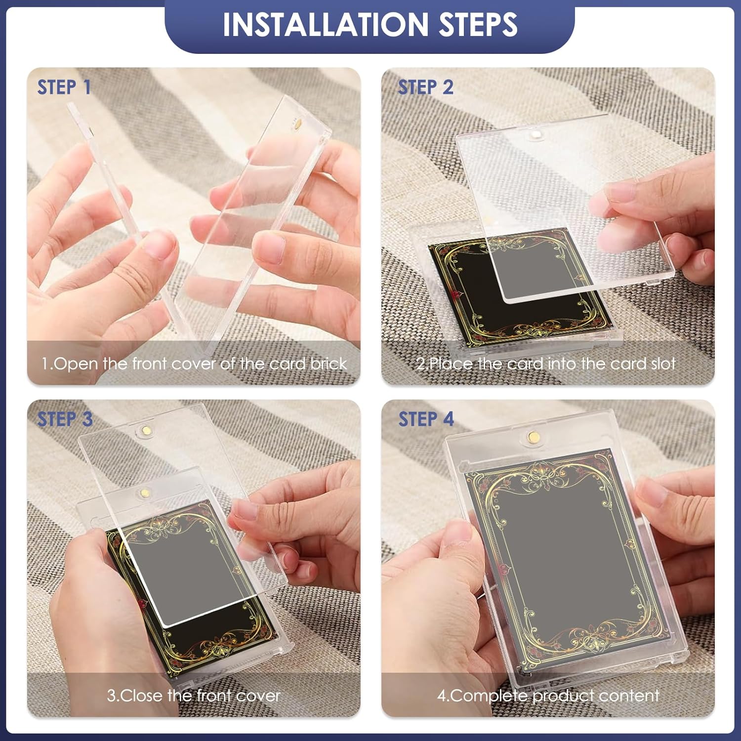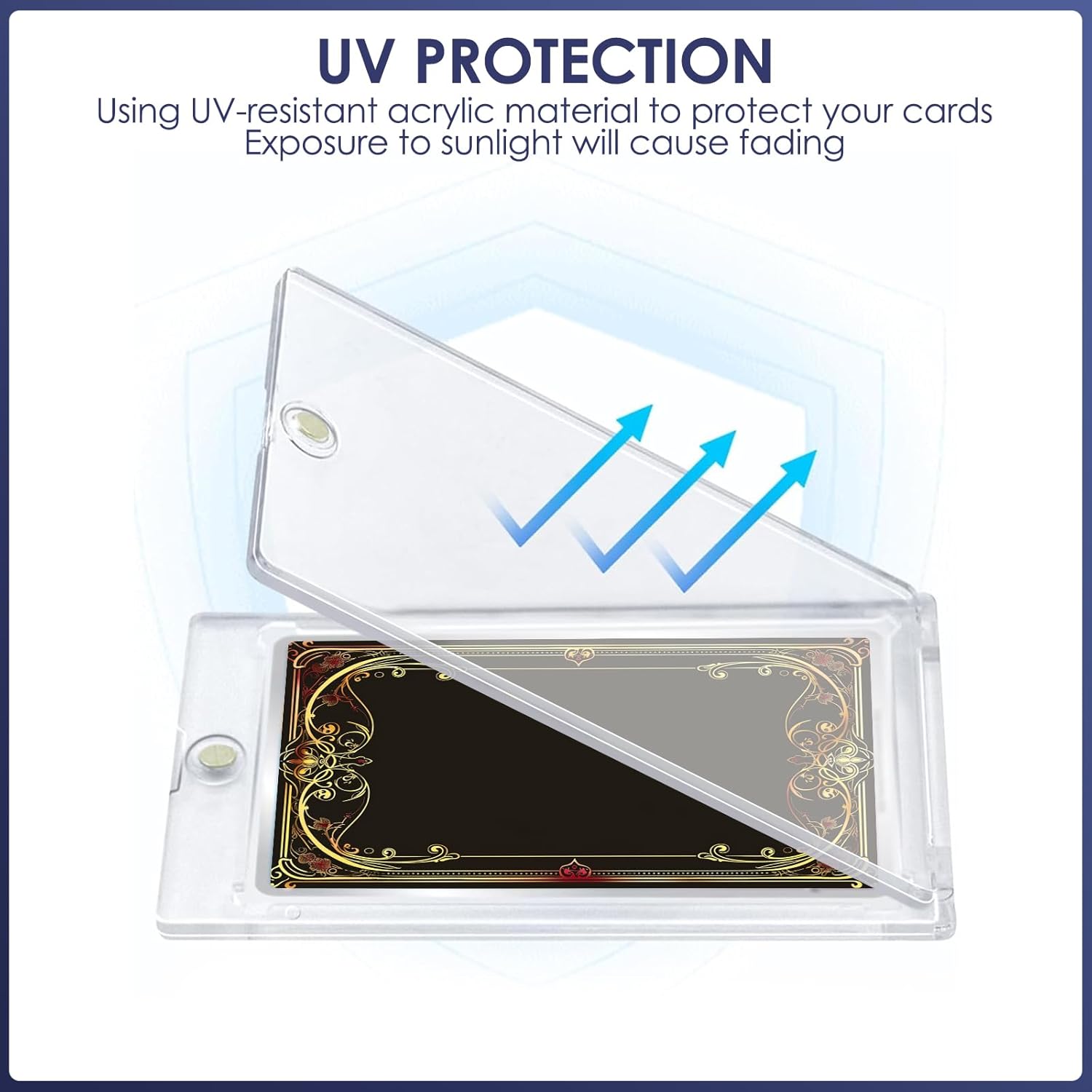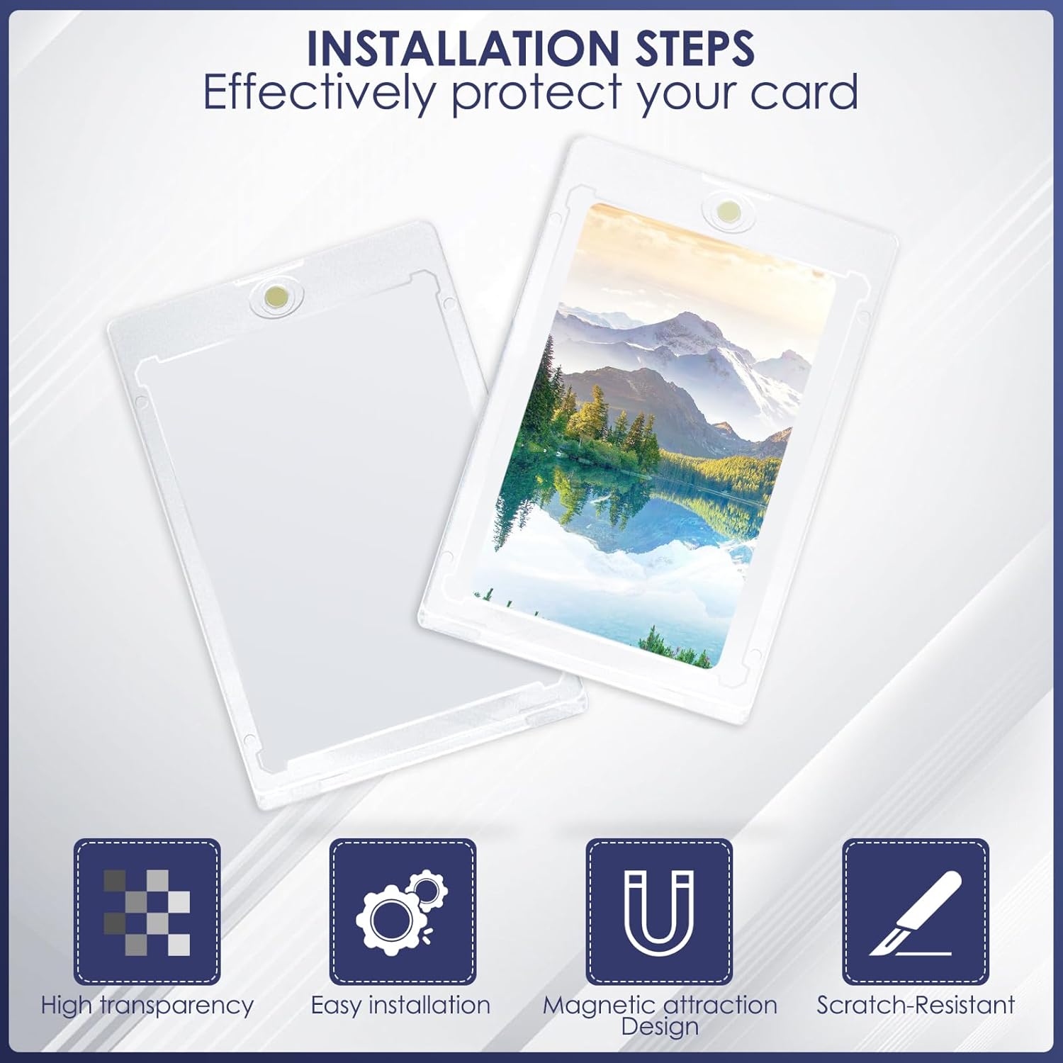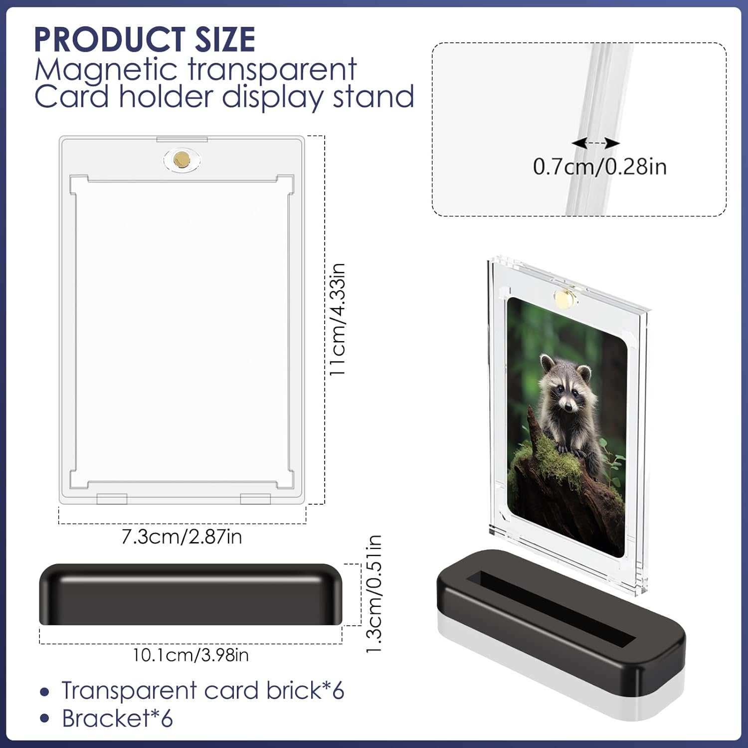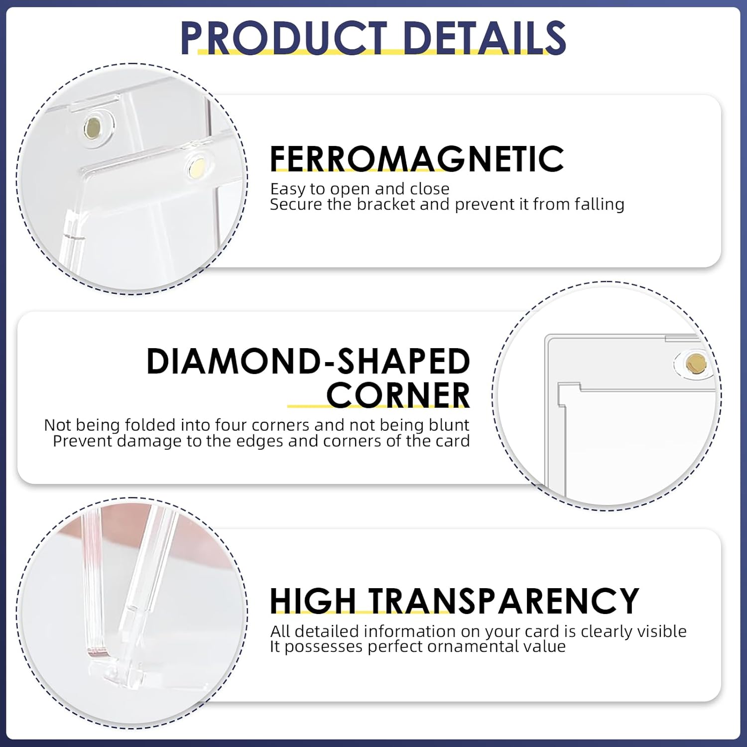 Materiale durevole: il porta carte magnetiche in plastica rigida realizzato in materiale ABS e dotato di protezione UV che impedisce alla carta di sbiadire e assicura che i colori rimangano vivaci per lungo tempo. Il design angolare del supporto magnetico impedisce efficacemente ai quattro angoli della scheda di piegarsi, lasciando intatti i bordi della carta. Chiusura magnetica: il supporto per carte magnetiche è dotato di una chiusura magnetica rotonda sulla parte superiore, che mantiene la carta in modo sicuro ed è facile da aprire e chiudere senza attrezzi. La pellicola protettiva protegge la tua carta da cadute, piegamenti, graffi, impronte digitali, polvere e sbiadimento. Trasparente e trasparente: la custodia per carte è trasparente su entrambi i lati, in modo da poter vedere chiaramente i dettagli della carta senza dover estrarre la carta. Supporta anche la scansione di codici a barre o codici QR. Le informazioni sulla carta nello scomparto per carte sono riconoscibili a colpo d'occhio, consentendo una rapida ricerca e identificazione. Dimensioni della carta: il set include 6 custodie per carte 35PT con 6 supporti neri. Le custodie per carte hanno una dimensione di 10,8 x 7,1 x 0,7 cm, i supporti neri hanno una dimensione di 9,9 x 3,7 x 1,3 cm e possono essere utilizzati con i supporti per carte magnetiche per riporre comodamente carte sportive o da gioco di dimensioni standard (2,5 pollici x 3,5 pollici). Versatile: queste custodie magnetiche 35PT sono perfettamente compatibili con carte TCG, MTG, Yu-Gi-Oh!, sport, calcio, baseball e carte collezionabili. Ideale come regalo di compleanno, premio per i compiti o come regalo per bambini in calze di Natale.