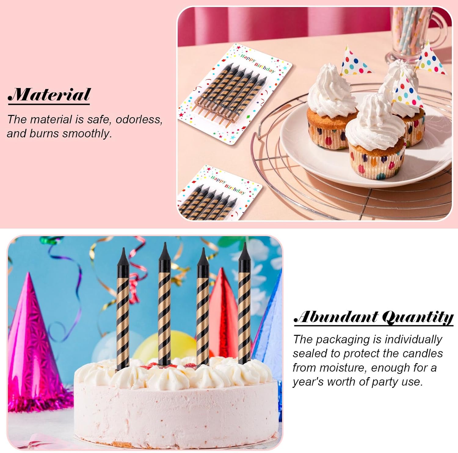 【Pratico accessorio】Questo pacchetto contiene 6 confezioni di candele di compleanno in oro nero, 6 pezzi per pacchetto, per un totale di 36 pezzi, con la base portacandele, facile accesso e posizionamento. Ogni grande candela di compleanno Skinny misura 9 cm e ha un design semplice ed elegante. Materiale sicuro: le nostre candele sottili e lunghe sono realizzate in cera di paraffina di alta qualità per una combustione sicura, inodore e delicata. Le candele della torta con il supporto sono uniformi e compatte, e non è facile produrre lacrime di cera durante la cottura e il tempo di combustione è lungo. (Non lasciare bambini e animali domestici vicini!) Esterno unico: la candela dorata per torta utilizza le strisce spesse nere e dorate del design è unico, nero e oro per mostrare l'atmosfera di lusso. Le nostre candele decorative per cupcake possono decorare la tua torta e migliorare istantaneamente l'atmosfera generale della stanza. Quantità sufficiente: ciascuna delle nostre candele di compleanno in oro nero è sigillata singolarmente per proteggere le candele dall'umidità ed è sufficiente per feste di un anno. Una quantità sufficiente di grandi candele di compleanno skinny può soddisfare molte delle vostre esigenze in una sola volta e vi farà risparmiare la strada per il negozio. Ampia applicazione: le grandi candele di compleanno Skinny sono adatte per la decorazione della casa per creare un'atmosfera calda e romantica. Le candele per torte con supporto possono essere utilizzate anche per occasioni speciali come feste di compleanno, cene a lume di candela, matrimoni, ecc. Per illuminare bei momenti.