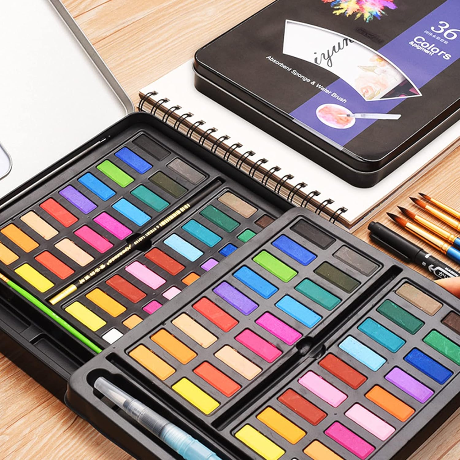 CARATTERISTICHE. Colori ad acquerello solidi di alta qualità, pigmento ad alta concentrazione, finemente macinato, alta saturazione, super assorbimento d'acqua, solubilità in acqua, grande diffusione, colori uniformemente miscelati, non sbiadiscono facilmente. Non tossico e sicuro, si abbina molto a pennelli ad acqua e spugne per diversi effetti di colorazione sorprendenti e unici Diversi colori vivaci. Kit di pittura ad acquerello in 36 colori. Il set multifunzionale da disegno ad acquerello, per ragazzi, ragazze a casa e a scuola, graffiti, artisti pittura di viaggio in movimento Ampia gamma di applicazioni. Ideale per lezioni di arte scolastica, disegni di viaggi all'aperto, Halloween, Natale, matrimonio, decorazione per feste di compleanno, colorazione di uova di Pasqua, arte della parete, pittura ad acquerello/guazzo, scrapbooking, decorazione di album fotografici Meraviglioso set regalo per ragazzi, ragazze, principianti, bambini, studenti per Natale, Capodanno, compleanno, festa dei bambini Set di vernice ad acqua solida. La confezione include: 36 colori solidi acquerelli per custodia; 1 pennello ad acqua; 2 spugne; 1 matita carboncino; 1 libro da colorare, 8 carte per acquerelli, 1 tubo di vernice acrilica, 1 pennello per fodera e Storage Bag
