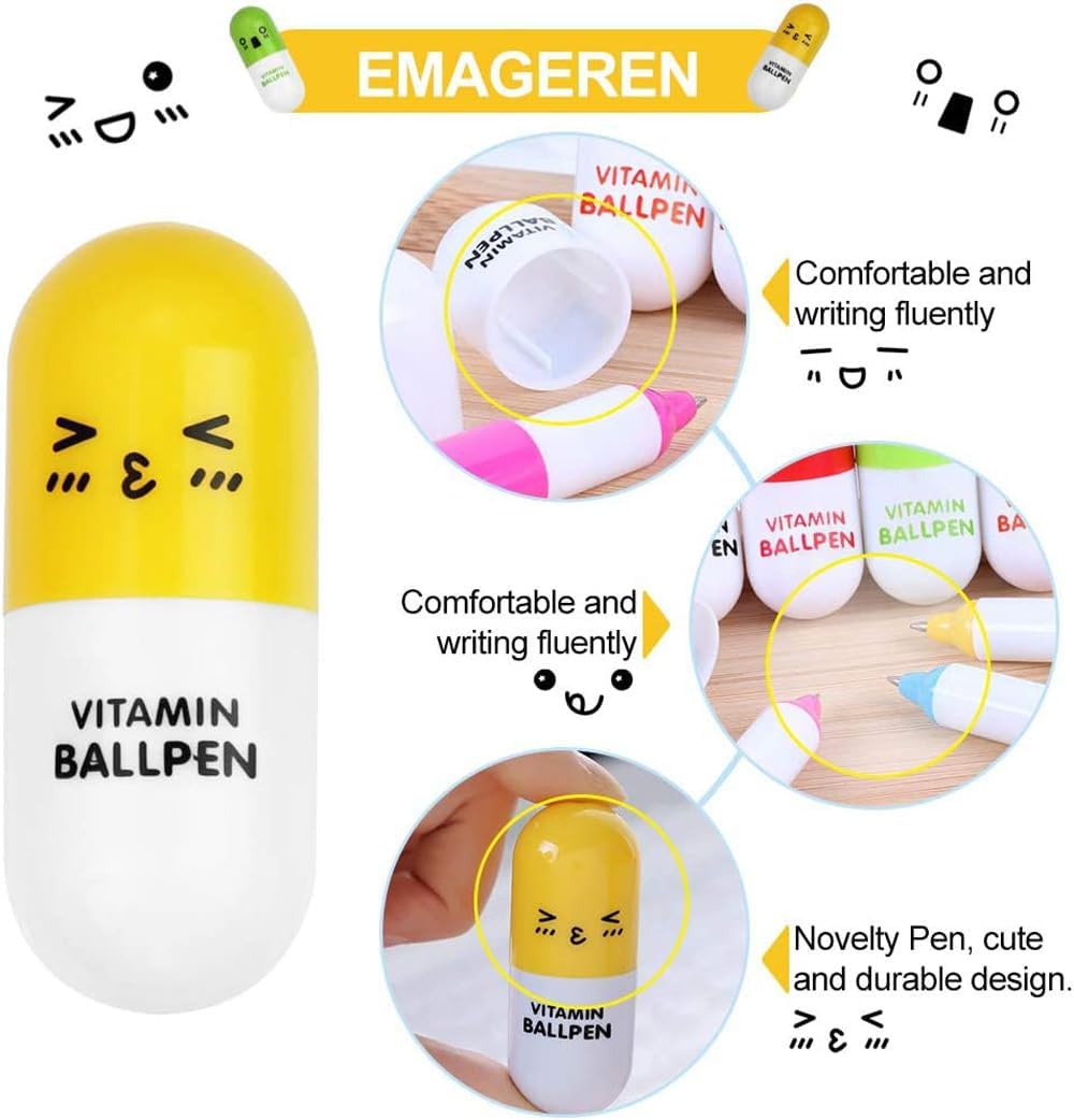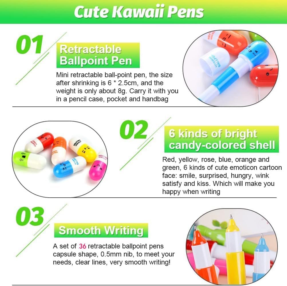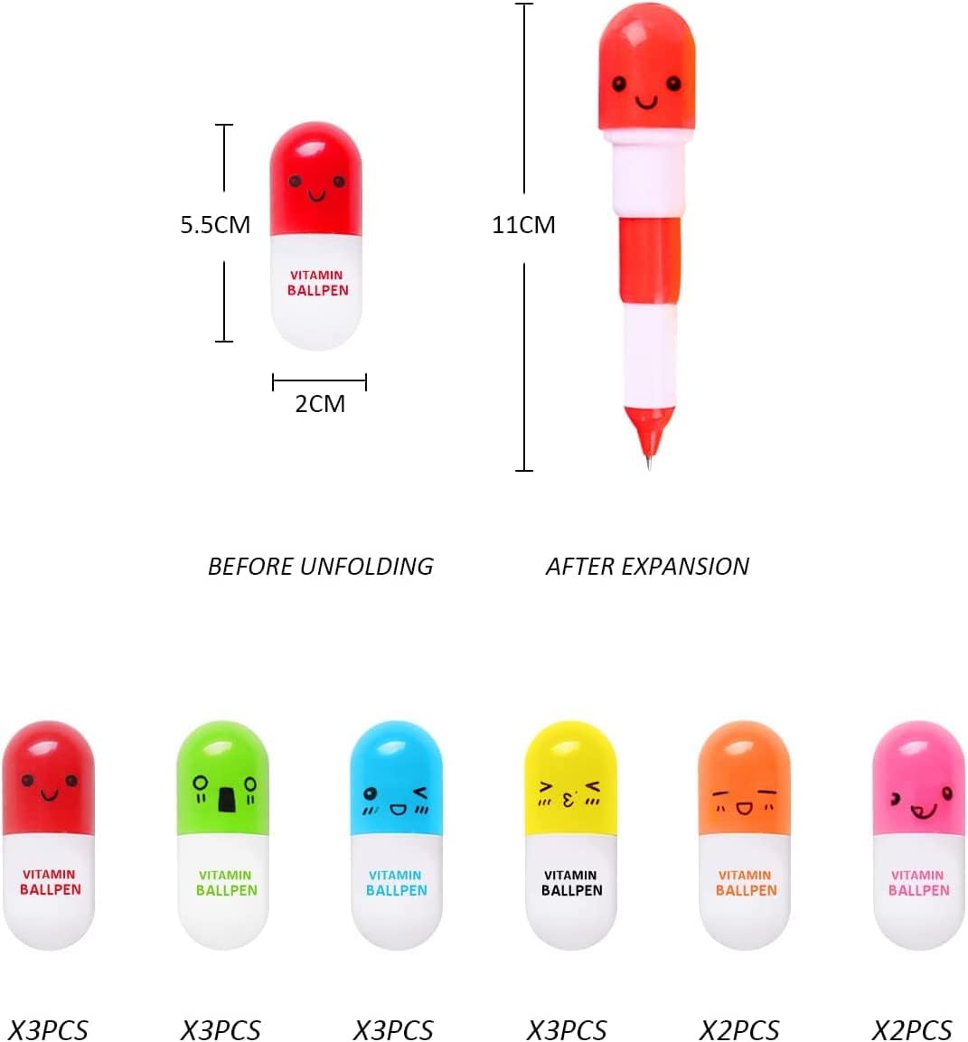 【36 Pezzi 6 Colori Diversi】: 1 confezione contiene 36 pezzi di 6 colori diversi (colore blu, arancione, giallo, rosso, rosa e verde), quantità e colore sufficienti per soddisfare esigenze diverse. È anche un giocattolo divertente per i bambini, che può aumentare l'immaginazione dei bambini e aumentare il loro interesse per l'apprendimento.Lodali e premiali per i loro sforzi o progressi. 【Design telescopico】: Queste simpatiche penne per pillole sono retrattili e compatte. Ha una lunghezza di estensione di 11 cm e una lunghezza di 6 x 2,5 cm quando è chiuso. Può essere messo in tasche, astucci, zaini e borse portaoggetti, così puoi registrare e registrare la tua vita quotidiana sempre e ovunque.Non solo adatte per studenti, ma anche conveniente scrittura per adulti. 【Materiale confortevole】: La penna è realizzata in plastica acrilica, che è comoda e delicata, forma innovativa e peso leggero. Non sentirà il peso in mano e non si sentirà stanco per un uso a lungo termine.La dimensione è moderata e facile da trasportare, proprio come le normali penne. 【Diverse Espressioni di Cartoni Animati】: L'aspetto è adorabile e ogni penna è stampata con un'espressione carina, che è davvero unica. I colori di ogni colore hanno espressioni diverse, rappresentano stati d'animo diversi, puoi scegliere in base al tuo umore. 【Mini penna a sfera】: Inchiostro blu, penna a sfera da 0,5 mm, scrittura morbida e linee chiare. Adatto per dipingere, segnare, scrivere su biglietti di auguri, scrapbooking, colorare, firmare, graffiti e decorare, ecc. La mini penna a sfera non può essere utilizzata solo come cancelleria per la casa, la scuola, l'ufficio o per le emergenze,ma anche un impressionante regalo di Pasqua, compleanno e Natale per la famiglia, gli amici e gli studenti.
