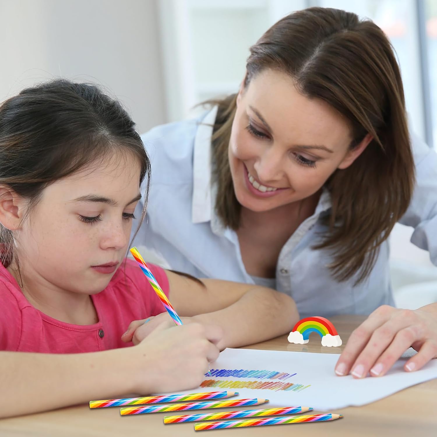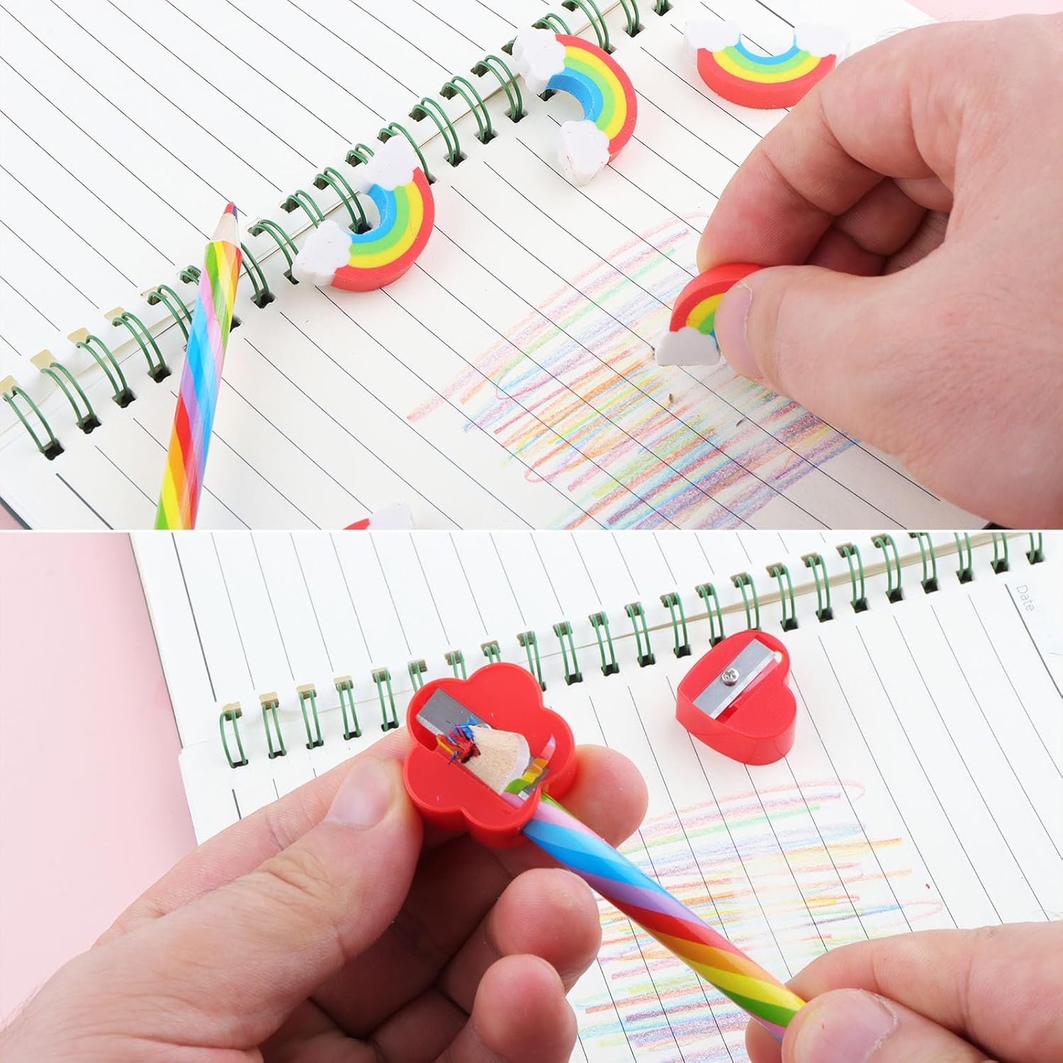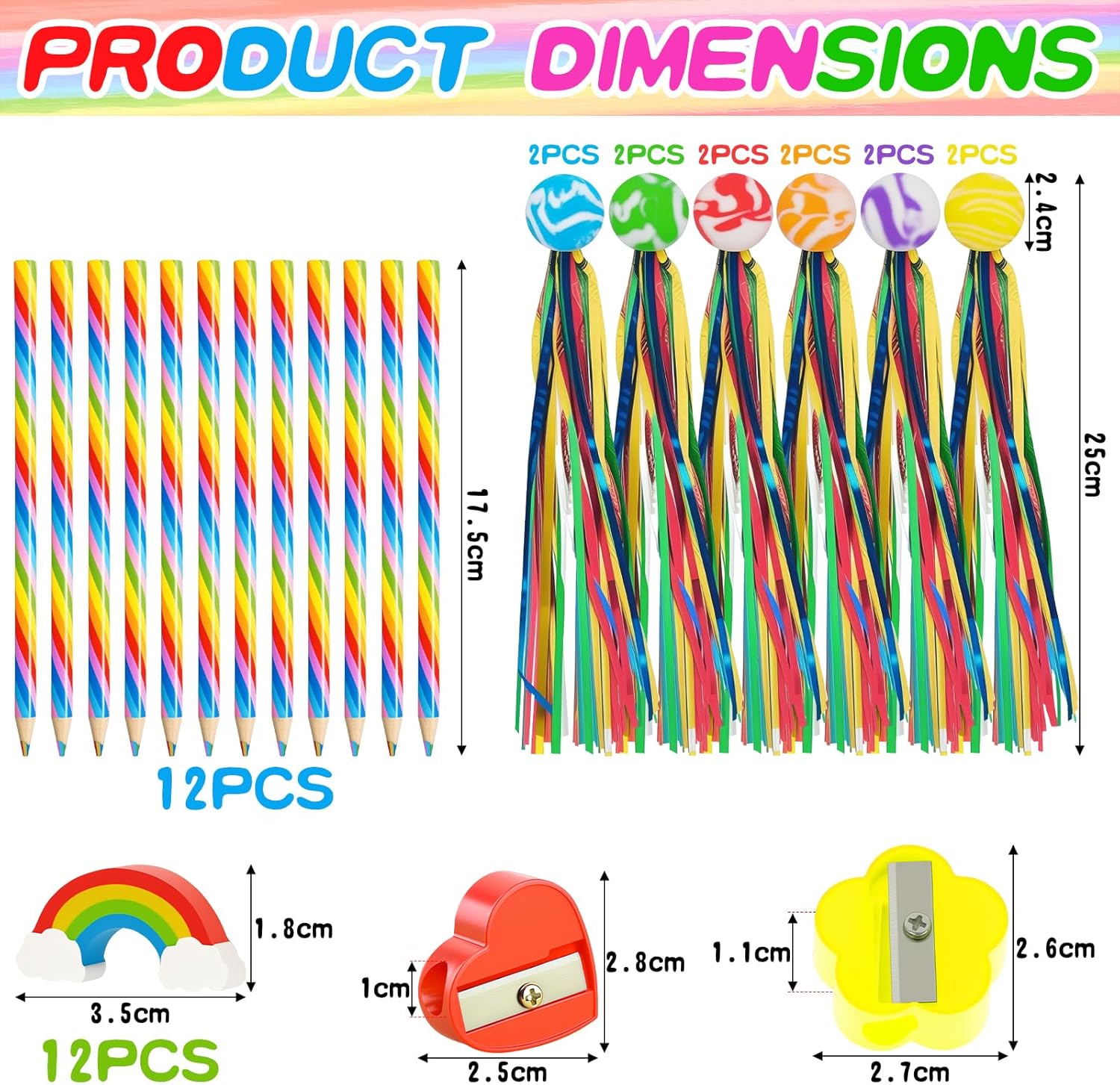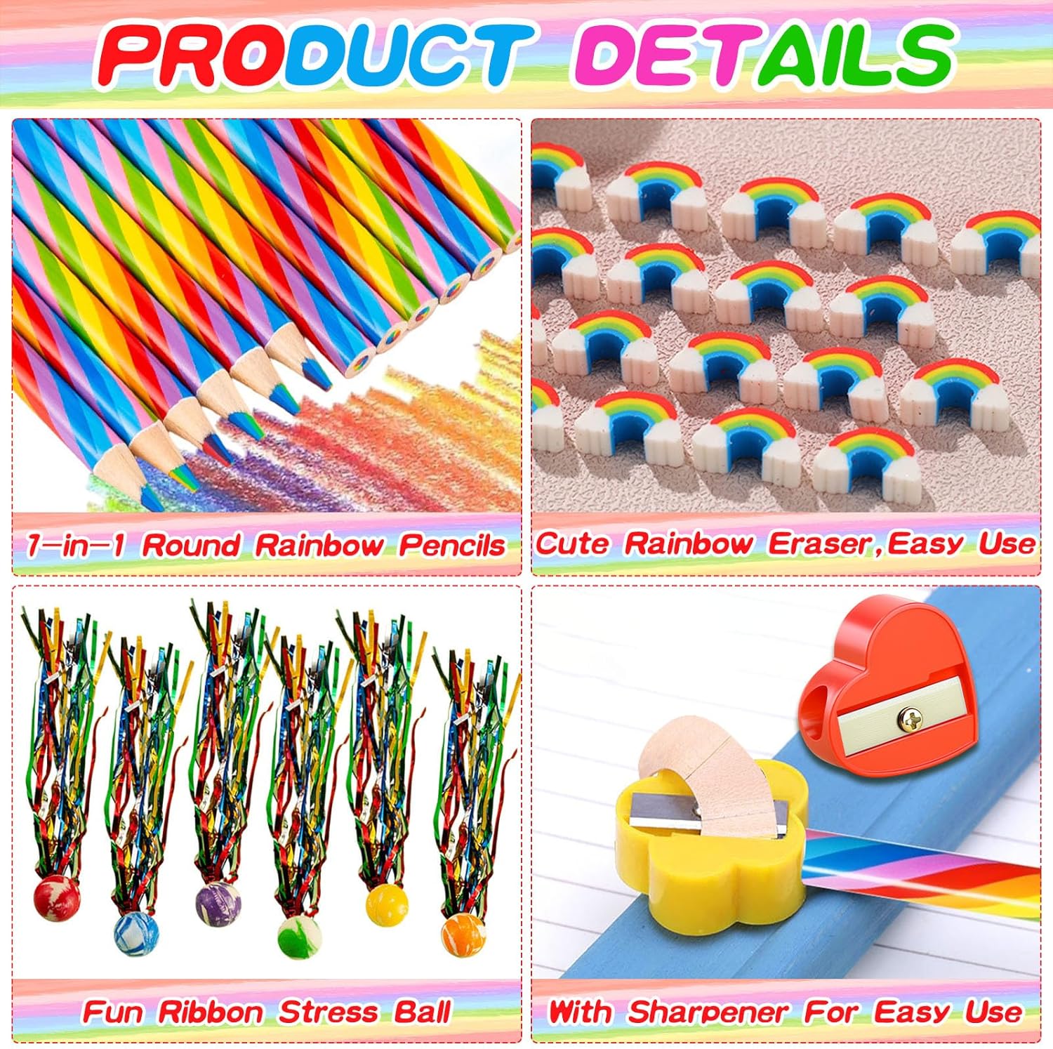 Matite arcobaleno 7 in 1: matite arcobaleno a 7 colori, arrotondate e comode da impugnare, che impediscono lo scivolamento. Una matita offre più colori con una transizione naturale, permettendo ai bambini di disegnare facilmente motivi colorati e scrivere parole in diversi colori. Questo permette ai bambini di sperimentare la magica fusione dei colori, ispirando l'esplorazione e la sperimentazione artistica e dicendo addio al disegno monotono. Giocattolo creativo: la palla rimbalzante arcobaleno è realizzata in gomma sicura e atossica, aggiungendo divertimento e funzionalità a questo set di penne arcobaleno. È il perfetto antistress per i bambini mentre fanno i compiti o disegnano. La sensazione di rimbalzo, i nastri svolazzanti e i colori vivaci migliorano la coordinazione occhio-mano, la percezione spaziale e la stimolazione sensoriale dei bambini, rendendolo un giocattolo ideale per combinare lavoro e tempo libero. Set completo: un set di matite arcobaleno include tutto l'essenziale, rendendolo un regalo creativo completo. La gomma arcobaleno è perfetta per correggere gli errori; la palla rimbalzante colorata è la compagna perfetta tra una sessione di studio e l'altra, un ottimo modo per ravvivare una festa e un ottimo strumento per allenare la coordinazione manuale; e i temperamatite a forma di fiore di prugno e cuore sono perfetti per temperare le matite quando diventano troppo corte. Ricordi meravigliosi: momenti creativi in famiglia, pittura su tavola, attività al chiuso per le giornate di pioggia, lavoretti interattivi genitore-figlio nel fine settimana. Perfetto per corsi d'arte all'asilo e a scuola, per imparare a colorare, per creazioni libere e per la pittura a tema. Perfetto come regalo arcobaleno alle feste di compleanno. Perfetto come parte delle decorazioni arcobaleno per le feste. Regalo ideale: questo set di penne arcobaleno soddisfa le esigenze di apprendimento e gioco dei bambini. Può essere utilizzato come regalo per feste di compleanno, per compleanni, per il ritorno a scuola, per la classe, come premio di classe, come regalo di laurea, come regalo di Natale, come premio per giochi di gruppo, come souvenir per feste di bambini, ecc.
