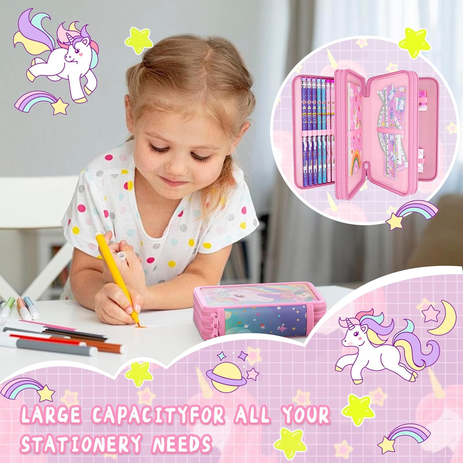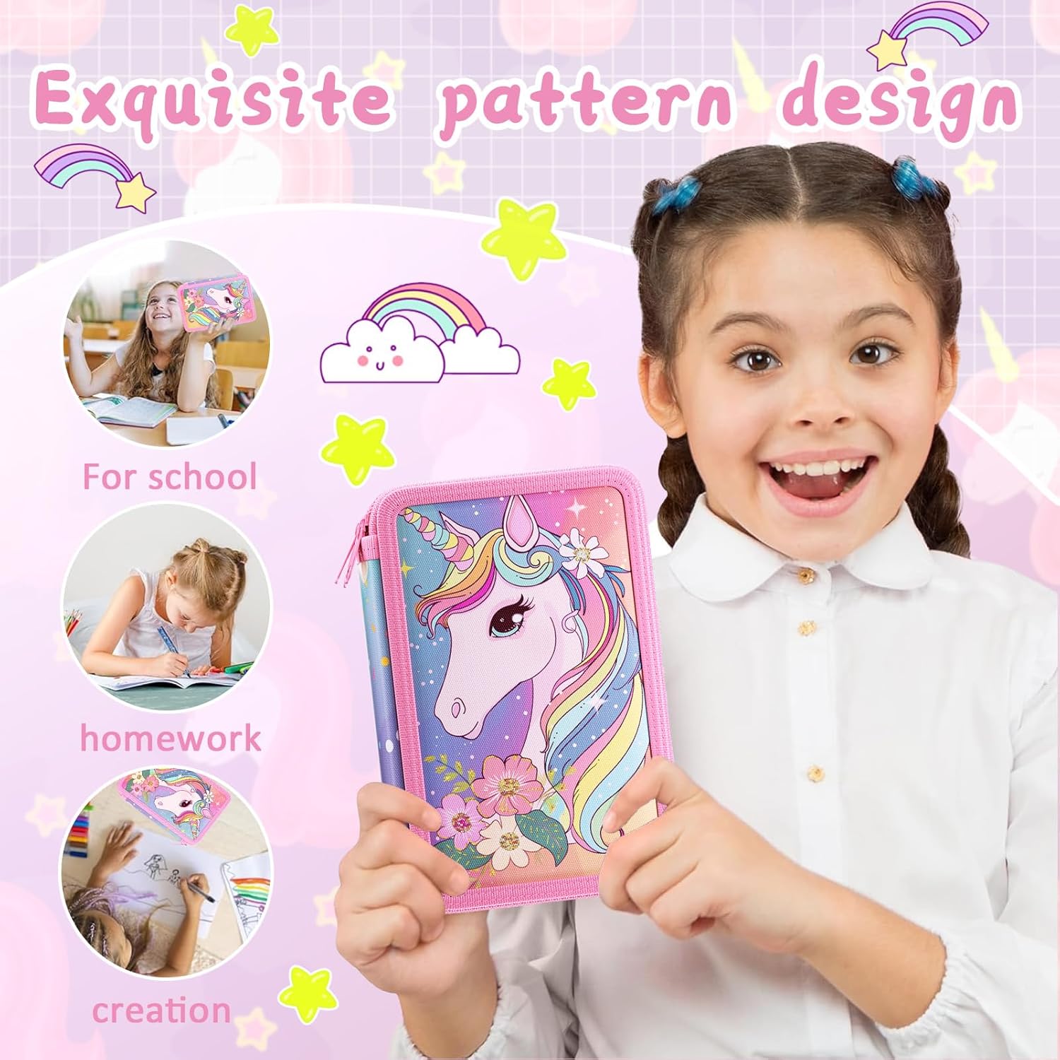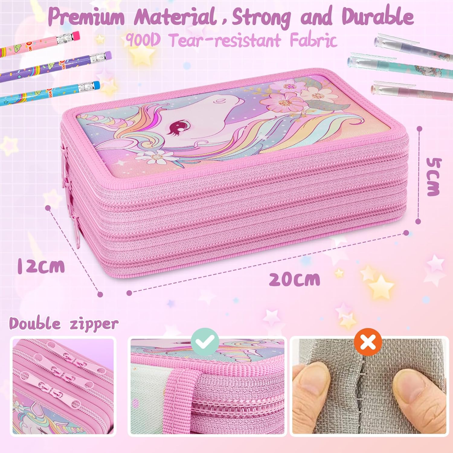 【Set Scuola Cancelleria】 Astuccio unicornoe Bambina 3 Scomparti Bambina,12 matite colorate, 9 penne ad acquerello,9 matite con motivo unicornoe,4 penne gel con fantasia unicornoe,Set righello acrilico da 4 pezzi,1 temperamatite a doppio foro, incluso quaderno e gomma con unicornoe, per garantire che la tua scrivania non sia più ingombrante! 【Design Unico】Gli articoli cancelleria con colori vivaci e design unici attirano spesso l'attenzione dei bambini e rendono il processo apprendimento più interessante. Un set materiale scolastico che piace a tuo figlio e che è utile può aumentare la sua autostima in una certa misura. 【Materiale Sicuro】 L'astuccio Unicorn Girl è realizzato in robusto tessuto poliestere con stampa alta qualità, sicuro, durevole e bello. Le robuste doppie cerniere mantengono al sicuro il tuo materiale scolastico 【Risparmia Tempo e Fatica】 Il materiale scolastico a tema unicornoe è accuratamente abbinato per incoraggiare i bambini a scrivere, disegnare e fare schizzi. Il materiale scolastico organizzato in modo ordinato può aiutarti a trovarlo rapidamente, ciò cui hai bisogno e a risparmiare tempo. Aiuta a sviluppare buone abitudini studio 【Servizio Eccellente】 Questo astuccio renderà sicuramente felici i fan degli unicorni nella tua vita, se trovi che il prodotto manca o è danneggiato, puoi contattarmi in qualsiasi momento e ti darò una soluzione soddisfacente