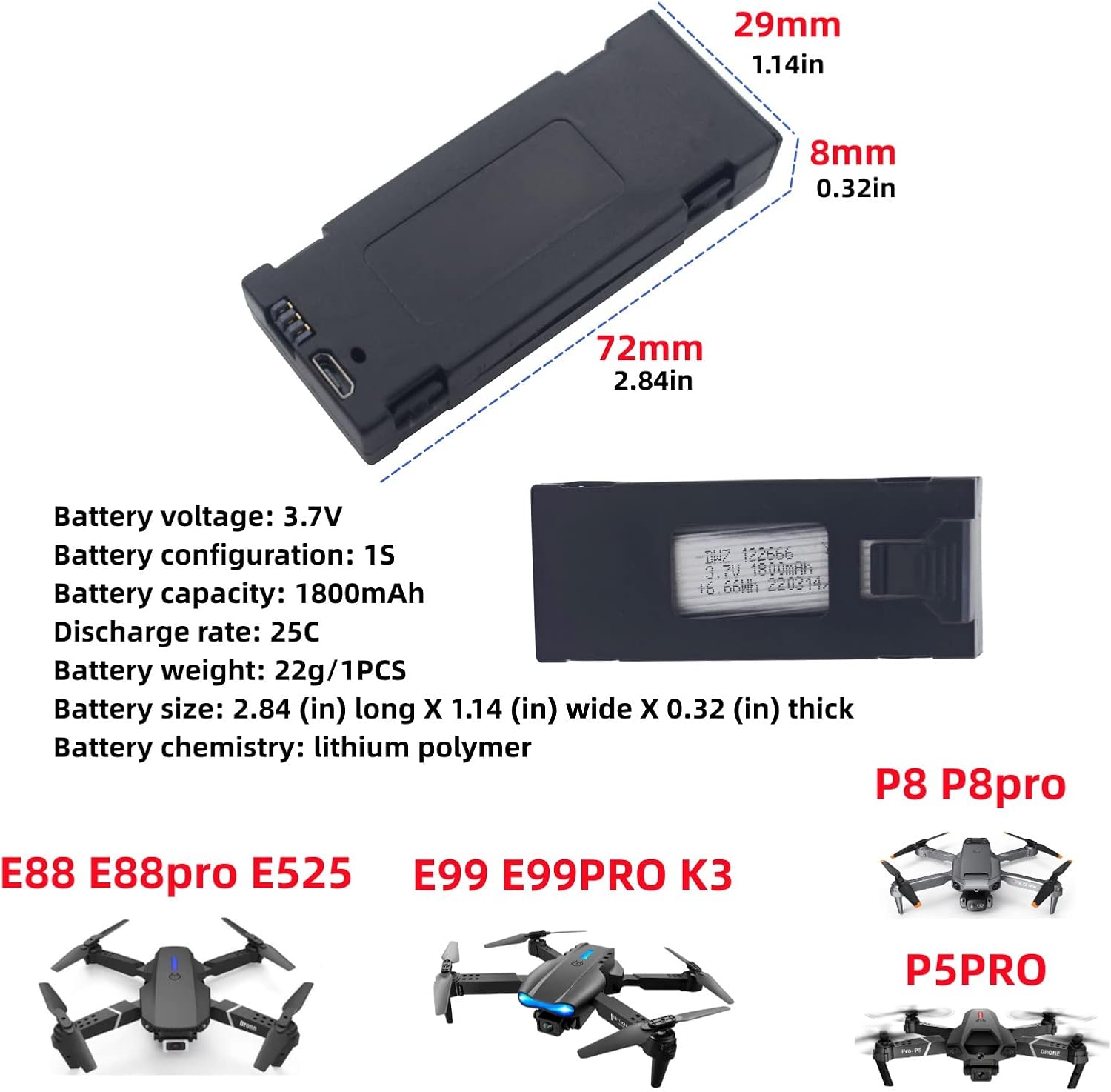 【Compatibile】 La batteria al litio da 3,7V 1800mah è per il drone E88 E88PRO E88MAX E525 E99 E99PRO P1 P5PRO K3 S1 P8. 【Durevole】 Tutte le batterie hanno superato severi test di qualità per garantire un uso a lungo termine. 【Sicurezza】La batteria ha un meccanismo di protezione incorporato che può essere caricato e utilizzato in modo sicuro. 【Qualità】La batteria è realizzata con materiali di alta qualità, più durevoli, pratici e non facilmente danneggiabili. 【Lista di imballaggio】3PCS 1800mAh batteria al litio.