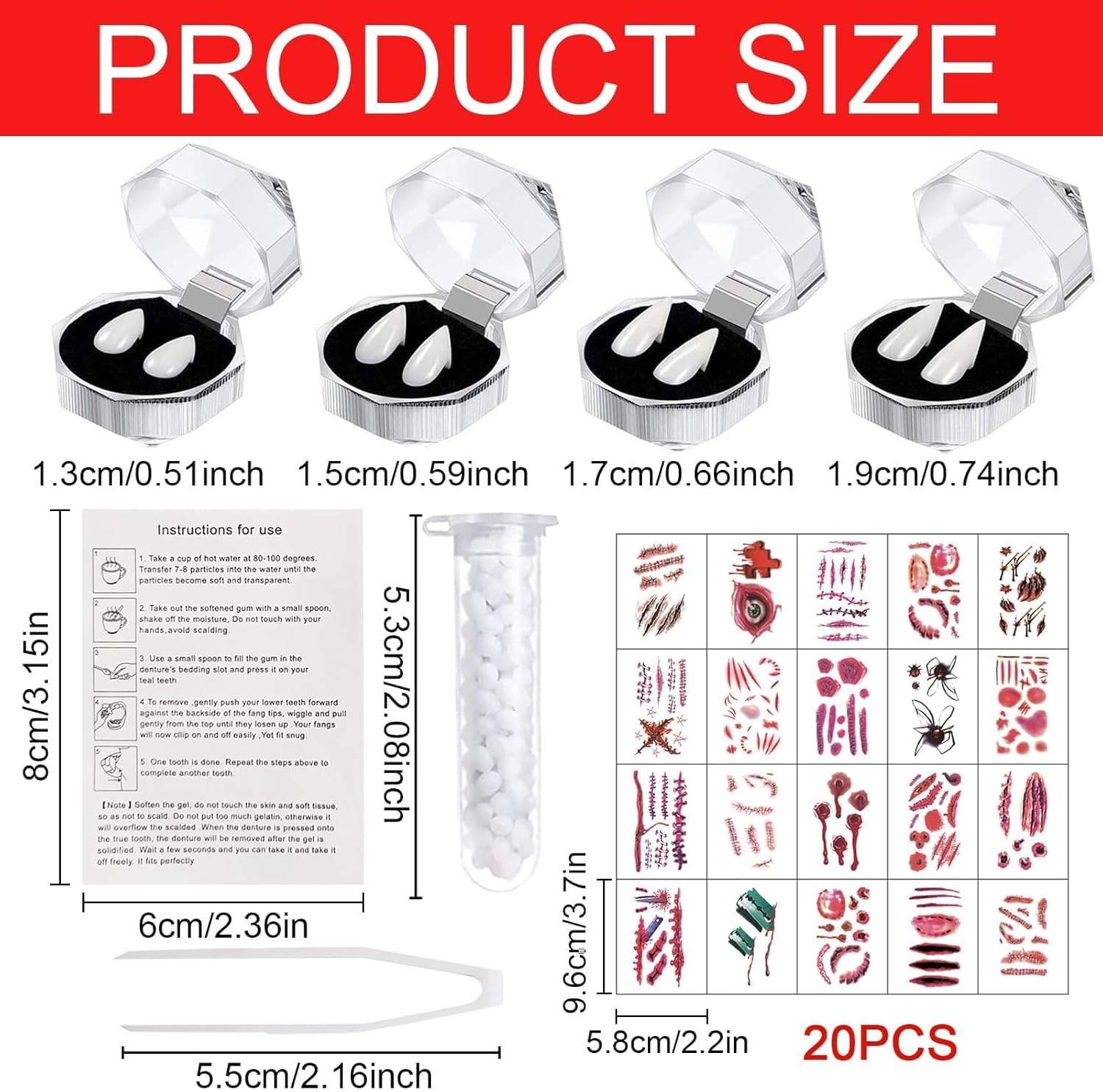 Denti da vampiro: questi denti da vampiro sono realizzati in resina igienica di alta qualità e stampati ad iniezione. Sono atossici, sicuri e realistici. Sciacquare abbondantemente con acqua tiepida e sapone prima dell'uso. Sono insapore, rispettosi dell'ambiente e sostenibili. ❅ Denti da vampiro di Halloween: riceverai 4 paia di denti da vampiro di diverse dimensioni (13 mm, 15 mm, 17 mm, 19 mm) e 1 tubo di colla solida (usa e getta). La quantità sufficiente ti permette di supportare idealmente il tuo partito. Perfetto per giochi di ruolo di Halloween come vampiri, lupi mannari o come decorazione pasquale. ️ Denti da vampiro: riscalda le palline adesive dei denti finché non diventano trasparenti (è possibile anche l'acqua calda), estraili e premili sui denti per creare una forma. Quindi prendi il dente artificiale corrispondente e premi la colla per un po' (le perle si raffreddano molto velocemente, quindi devi agire rapidamente). Denti da vampiro per adulti e bambini: questi denti da vampiro sono perfetti per i giochi di ruolo e possono essere usati come oggetti di scena per vampiri, lupi mannari, zombi e altri costumi. Sono perfetti per feste a tema Halloween o come regalo divertente per i tuoi amici o familiari. Denti da vampiro demoniaco: la scatola trasparente protegge i tuoi denti da vampiro di Halloween da polvere, sporco e danni. In questo modo rimangono in buone condizioni più a lungo e sono pronti per l'uso in qualsiasi momento. Non dovrai più cercare i tuoi morsi da vampiro: sono sempre conservati al sicuro nella scatola.