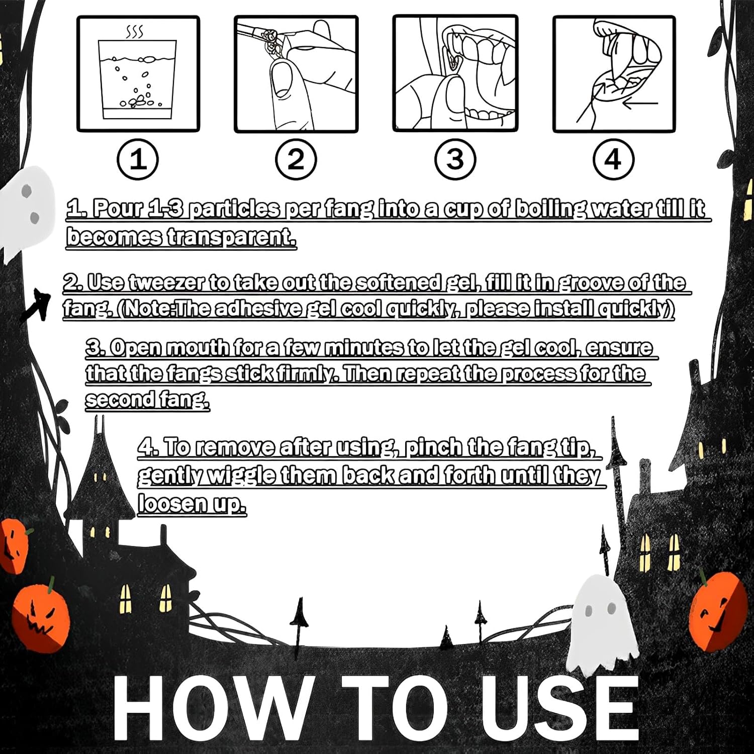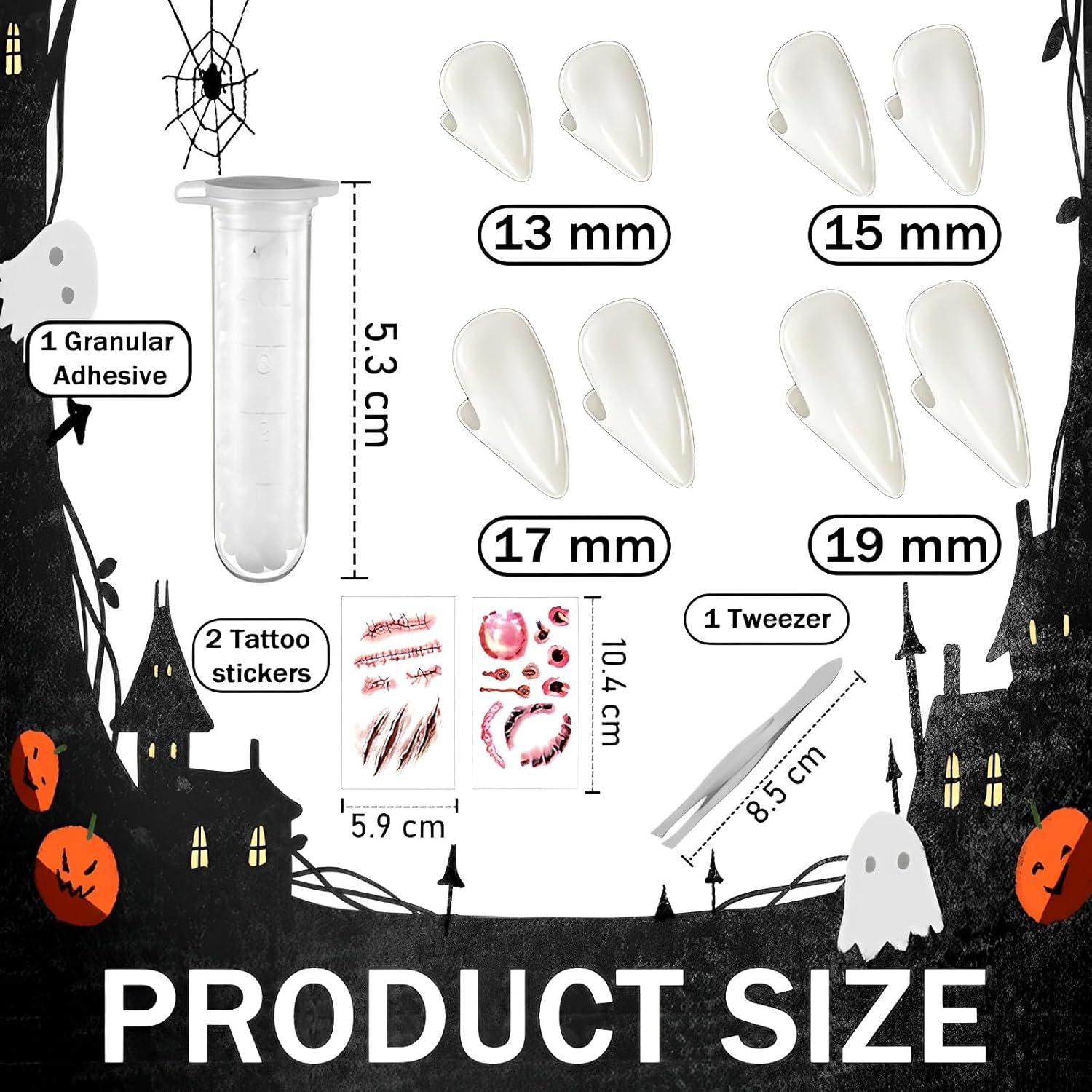 Dimensioni opzionali per denti personalizzati: ci sono 4 taglie disponibili in questa protesi horror, 13 mm, 15 mm, 17 mm, 19 mm, per soddisfare le vostre diverse esigenze di cosplay. Materiale: questi denti da vampiro sono realizzati in resina composita dentale, atossica, insapore e igienica, sicura per i denti e hanno un aspetto realistico. dentatura cattura è molto resistente e può essere riutilizzato. Facile da usare: riscaldare le perline con acqua tiepida fino a quando non sono trasparenti, poi estrarle e premere la protesi per formare una forma, quindi mettere la protesi sul dente e premere con le mani per circa 30 secondi. (Le perle si raffreddano molto rapidamente, quindi è necessario elaborarle rapidamente) Varie applicazioni: è ideale per qualsiasi cosplay, feste in costume di Halloween. Utilizzato come vampiri, lupi di lupo, zombi e accessori per costume cosplay. Aumenta il tuo fascino e ti aiuta a diventare il focus della festa. Il regalo giusto: i denti da vampiro sono un ottimo regalo di Halloween che chiunque può usare. Le nostre protesi realistiche per vampiri attireranno sicuramente l'attenzione.