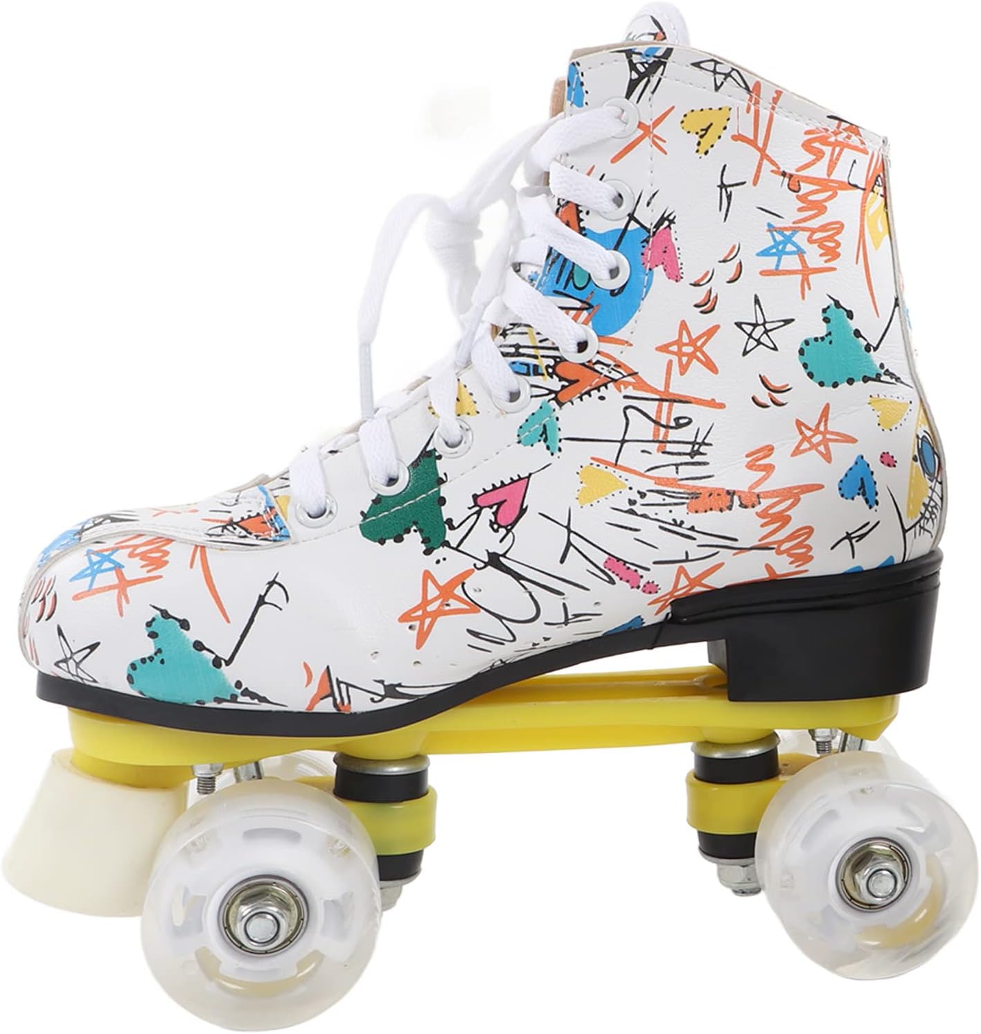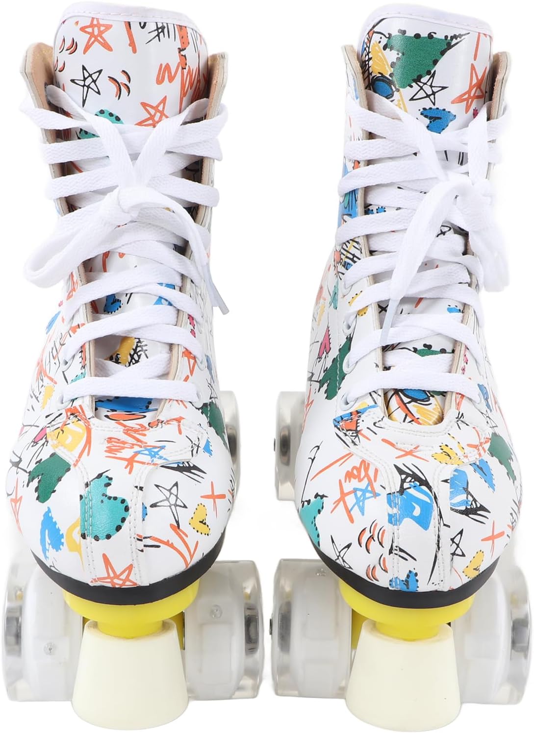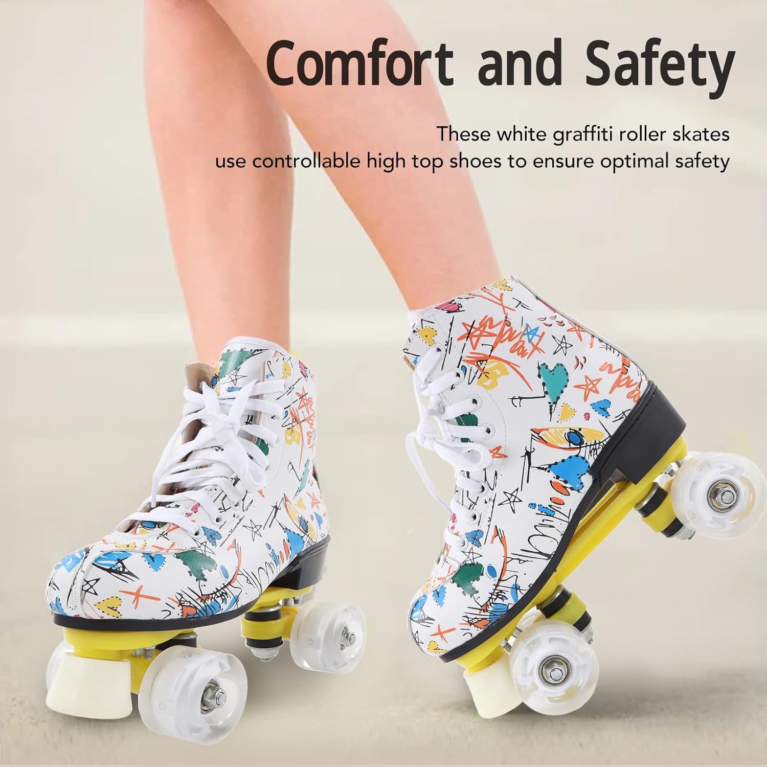 Ampie applicazioni: i pattini a rotelle dai colori vivaci sono il per bambini, ragazzi, ragazze e fidanzati, fidanzate o famiglia. È anche una scelta ideale per il pattinaggio indoor e outdoor. Colonna di supporto anteriore: c'è una colonna di supporto davanti, molto adatta ai principianti. Può mantenere meglio il controllo e la frenata rapida. Questa struttura garantisce che la staffa non venga danneggiata. Comfort e sicurezza: questi pattini a rotelle graffiti utilizzano scarpe alte controllabili per garantire una sicurezza ottimale, mentre i lacci delle scarpe premium offrono la massima protezione per garantire comfort e sicurezza del piede. Traspirabilità interna: la traspirabilità interna dei pattini a rotelle a doppia può aiutare i tuoi piedi a dissipare rapidamente il calore, evitare l'odore del piede e prevenire il sudore, permettendoti di goderti appieno lo scivolamento. Materiale robusto e durevole: i pattini a rotelle sono dotati di robusti pattini a quattro ruote realizzati con materiali stampati durevoli, che possono fornire prestazioni di pattinaggio sicure e affidabili. Le ruote lucide ti rendono più fresco quando pattini.