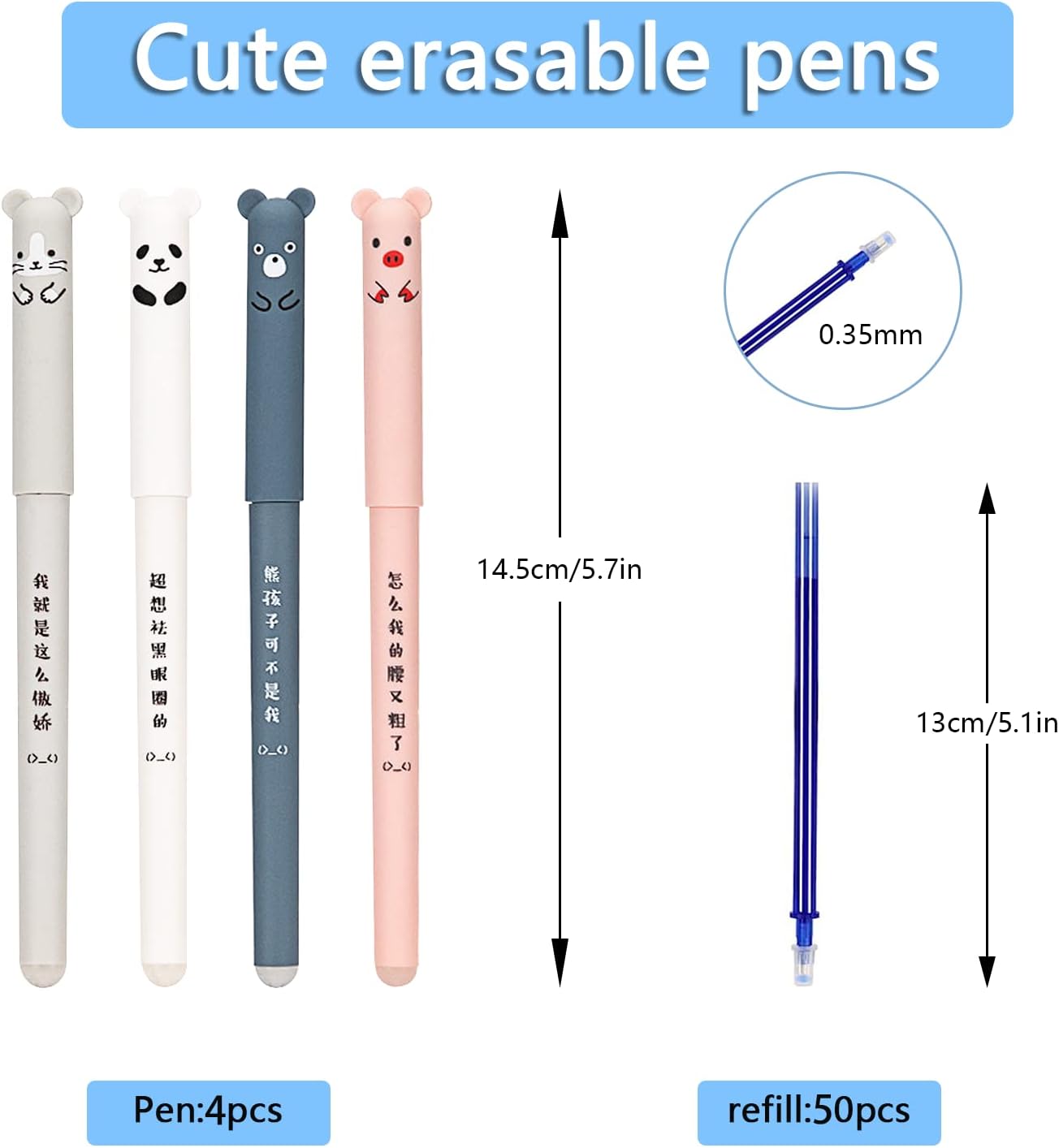 📝SCRIVERE CANCELLABILE E RIPETIBILE: l'estremità di ogni penne cancellabili bambini è una gomma invisibile. Con la penna cancellabile blu non dovrai più preoccuparti degli errori di scrittura, l'inchiostro scompare con l'attrito della gomma e non lascia residui sulla carta. 📝DISEGNO DEL FUMETTO: I penna gel animale cappucci delle penne sono progettati con forme di animali dei cartoni animati come orso, panda, maiale e gatto. Ci sono 4 diversi colori per i cappucci delle penne: bianco, grigio chiaro, rosa e blu. Diverse forme di cartoni animati e diversi colori per la tua scelta. 📝ESPERIENZA DI SCRITTURA FLUIDA: Il penne animali guscio della penna è realizzato in plastica, resistente e non facile da rompere, la penne cancellabili animali è facile da impugnare, penna gel da 0,35 mm, flusso di inchiostro stabile, scarico uniforme dell'inchiostro, scrittura fluida, nessuna perdita o sbavatura durante la scrittura. 📝APPLICAZIONE: La simpatica penne con animali è adatta per prendere appunti, firmare, scrivere compiti, disegnare e altro ancora. Utilizzabili a scuola, in ufficio e a casa, i simpatici set di penne gel cancellabili diventeranno un inseparabile cancelleria pratica per il tuo lavoro e studio. 📝REGALO UNICO: Penne gel nere adatto a scuola, ufficio, casa, ecc. La penne nere gel del fumetto è il regalo perfetto per bambini, studenti, familiari, amici e colleghi per feste per bbiamni, compleanni, l'inizio dell'anno scolastico e Natale.