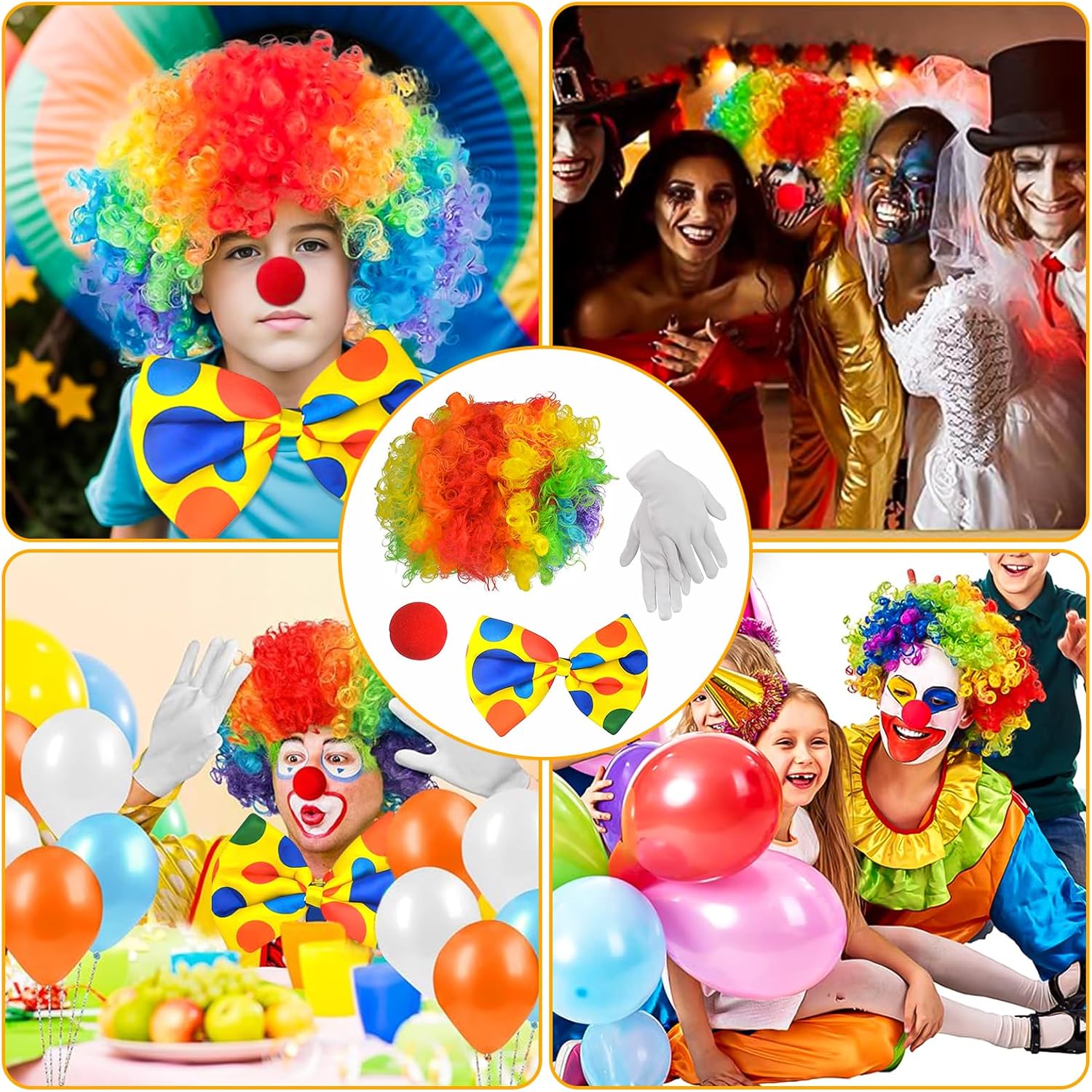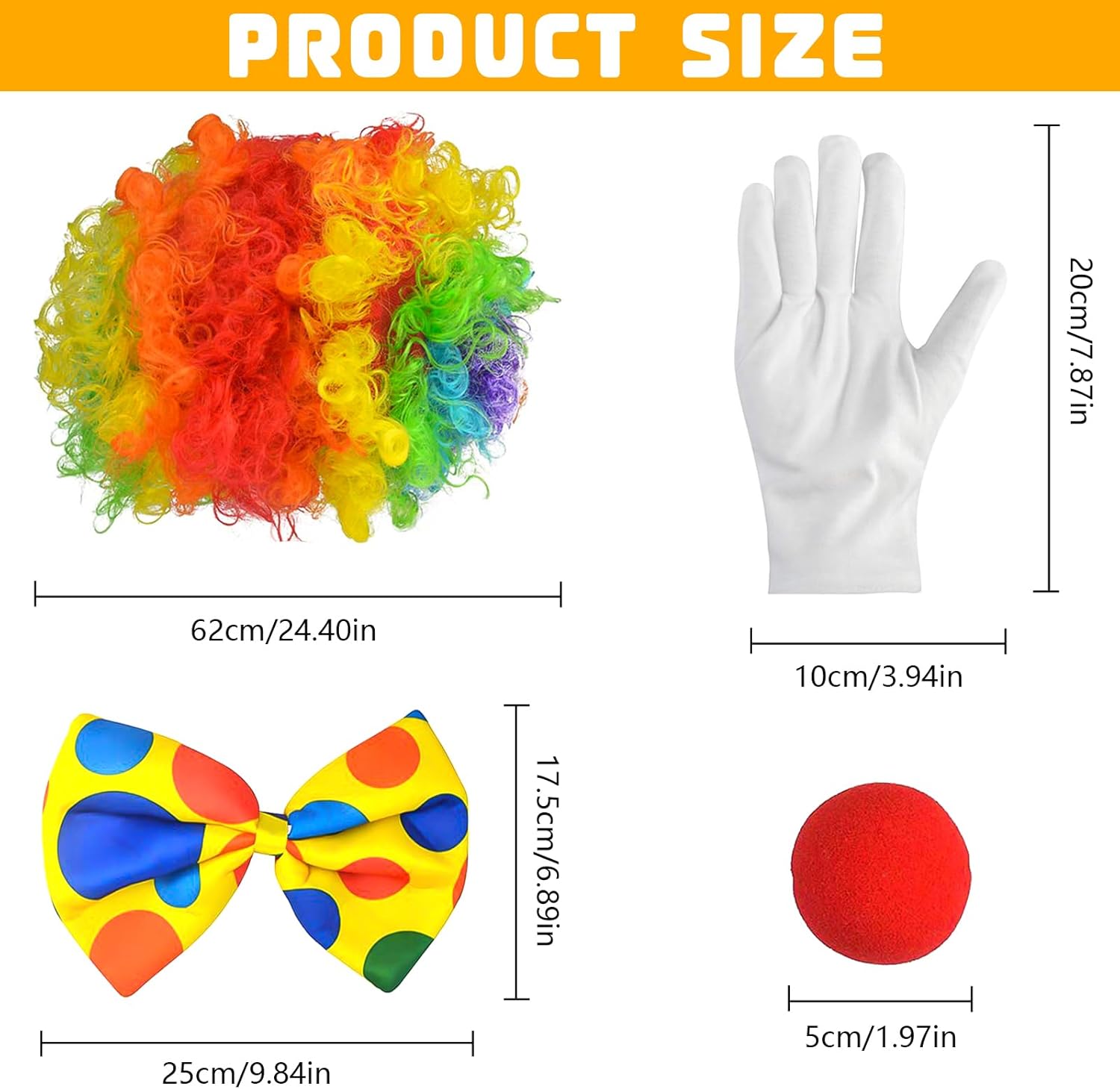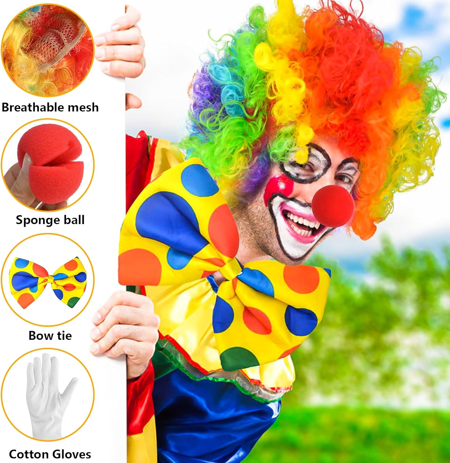 【Materiale di Alta Qualità】: Queste Costume Clown Adulto per bambini sono realizzate in fibra sintetica, hanno una consistenza morbida, Sono facili da indossare e hanno colori vivaci, Indossare il costume da clown ti farà risaltare alla festa, Il papillon da clown e le cravatte sono realizzate in raso e riempite di spugna per dargli la dimensione e la forma necessarie per creare il perfetto costume da clown. 【Set di Accessori per Clown】: Accessori per Costumi da Clown contiene 4 Accessori per Clown, Tra cui 1 parrucca colorata da clown, 1 paio di guanti da clown bianchi, 1 naso da clown rosso, 1 Papillon da Clown, abbastanza costumi disponibili. le tue esigenze e questo costume da clown è dimensionato per adattarsi alla maggior parte degli adulti e dei bambini. 【Design da Clown】: Gli Costume Pagliaccio con Colori Vivaci, secondo le caratteristiche del personaggio del Clown. Colori e motivi vivaci ti fanno brillare alla festa e donano al tuo costume un'atmosfera allegra, Adatta a tutti i tipi di feste o vacanze. 【Cosplay】: Questa parrucca Pagliaccio, adatta alla maggior parte delle dimensioni della testa, Facile da indossare, Adatta sia a uomini che a donne, Puoi andare a qualsiasi festa, Creare un'atmosfera unica ed essere il punto culminante della tua personalità. 【Ampia Gamma di Applicazioni】: Vestito Clown Adulto Adatto per la maggior parte delle occasioni, come Halloween, accessori per costumi di carnevale o da festa, ecc, Adatto per la maggior parte delle donne, Ragazze e bambini, Adatto anche a persone che organizzano feste di ruolo per rendersi più attraenti, Crea effetti scenici emozionanti.