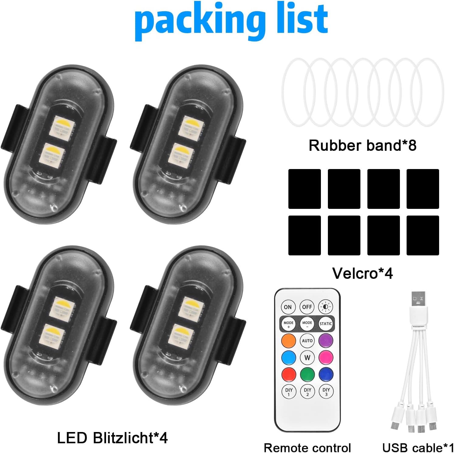 Modalità luce a 7 colori: bianco, rosso, verde, blu, giallo, viola, azzurro. Modalità di regolazione: flash, flash lento. Un modo più cool di viaggiare. È possibile modificare facilmente il colore e la modalità del flash LED tramite il telecomando. Inoltre, il flash ha una funzione personalizzata memorizzabile che consente di impostare combinazioni di modalità comuni in base alle proprie abitudini di utilizzo. Durata della batteria efficiente: ogni flash è dotato di una batteria da 110 mAh. Può essere caricato rapidamente tramite una porta USB e completamente caricato entro un'ora. In modalità di illuminazione continua, ha una durata della batteria più lunga: può funzionare per 200 ore a bassa luminosità, 120 ore a luminosità media e 60 ore ad alta luminosità, quindi soddisfare i requisiti di lunga durata. Impermeabile IP65: il nostro flash è stato testato per l'acqua. Non preoccuparti che le luci si danneggino durante la guida sotto la pioggia. Sono adatti a tutte le condizioni atmosferiche, ma si prega di non lasciarli in acqua troppo a lungo. Proteggi il tuo flash da forti ammollo per garantirne la durata. Goditi la sicurezza e la visibilità che offrono senza preoccuparti di pioggia o spruzzi d'acqua. Facile da usare: il design leggero e compatto è comodo per il trasporto, quindi puoi portarlo con te. Due pratici metodi di montaggio: chiusura in velcro e anello in gomma. I diodi multicolori di alta qualità ad alta luminosità possono migliorare gli avvisi di guida senza doversi preoccupare di incidenti. Il flash ricaricabile può aiutarti a identificarti di notte o nella nebbia per garantire la sicurezza. Ampia applicazione: le luci anti-collisione sono adatte per auto, moto, droni, skateboard, campeggio, pesca, escursioni, situazioni di emergenza per camion, ecc. In caso di illuminazione insufficiente, può fungere da luce notturna o luce di avvertimento e fornire illuminazione e allarme per garantire la sicurezza di se stessi e degli altri.