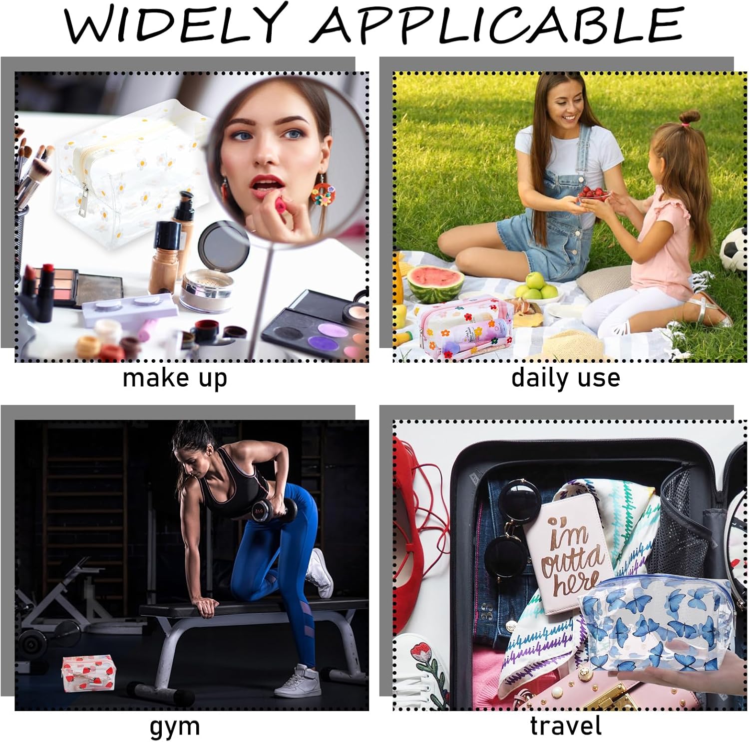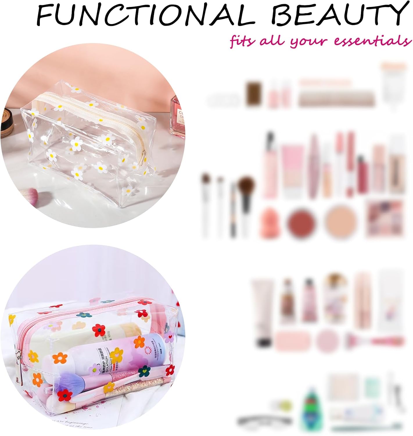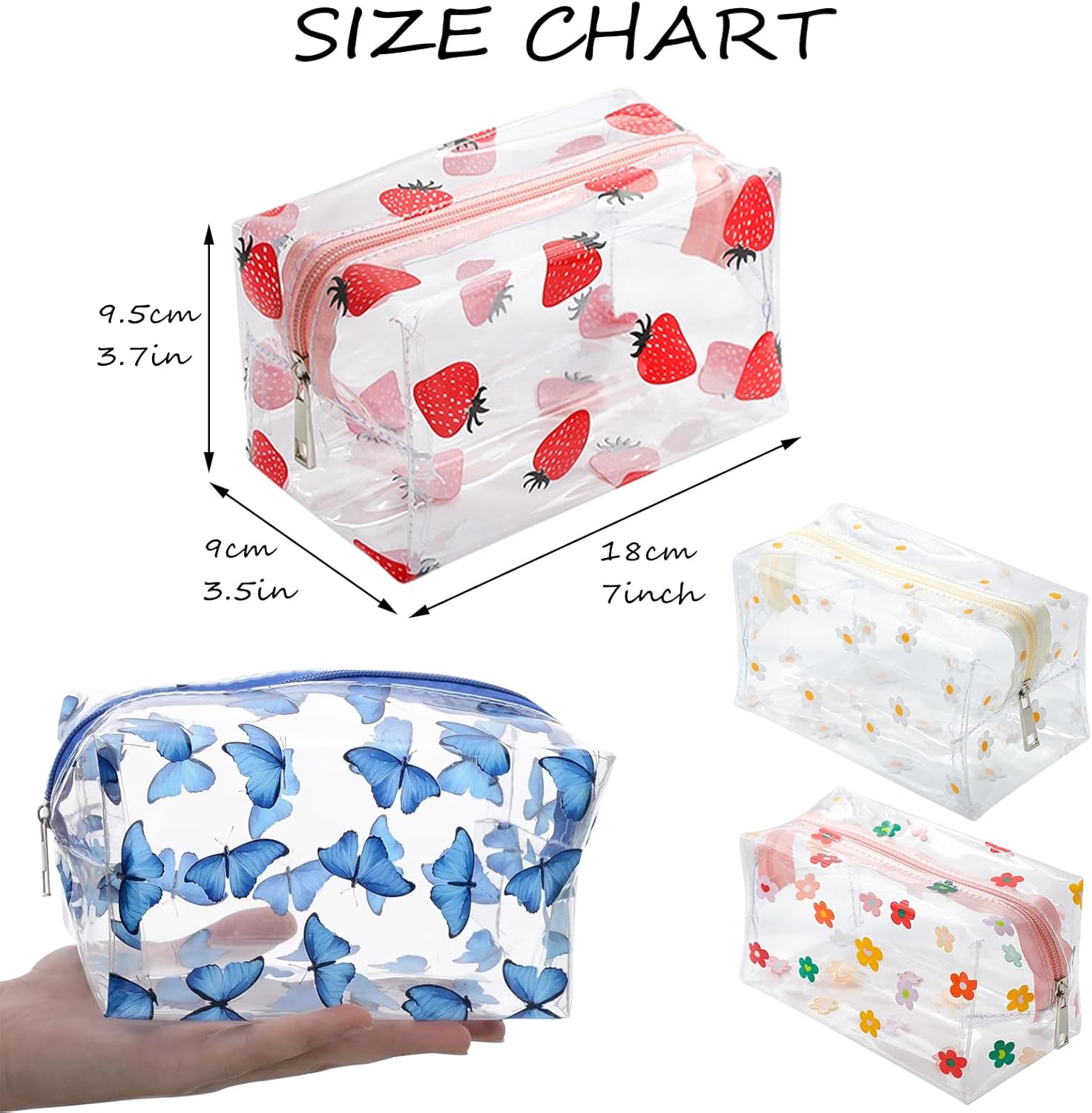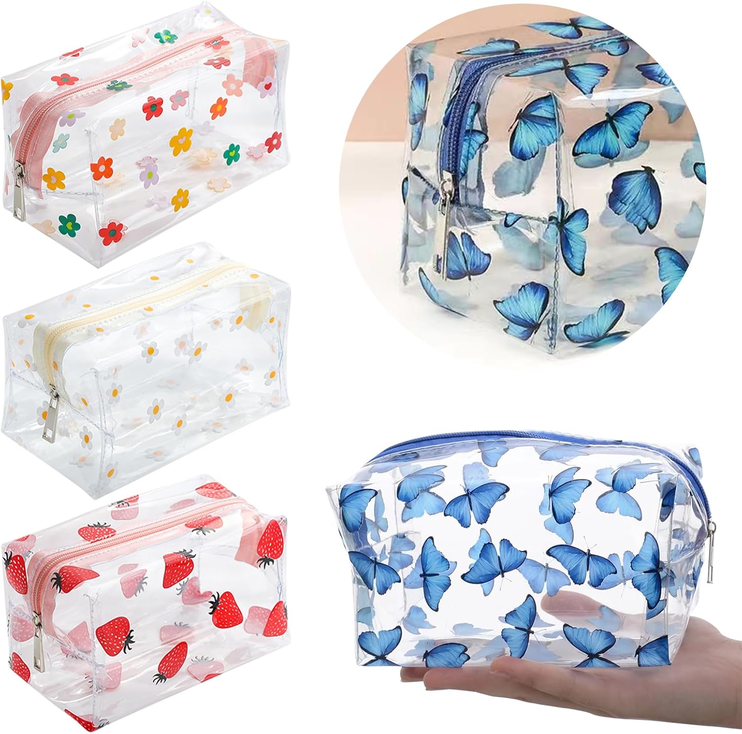 【Pochette Trasparente】Otterrai 4 pacchetti trasparenti chiari con diversi progetti di pattern per soddisfare le tue varie esigenze. Taglia 9 x 18 x 9,5 cm, dandoti un sacco di spazio per i tuoi cosmetici e articoli da bagno per mantenerli organizzati. 【Design Trasparente】La borsa per il trucco utilizza un design trasparente unico, mentre la decorazione di fiori e farfalle e fragole rende tutto elegante e carino. La trousse da toilette trasparente ti permette di trovare facilmente gli oggetti che ti servono. 【Cerniera Robusta】Ogni pochette trucchi è dotato di cerniere scorrevoli e resistenti, che si aprono e chiudono con fluidità e sicurezza. Le estremità rinforzate prevengono lo sgancio del cursore, garantendo che i tuoi oggetti rimangano al loro posto. 【Qualità Premium】I nostri sacchetti cosmetici (custodie a matita) sono realizzate in PVC di alta qualità, che è resistente, morbido, impermeabile e non facile da deformarsi, possono essere messi su molti cosmetici o altri piccoli oggetti. 【Miglior Regalo】Regalo perfetto per ogni ricorrenza! Che sia per Natale, un compleanno o la Festa della Donna, questa elegante trousse è il modo più raffinato per dire 'grazie' alle donne speciali nella tua vita.